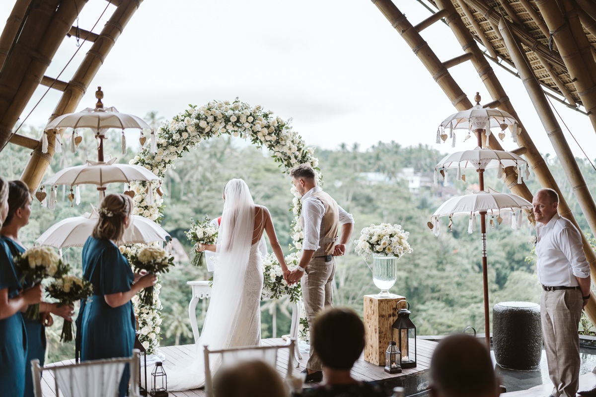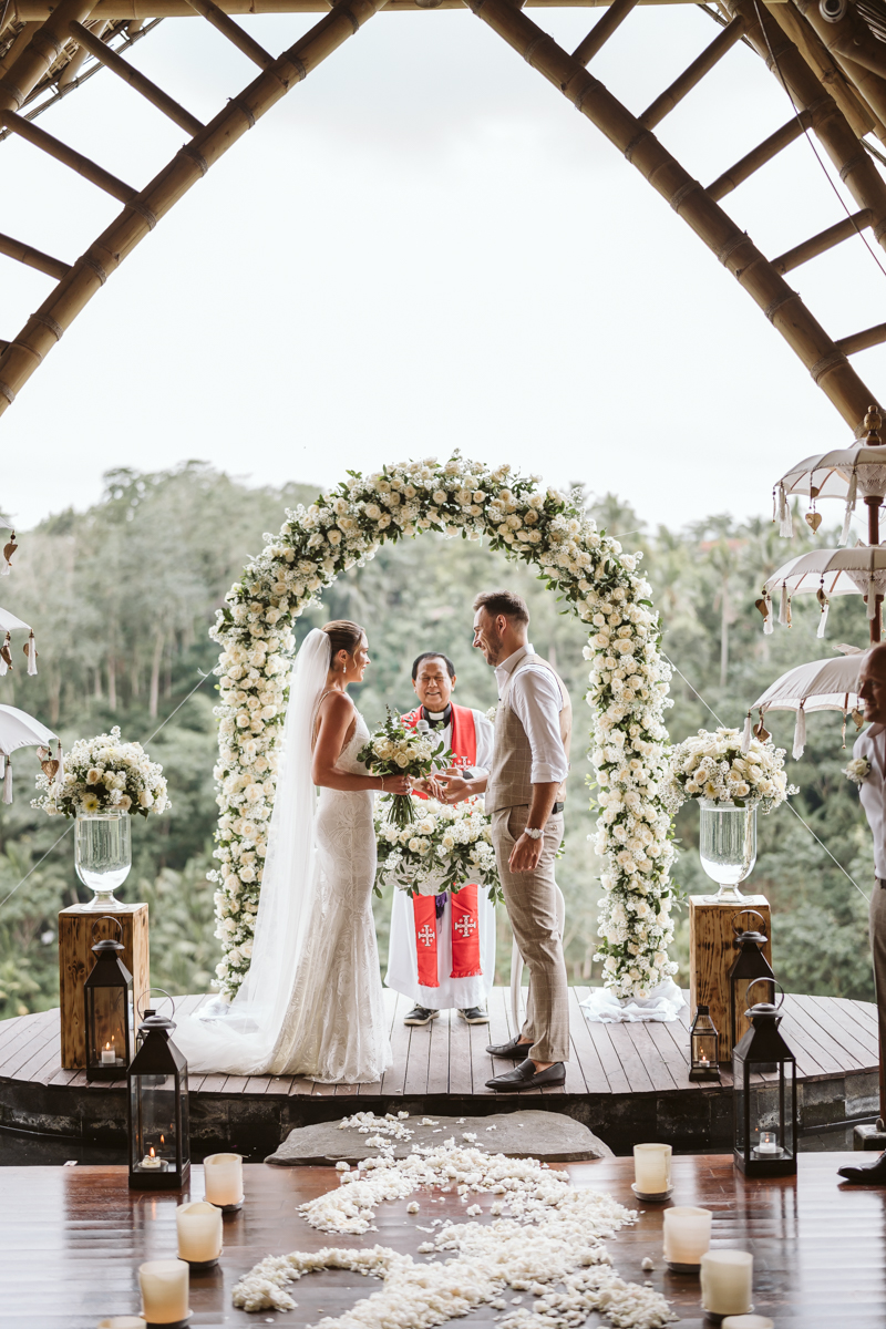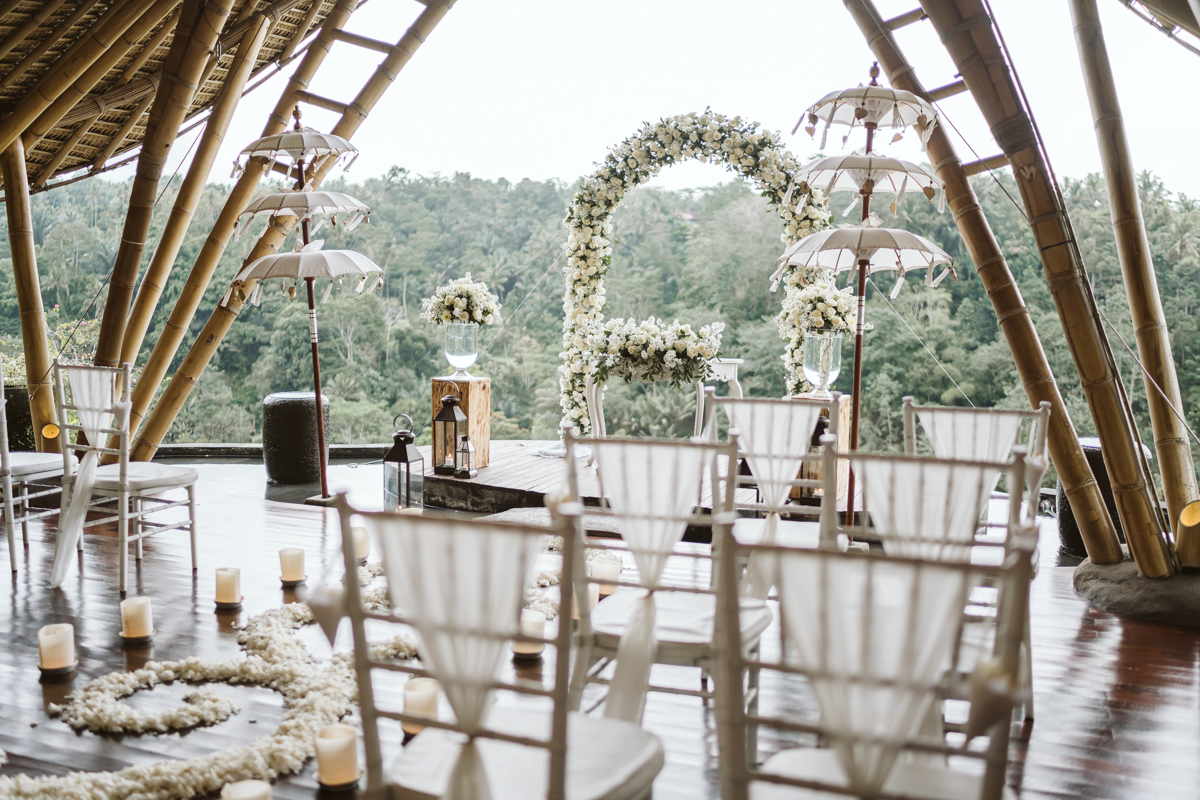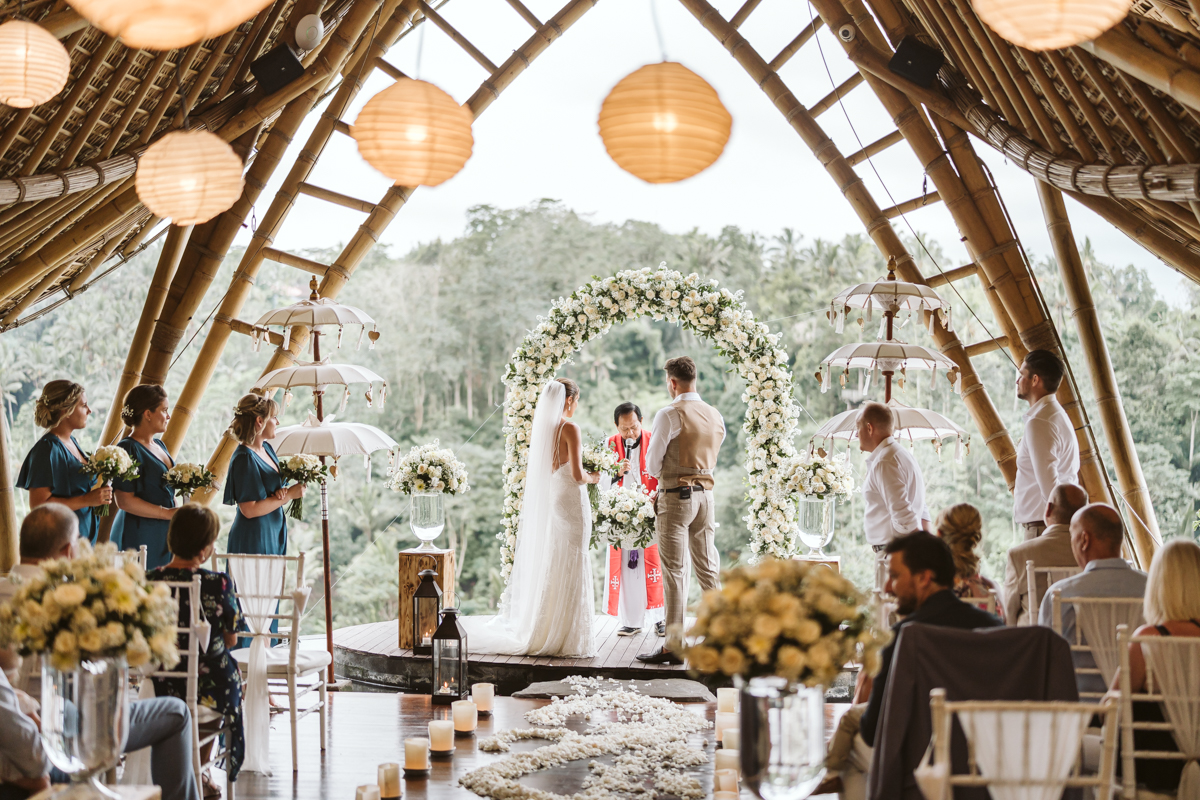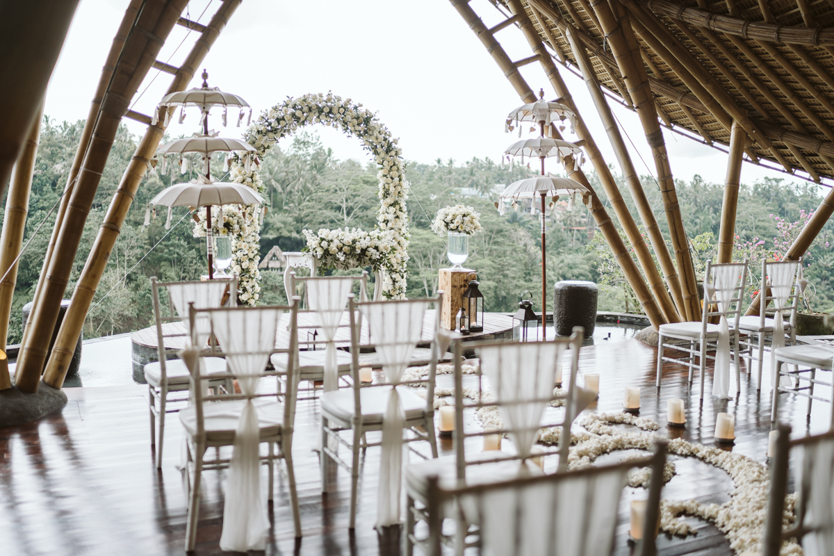 Le mariage s’est déroulé dans un superbe complexe hôtelier niché au cœur des rizières d’Ubud. Le lieu était entouré d’une jungle d’un vert émeraude, avec la rivière Ayung qui coulait doucement à proximité. Le site de la cérémonie était un pavillon en bambou pittoresque orné de offrant une vue panoramique sur le paysage environnant.