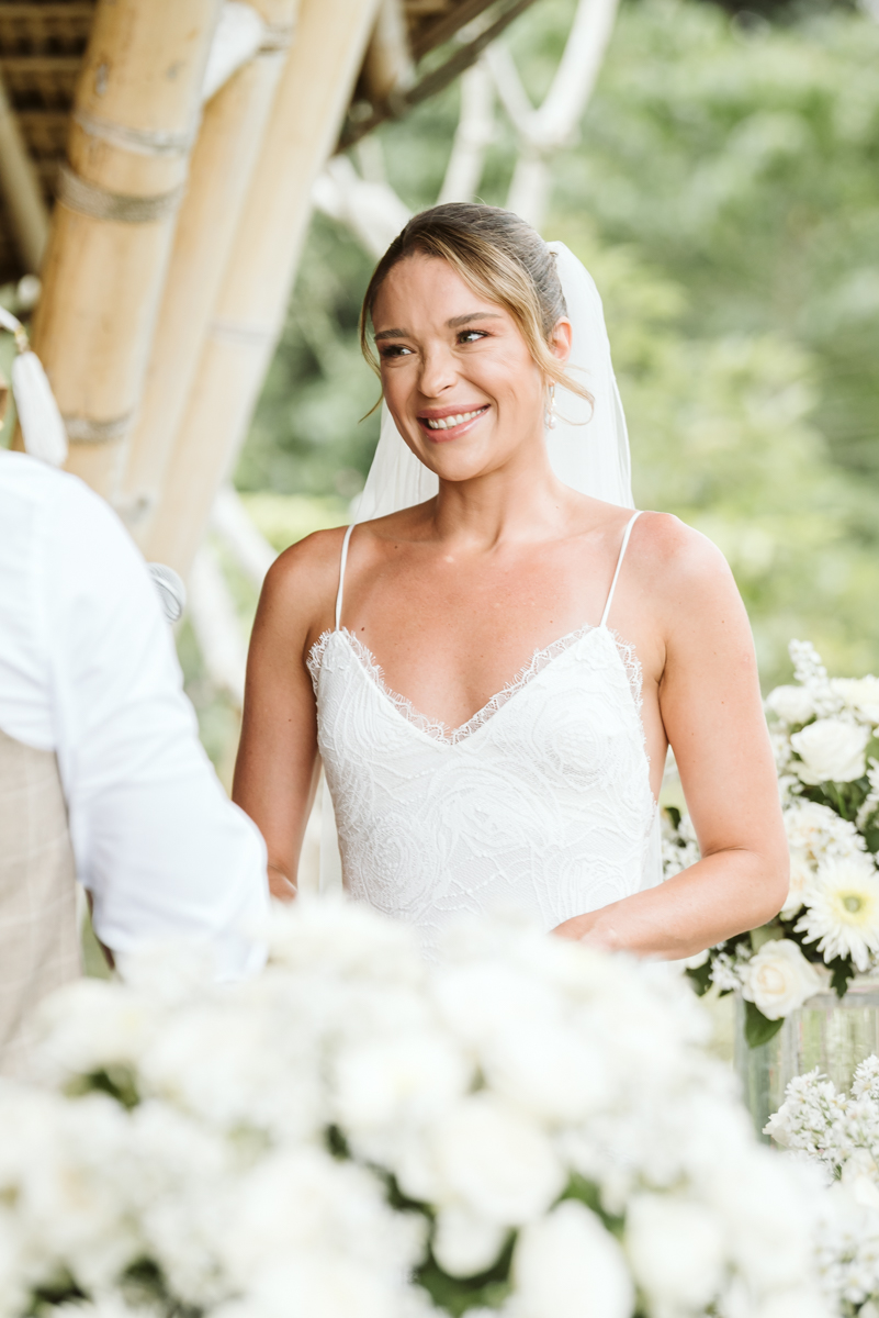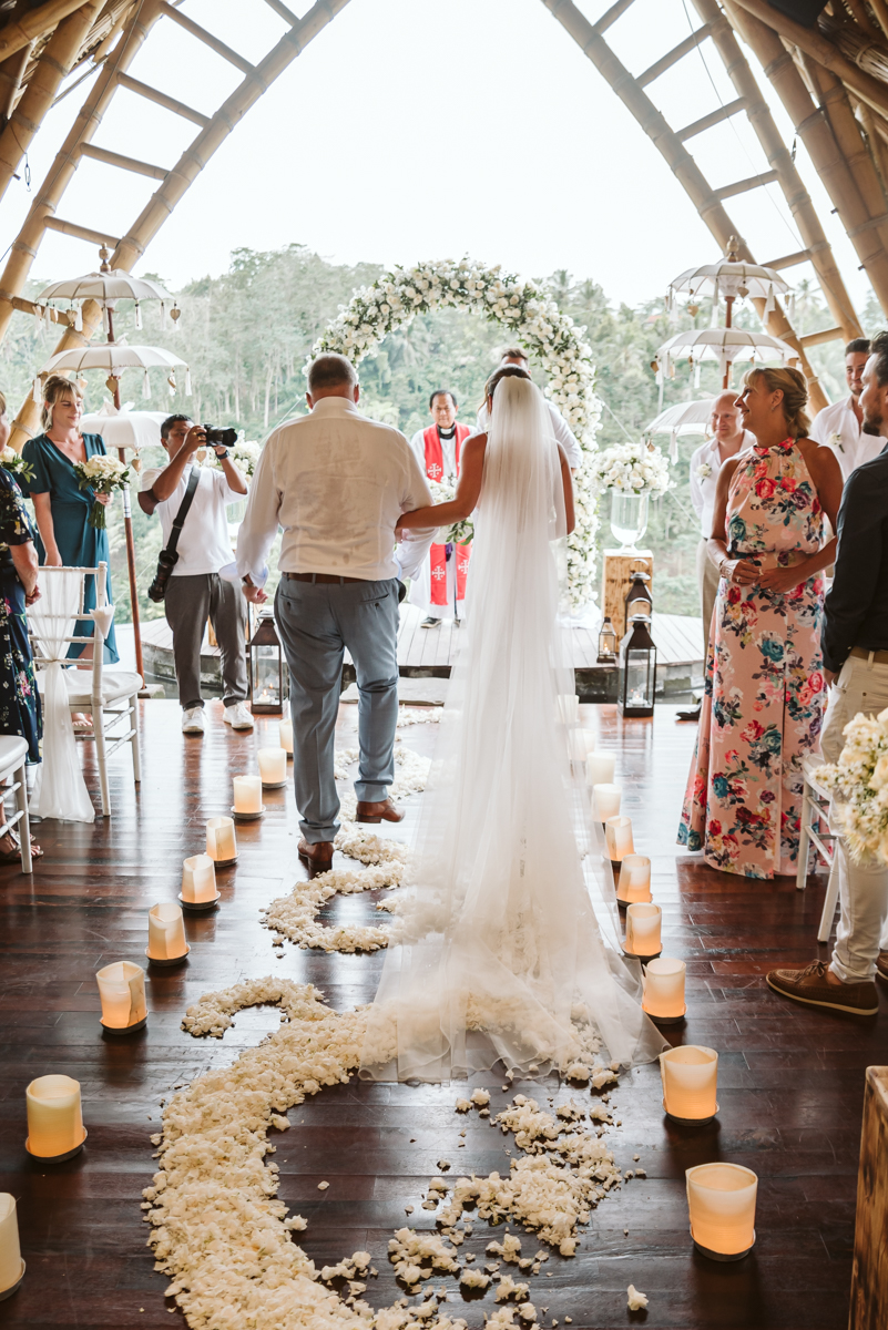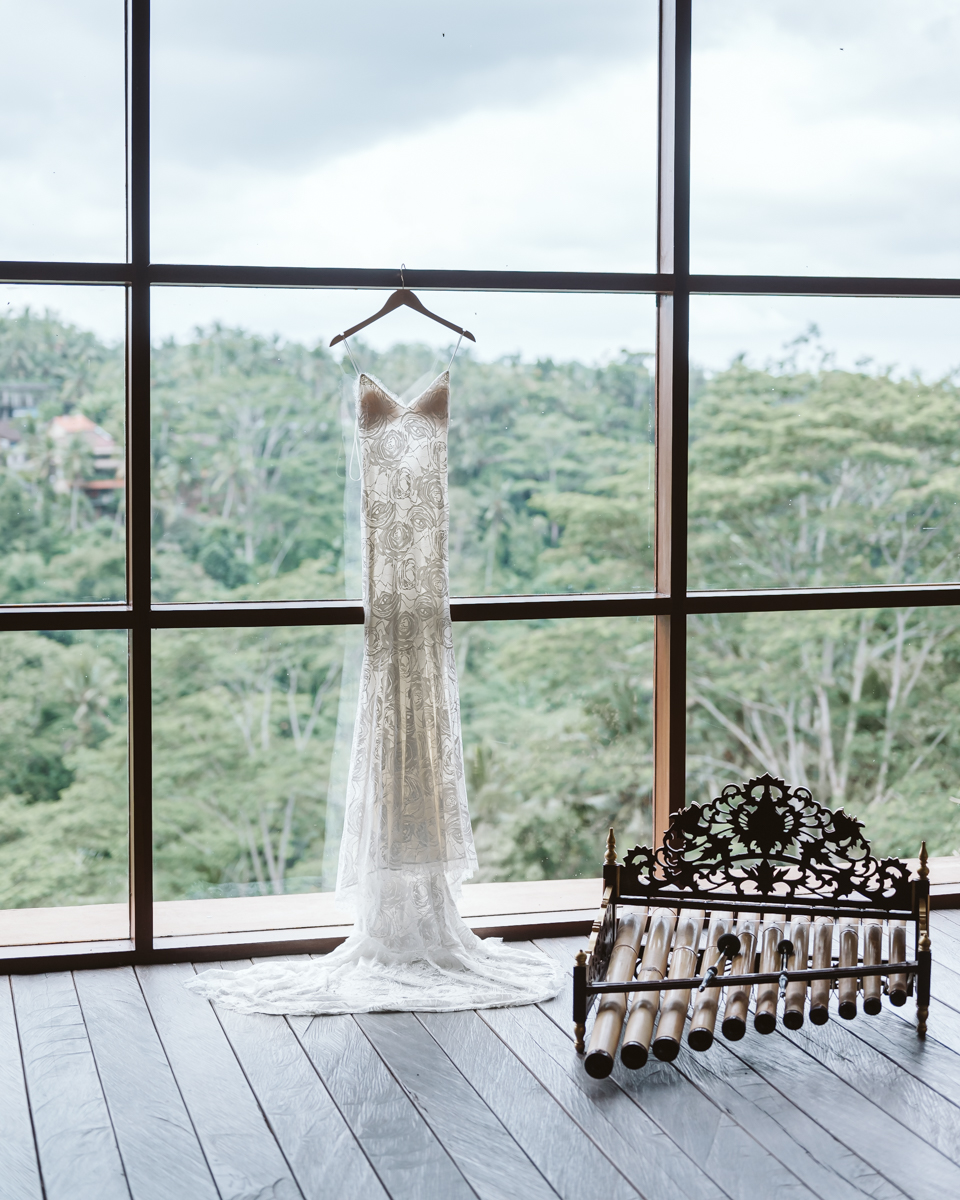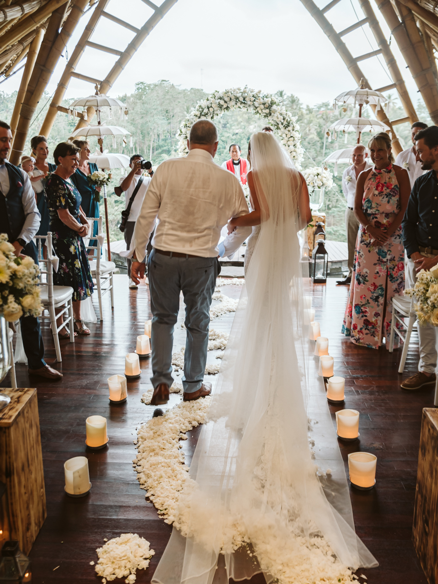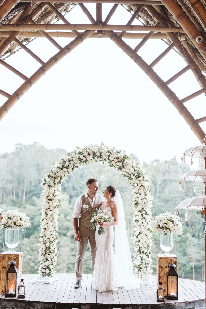 Le mariage s’est déroulé dans un superbe complexe hôtelier niché au cœur des rizières d’Ubud. Le lieu était entouré d’une jungle d’un vert émeraude, avec la rivière Ayung qui coulait doucement à proximité. Le site de la cérémonie était un pavillon en bambou pittoresque orné de offrant une vue panoramique sur le paysage environnant.