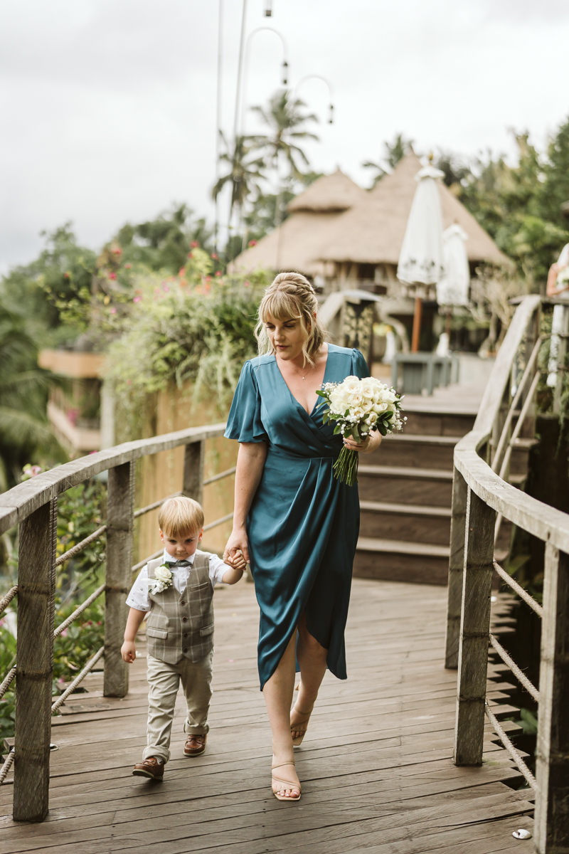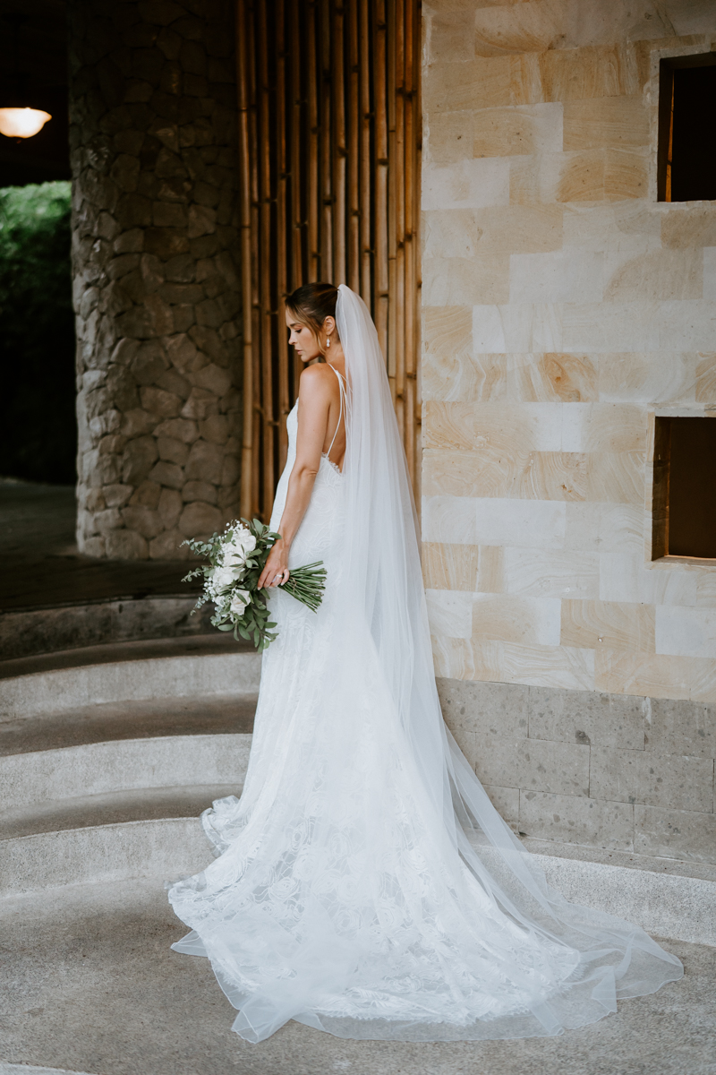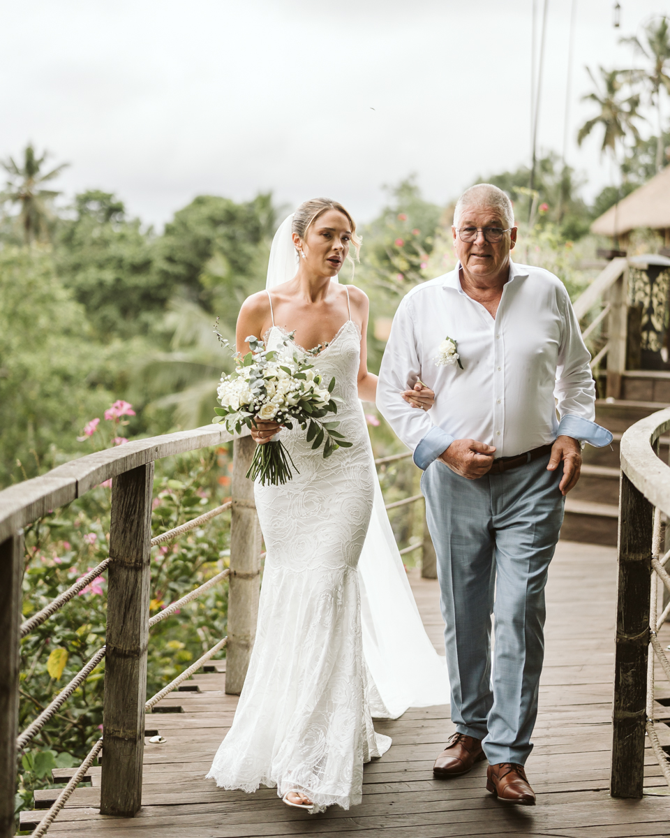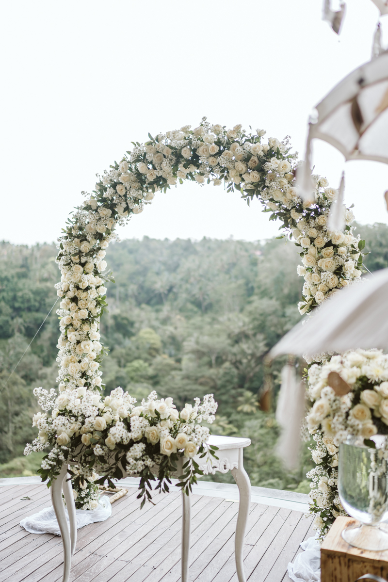 Le mariage s’est déroulé dans un superbe complexe hôtelier niché au cœur des rizières d’Ubud. Le lieu était entouré d’une jungle d’un vert émeraude, avec la rivière Ayung qui coulait doucement à proximité. Le site de la cérémonie était un pavillon en bambou pittoresque orné de offrant une vue panoramique sur le paysage environnant.
