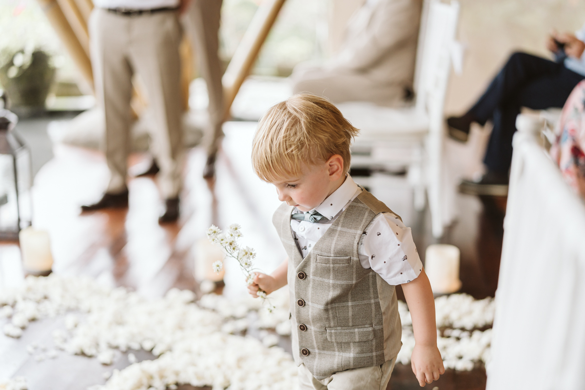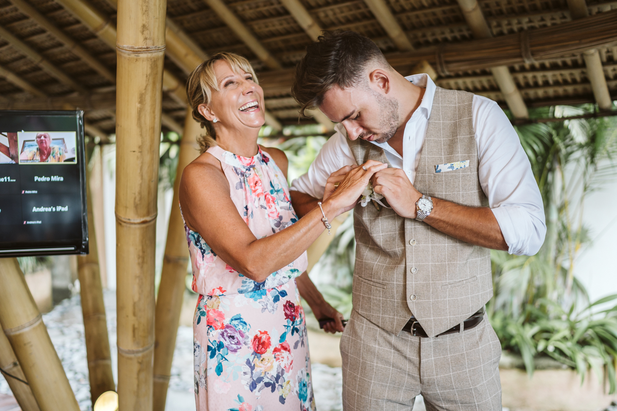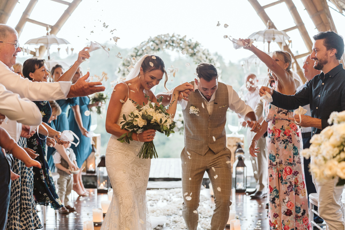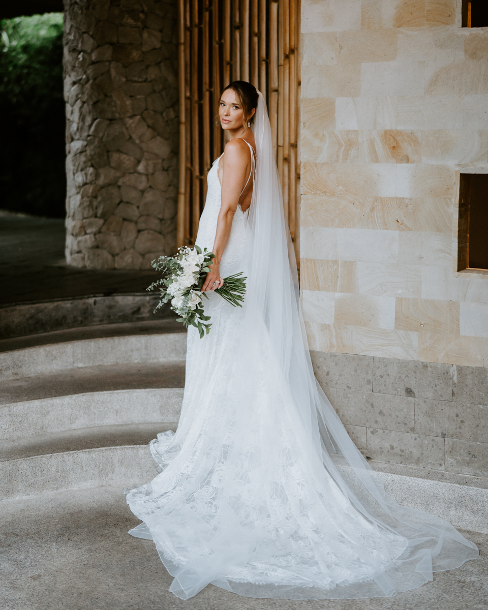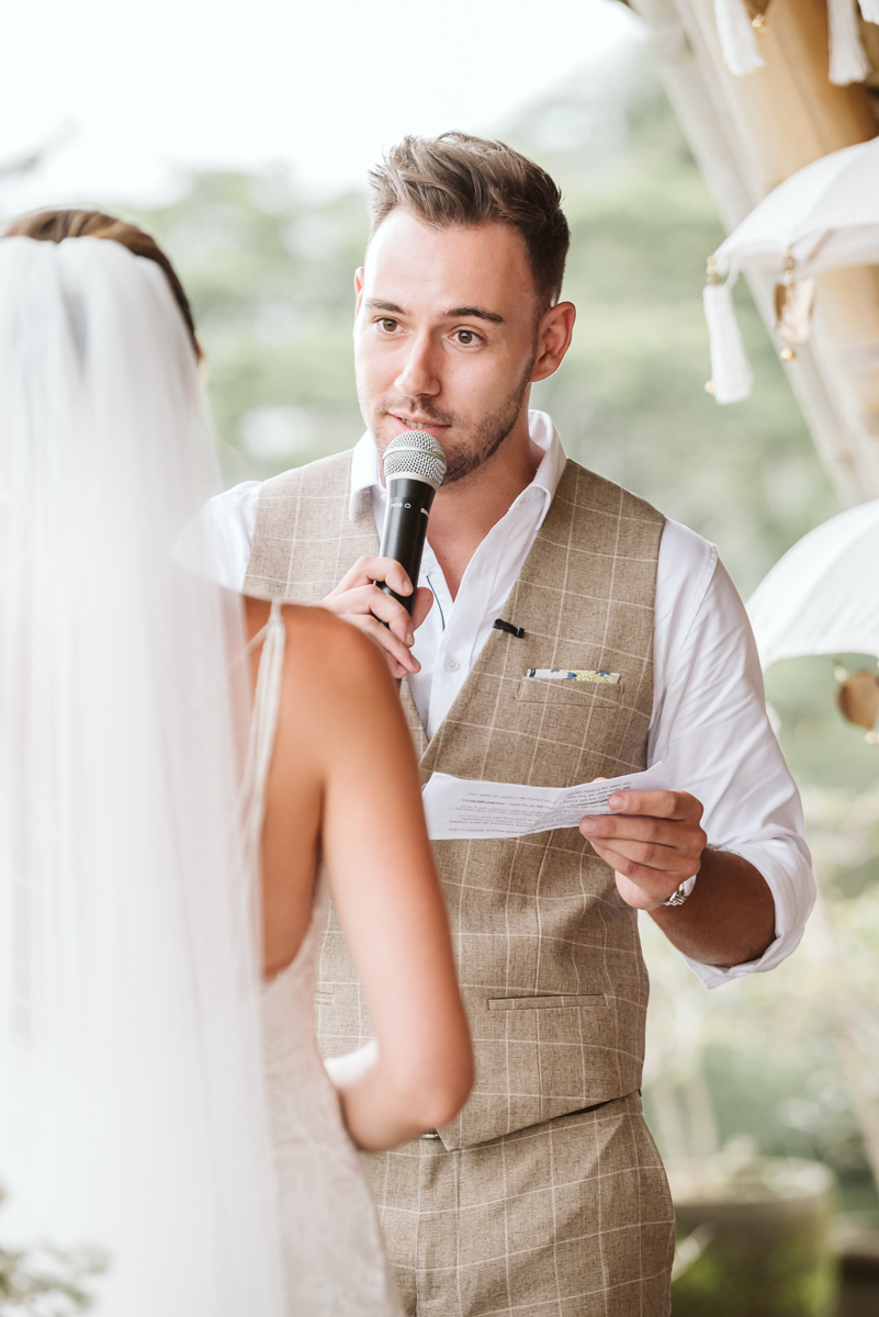 Le mariage s’est déroulé dans un superbe complexe hôtelier niché au cœur des rizières d’Ubud. Le lieu était entouré d’une jungle d’un vert émeraude, avec la rivière Ayung qui coulait doucement à proximité. Le site de la cérémonie était un pavillon en bambou pittoresque orné de offrant une vue panoramique sur le paysage environnant.