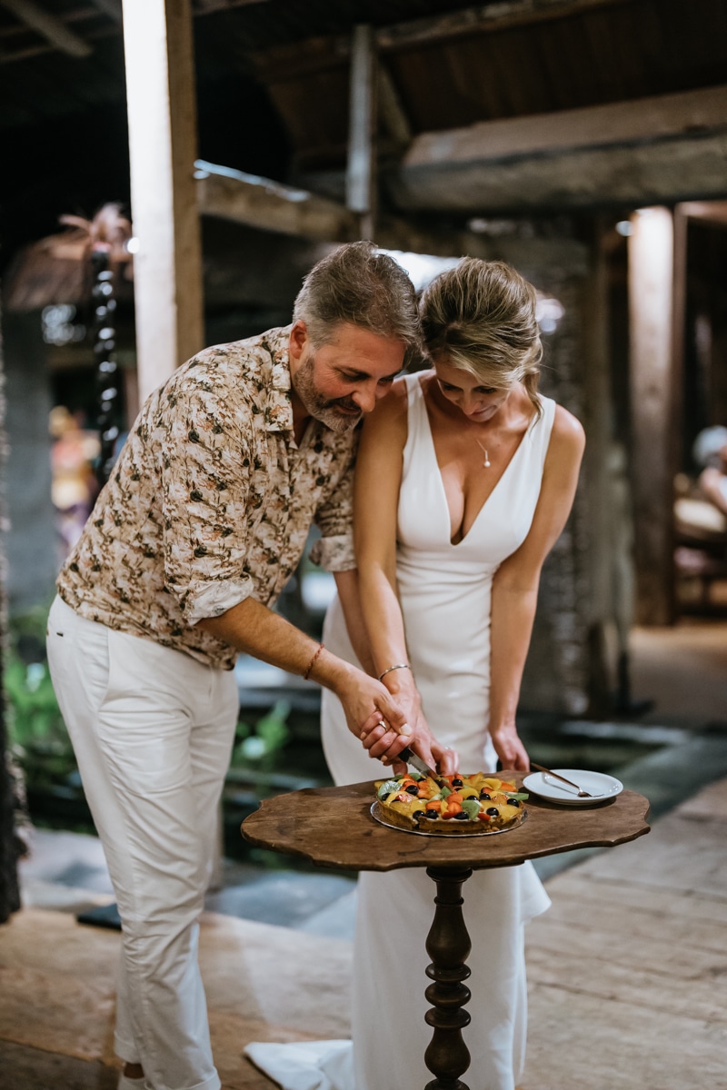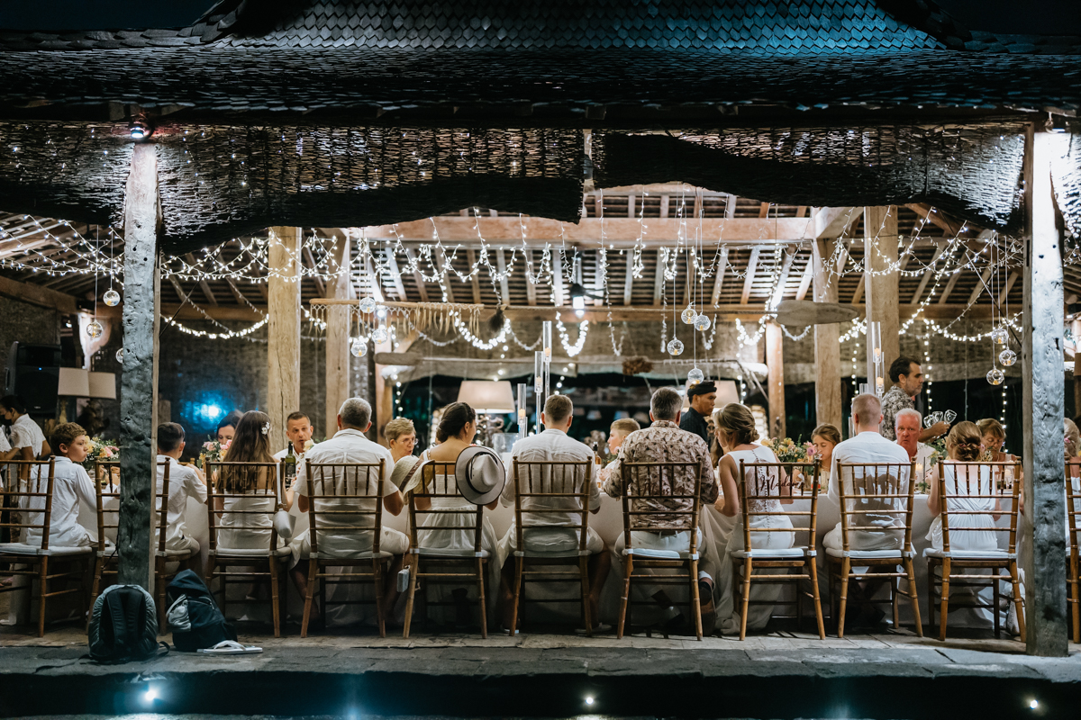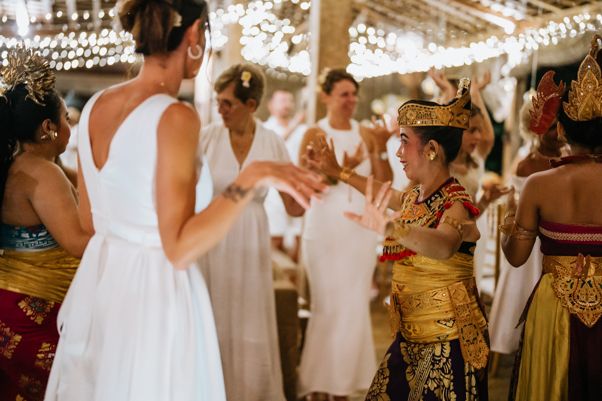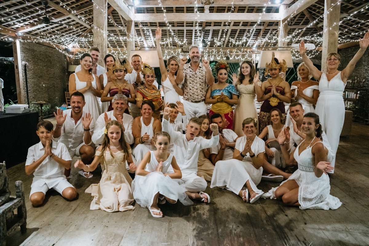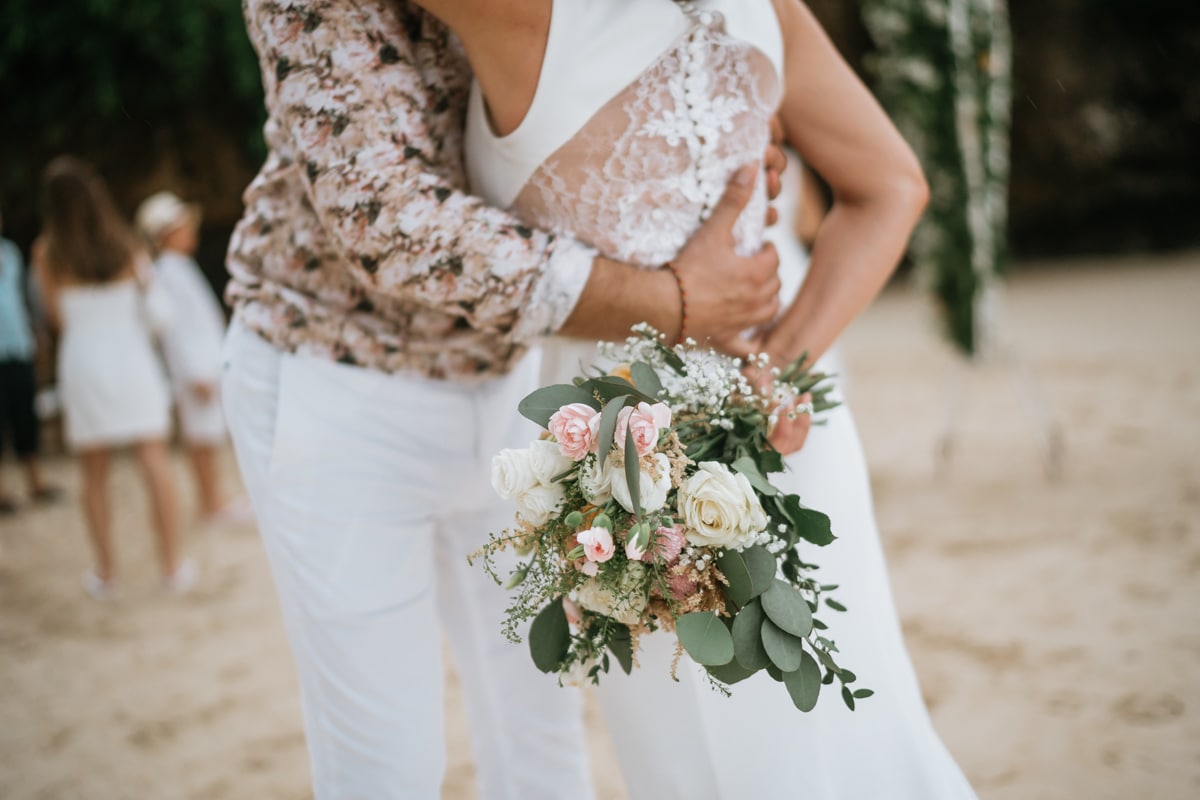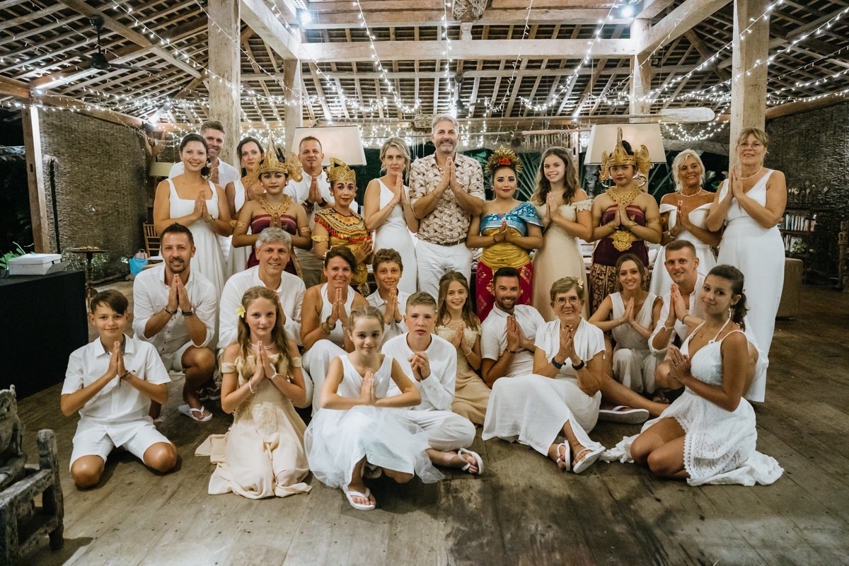 Une magnifique cérémonie avec la famille et les amis proches entre la plage de Balangan dans le sud de Bali suivi par un excellent diner dans une belle villa traditionnelle indonésienne.