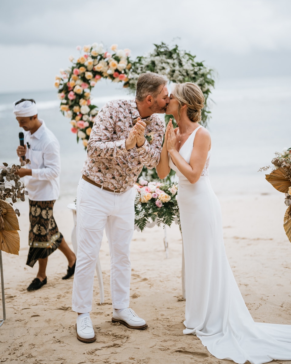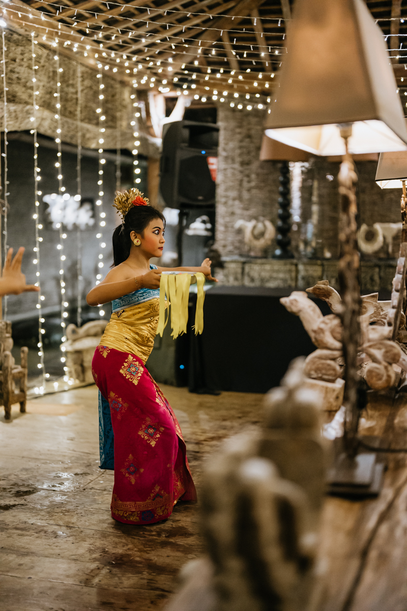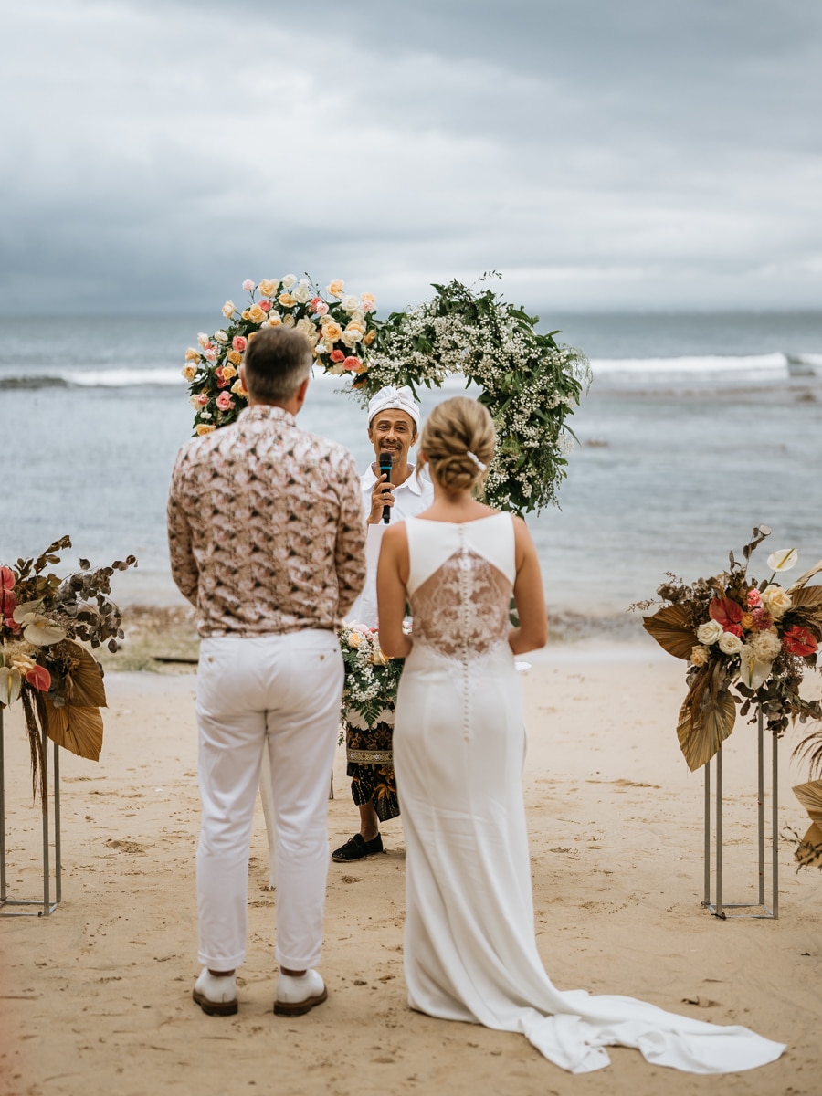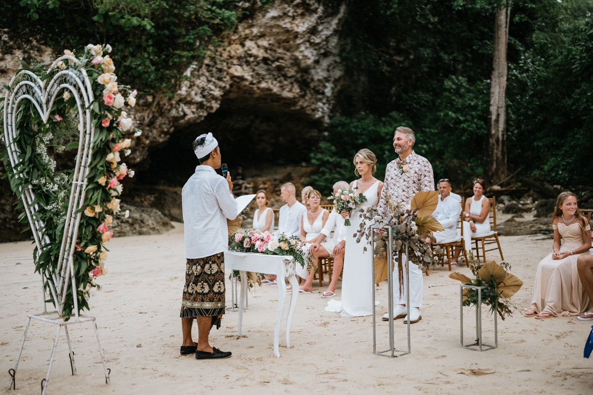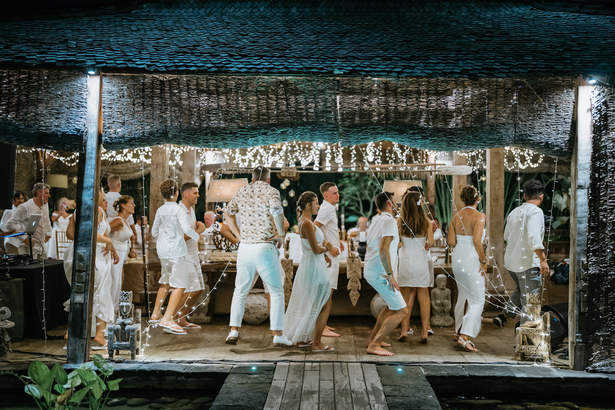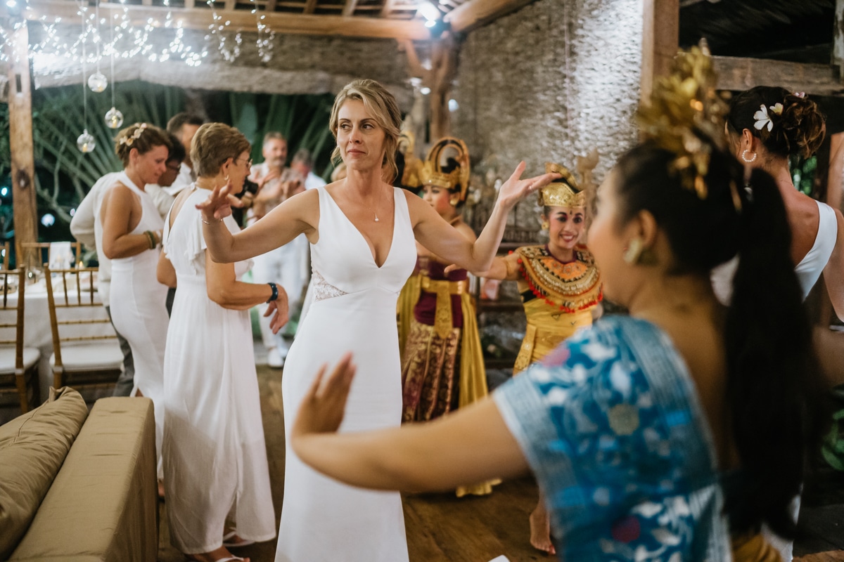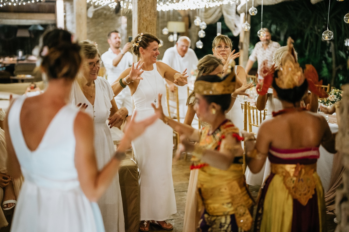 Une magnifique cérémonie avec la famille et les amis proches entre la plage de Balangan dans le sud de Bali suivi par un excellent diner dans une belle villa traditionnelle indonésienne.