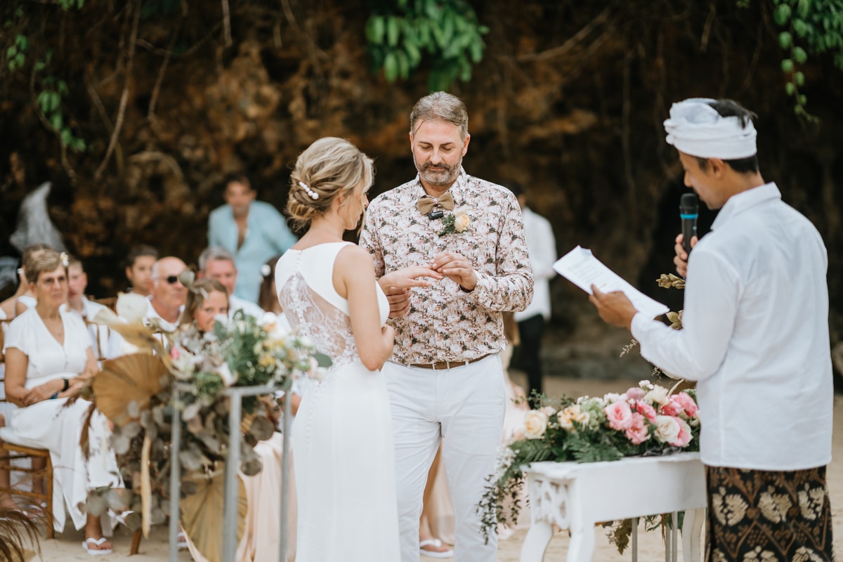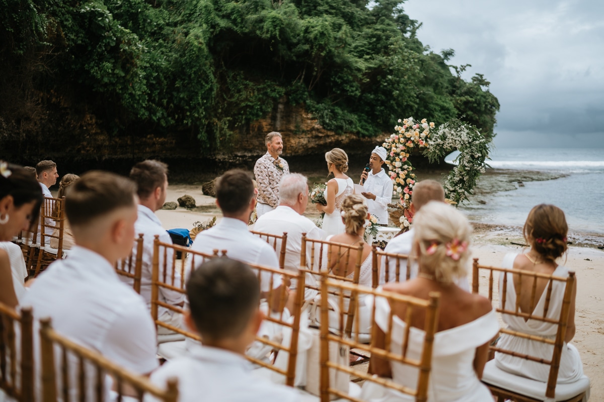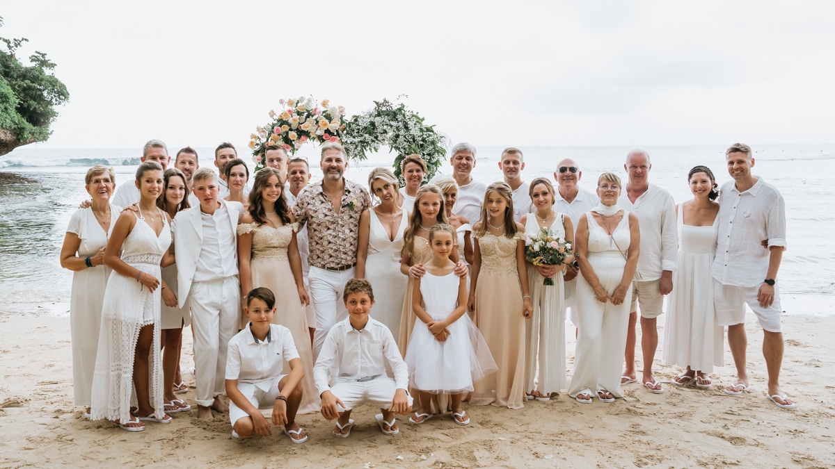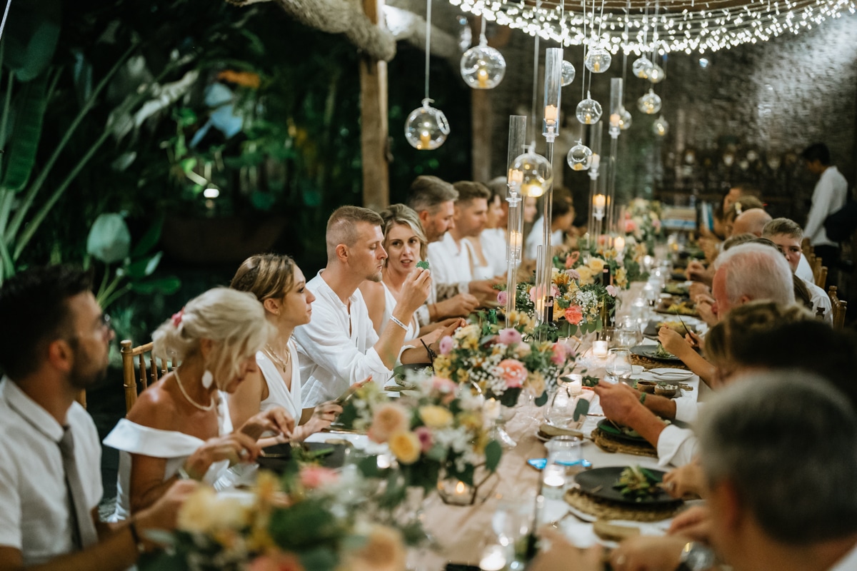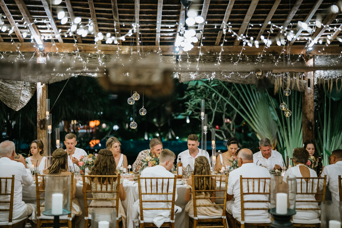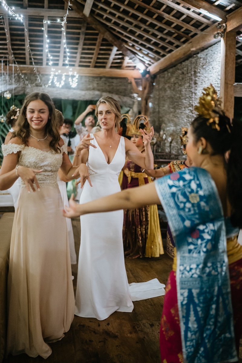Une magnifique cérémonie avec la famille et les amis proches entre la plage de Balangan dans le sud de Bali suivi par un excellent diner dans une belle villa traditionnelle indonésienne.