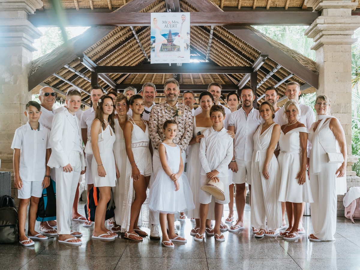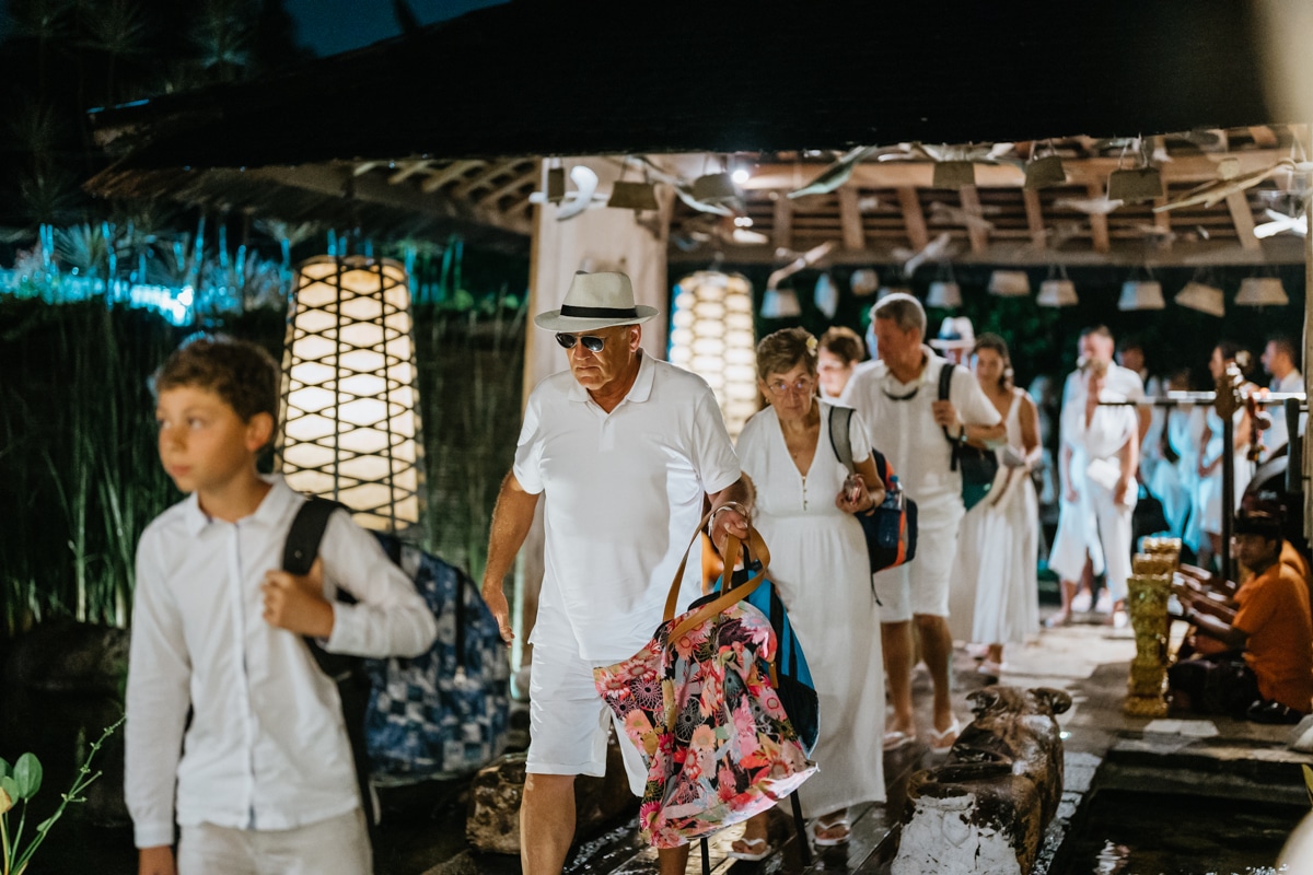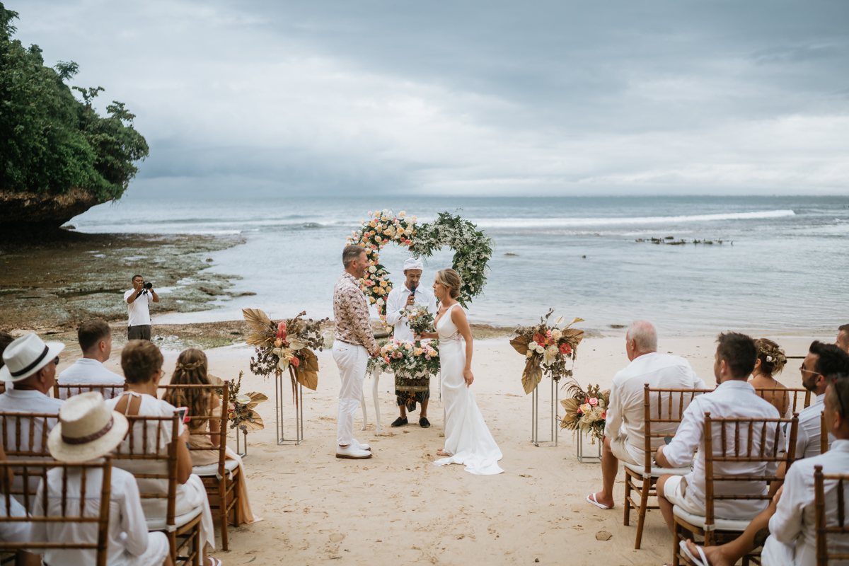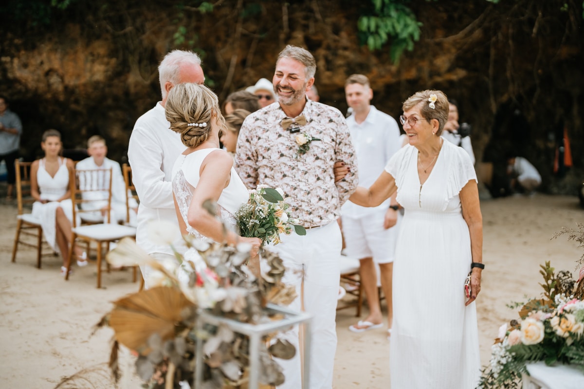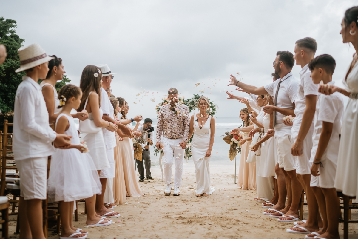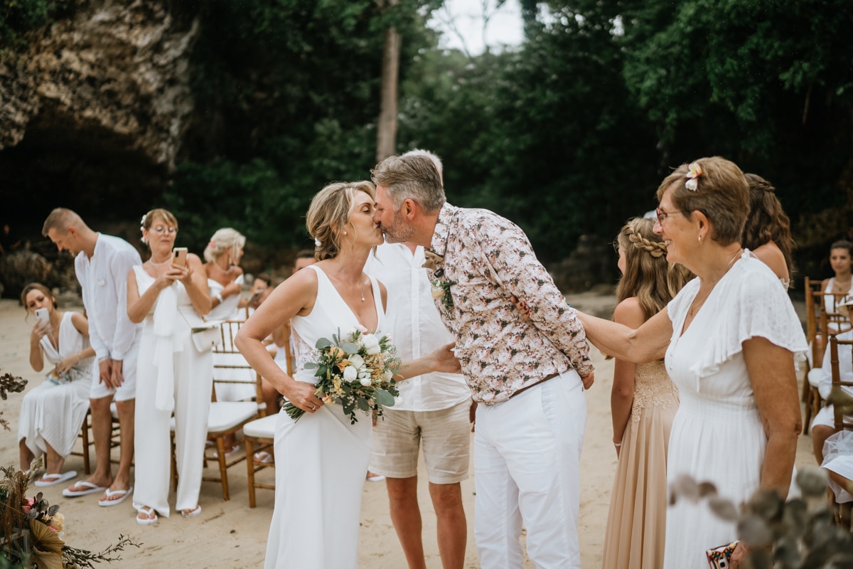 Une magnifique cérémonie avec la famille et les amis proches entre la plage de Balangan dans le sud de Bali suivi par un excellent diner dans une belle villa traditionnelle indonésienne.