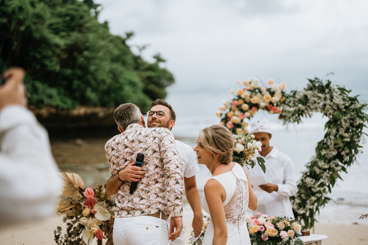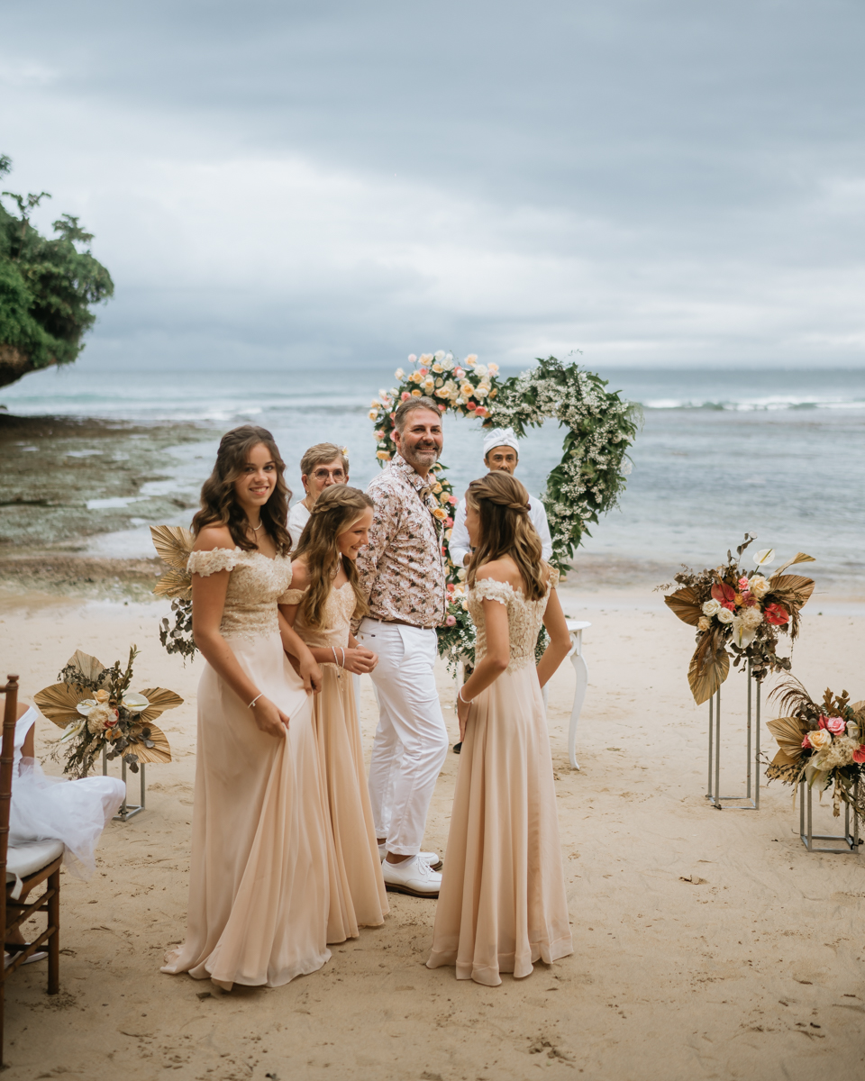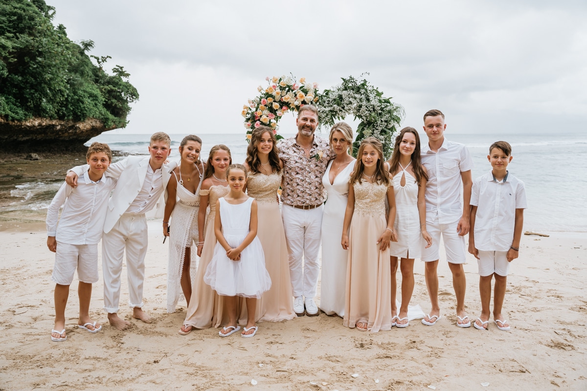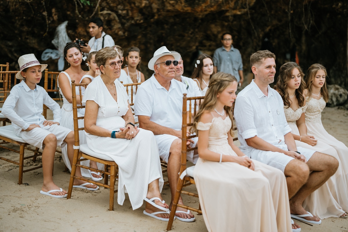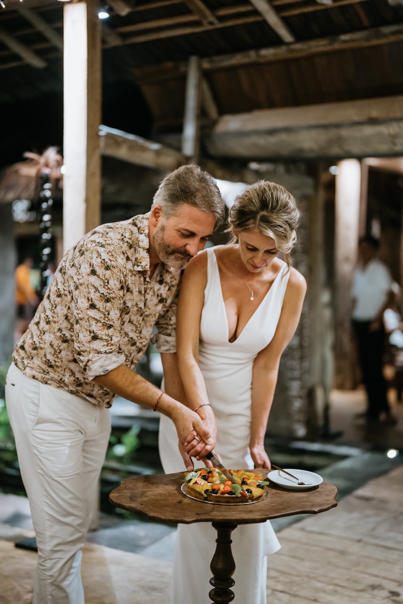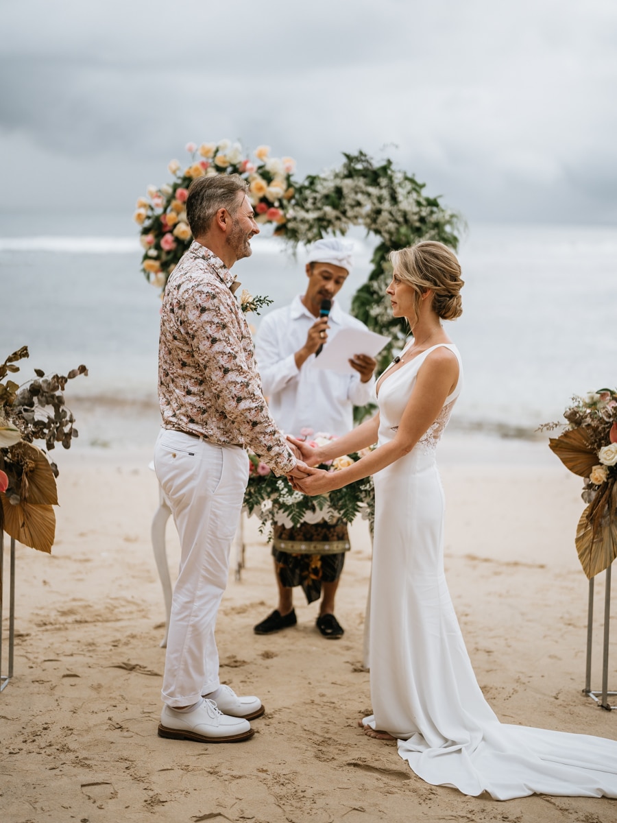 Une magnifique cérémonie avec la famille et les amis proches entre la plage de Balangan dans le sud de Bali suivi par un excellent diner dans une belle villa traditionnelle indonésienne.