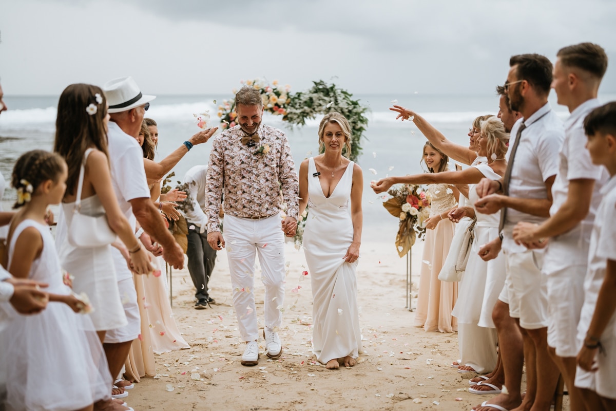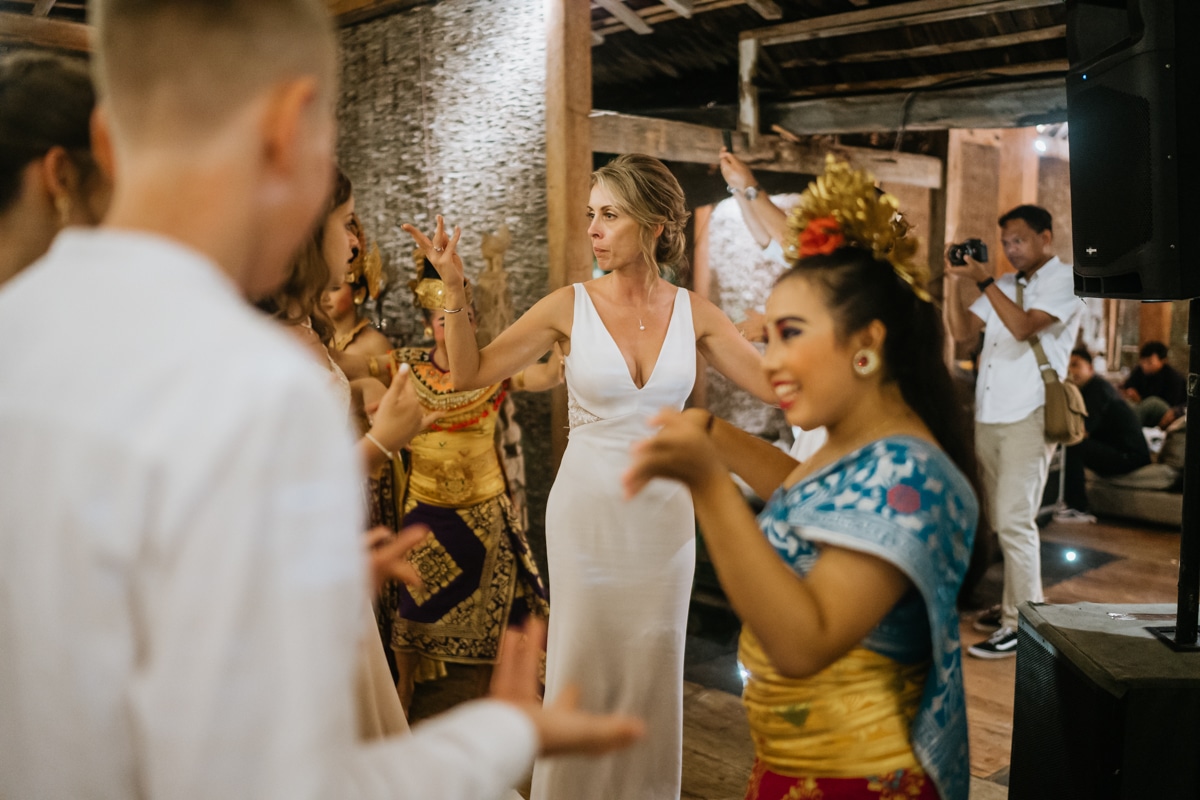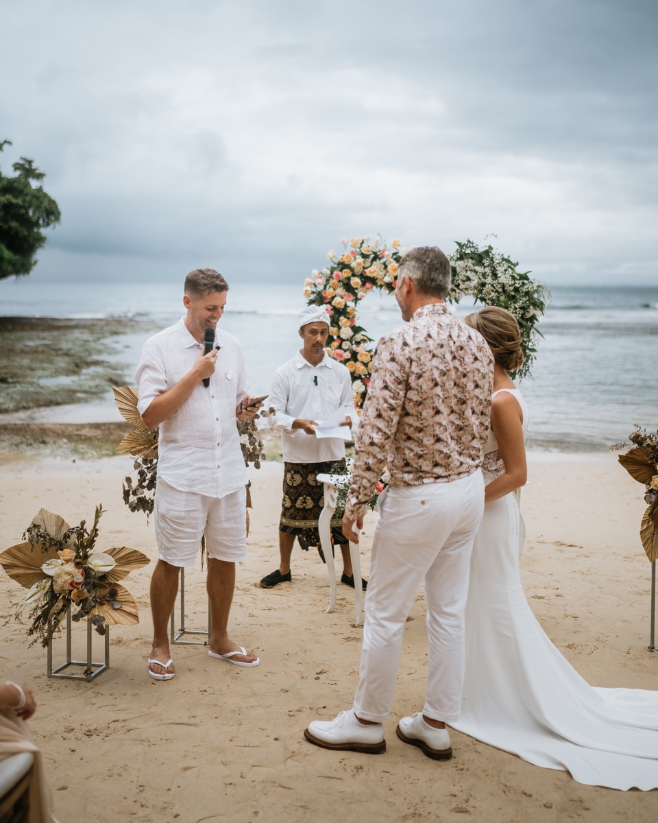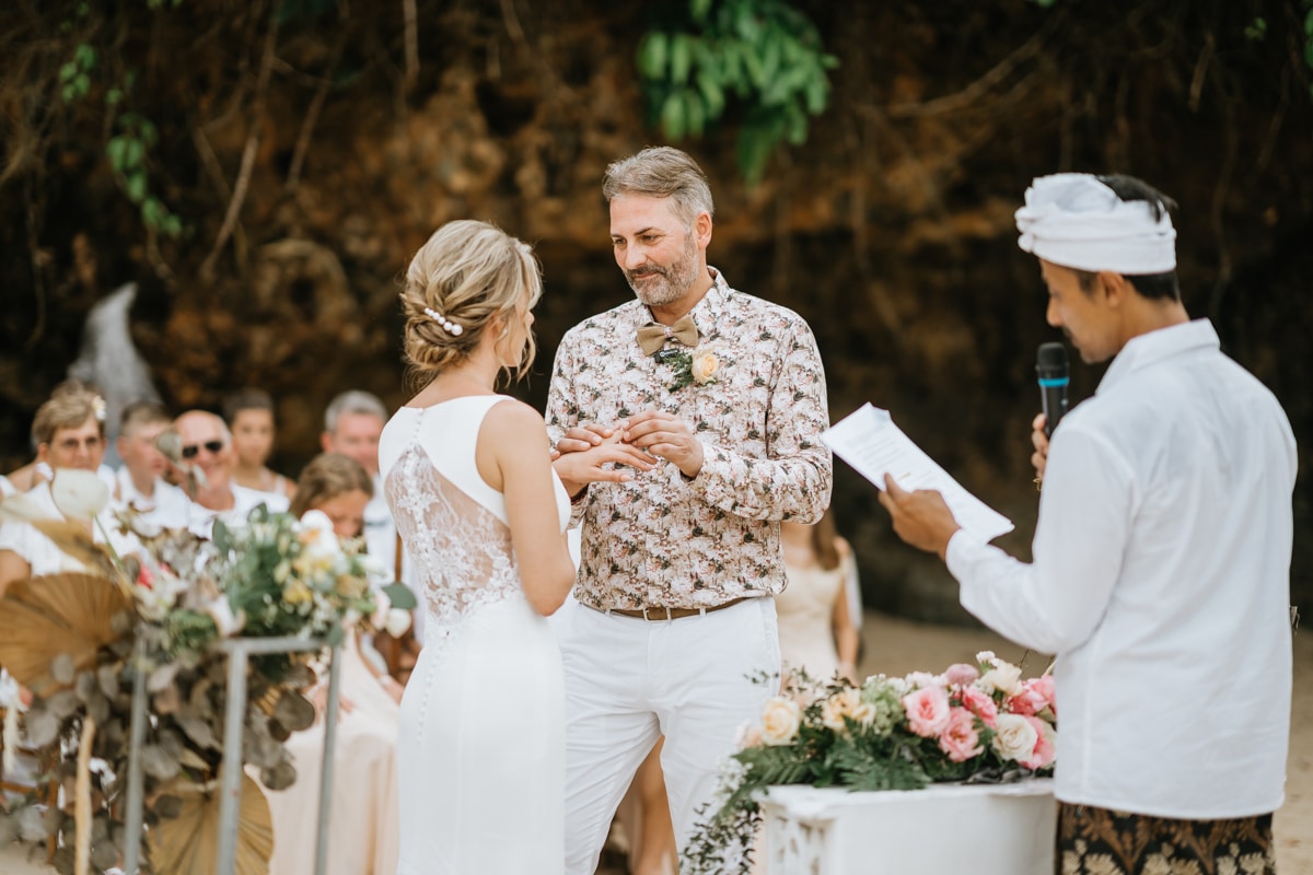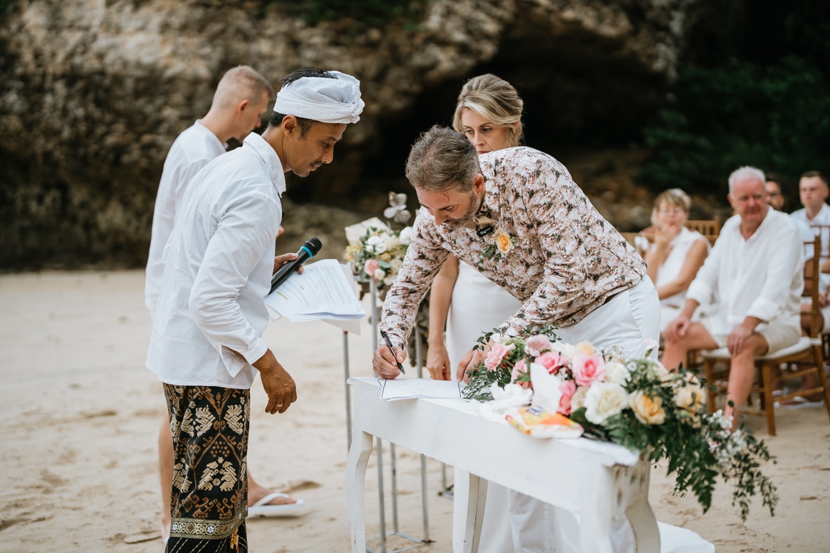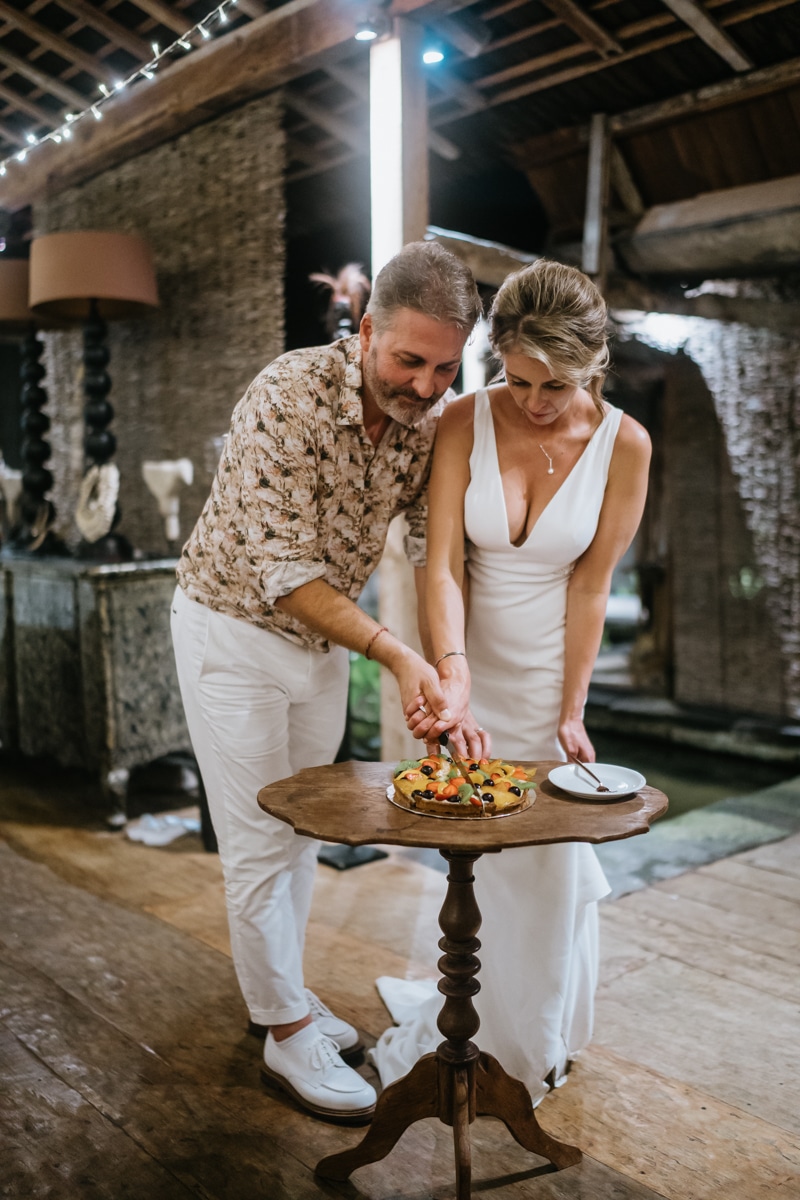 Une magnifique cérémonie avec la famille et les amis proches entre la plage de Balangan dans le sud de Bali suivi par un excellent diner dans une belle villa traditionnelle indonésienne.