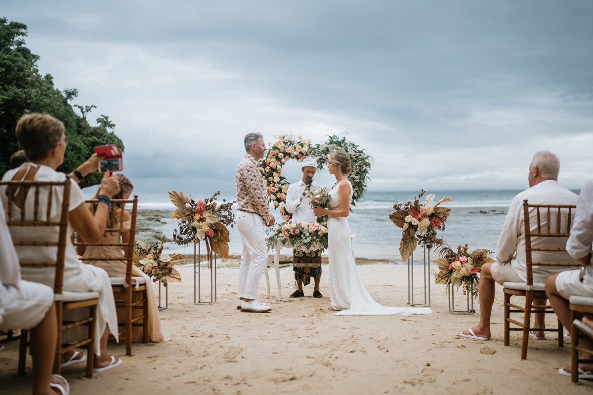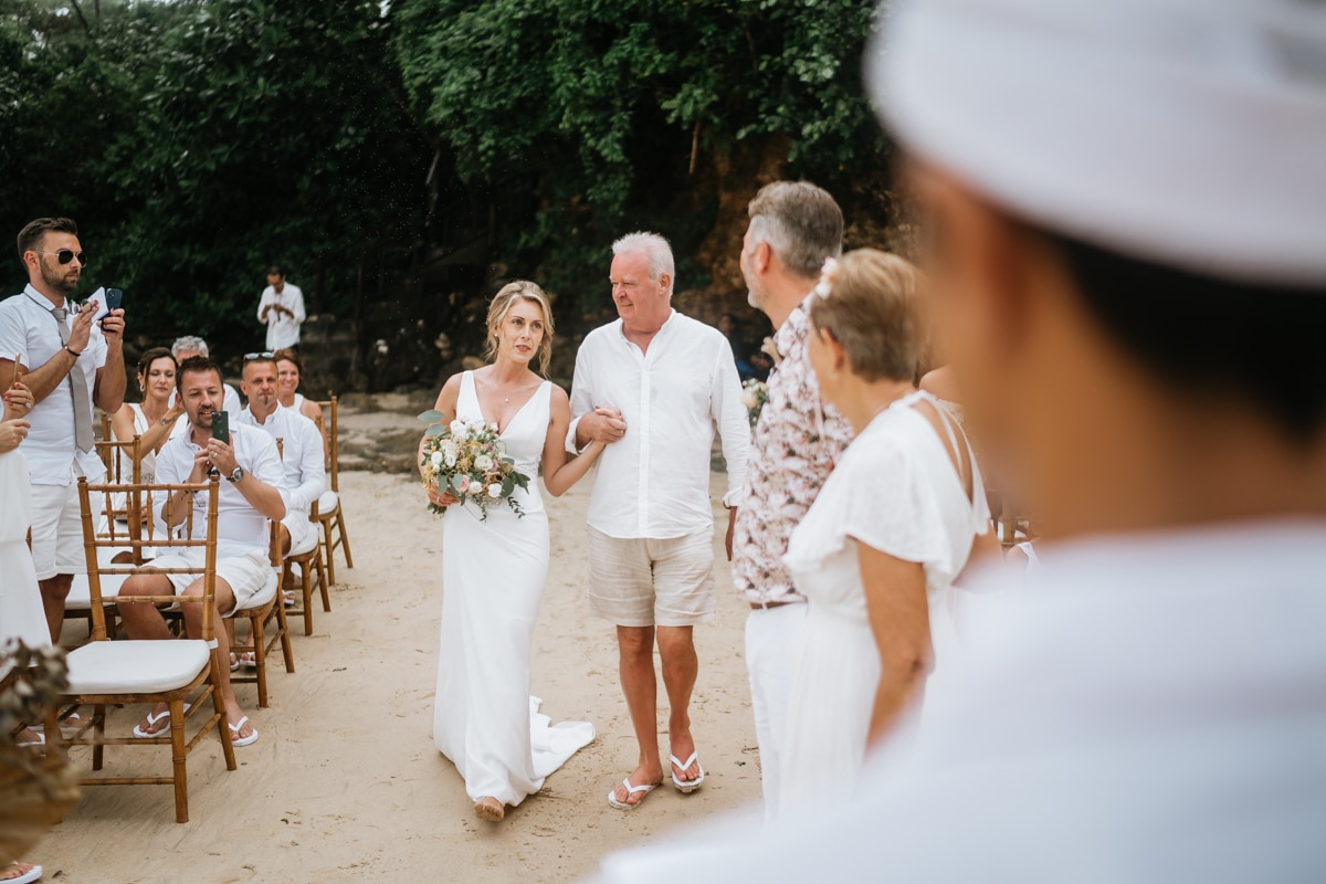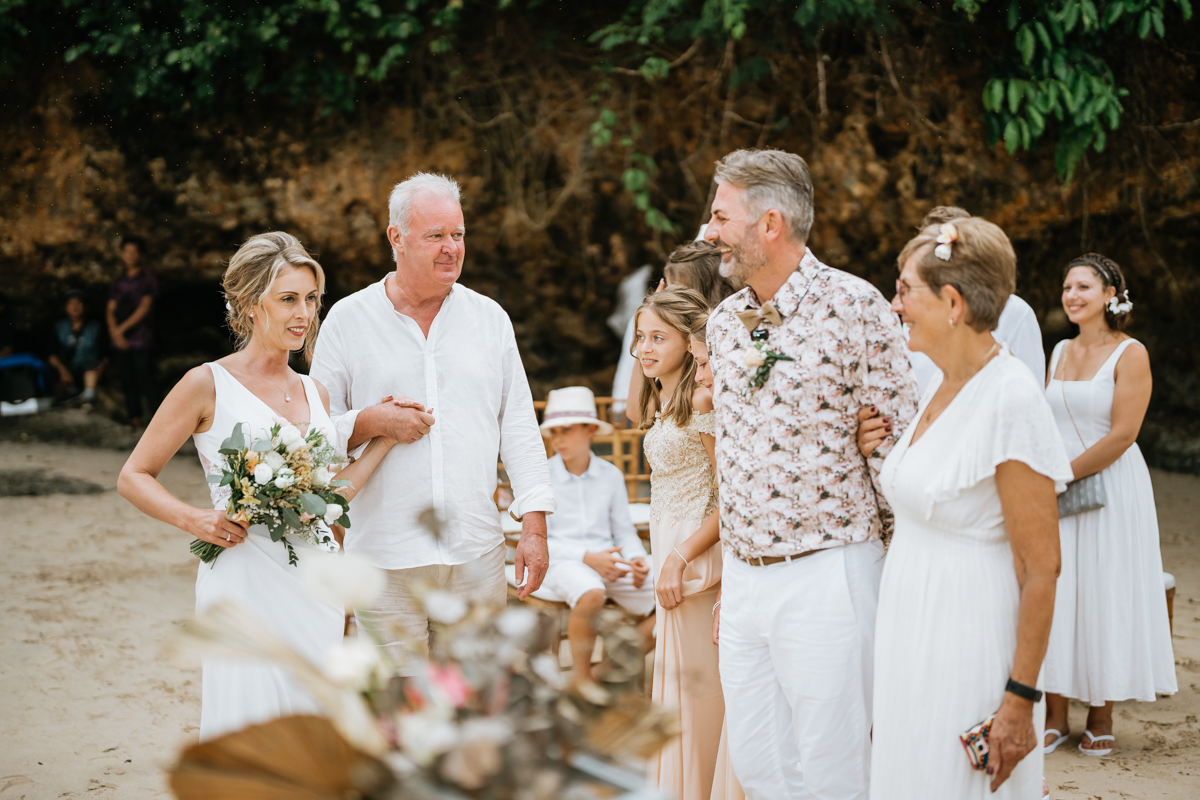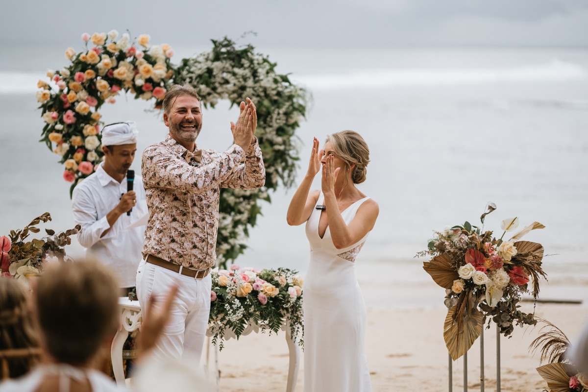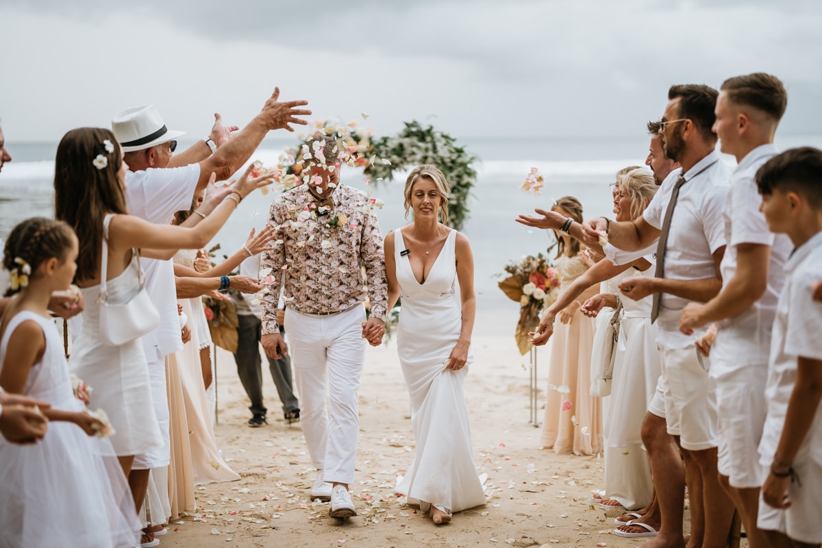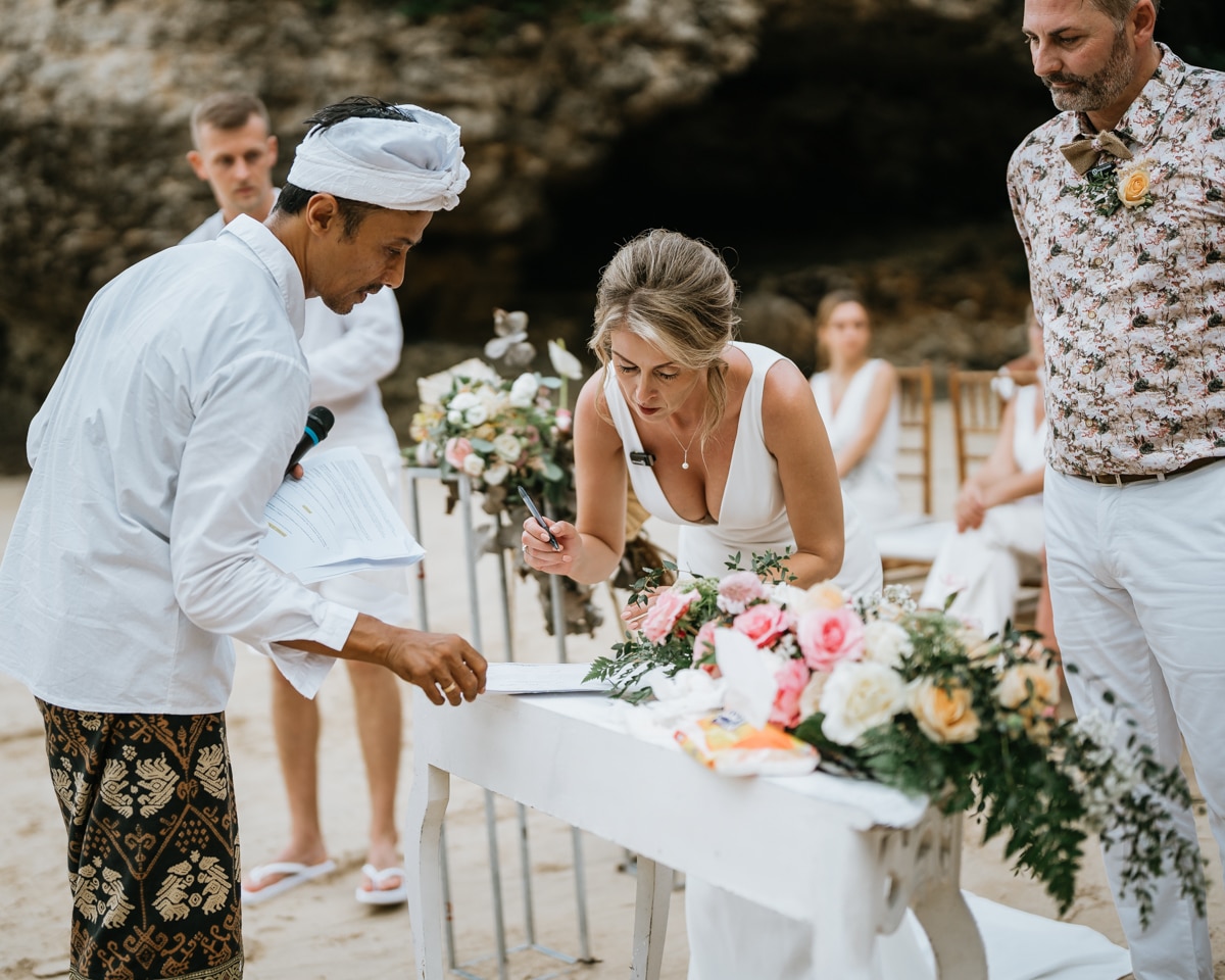 Une magnifique cérémonie avec la famille et les amis proches entre la plage de Balangan dans le sud de Bali suivi par un excellent diner dans une belle villa traditionnelle indonésienne.
