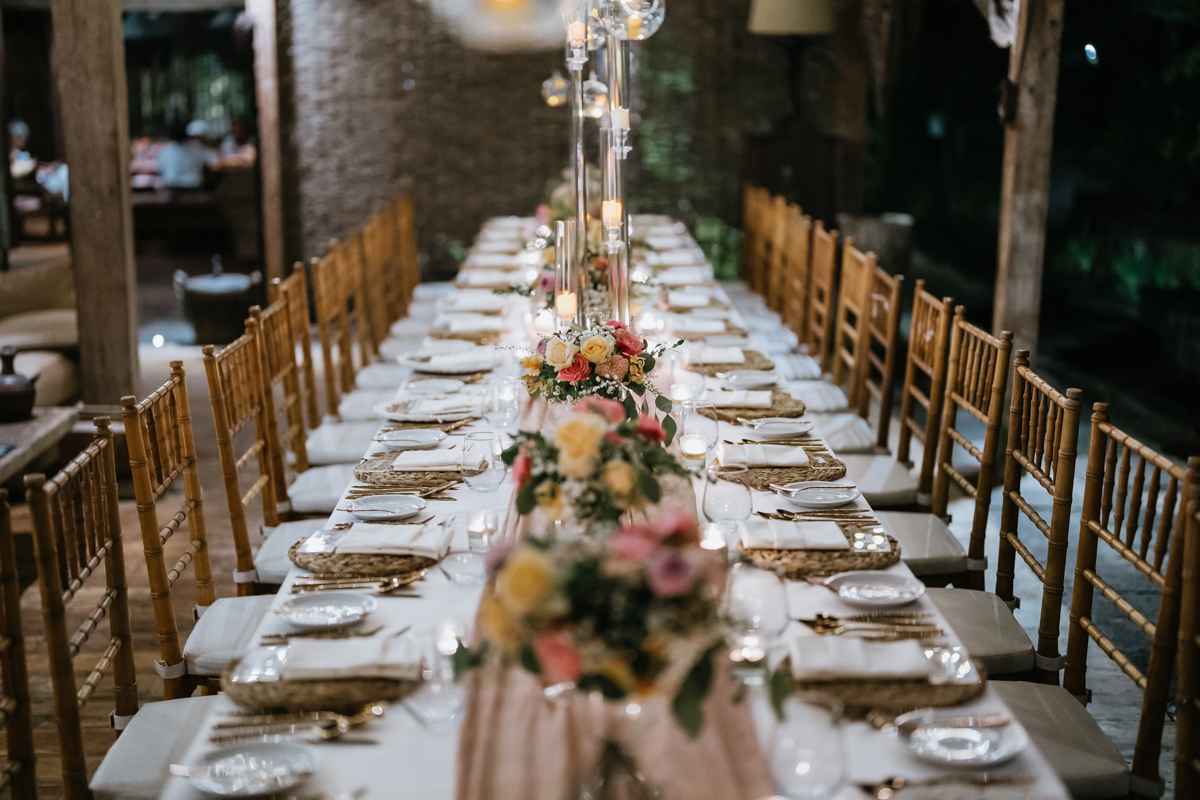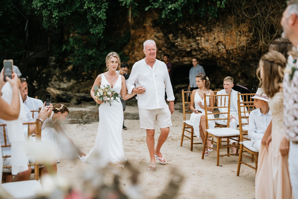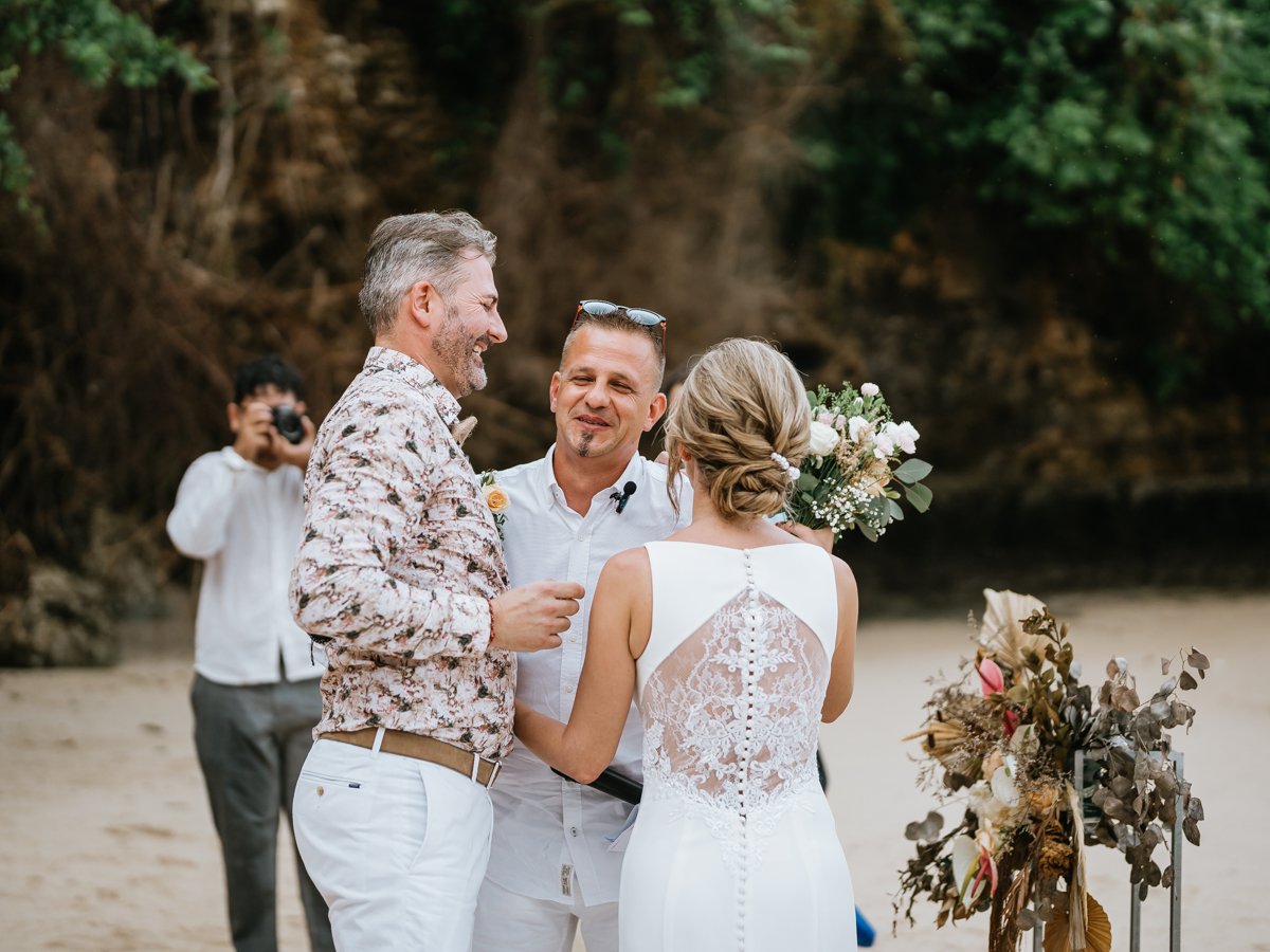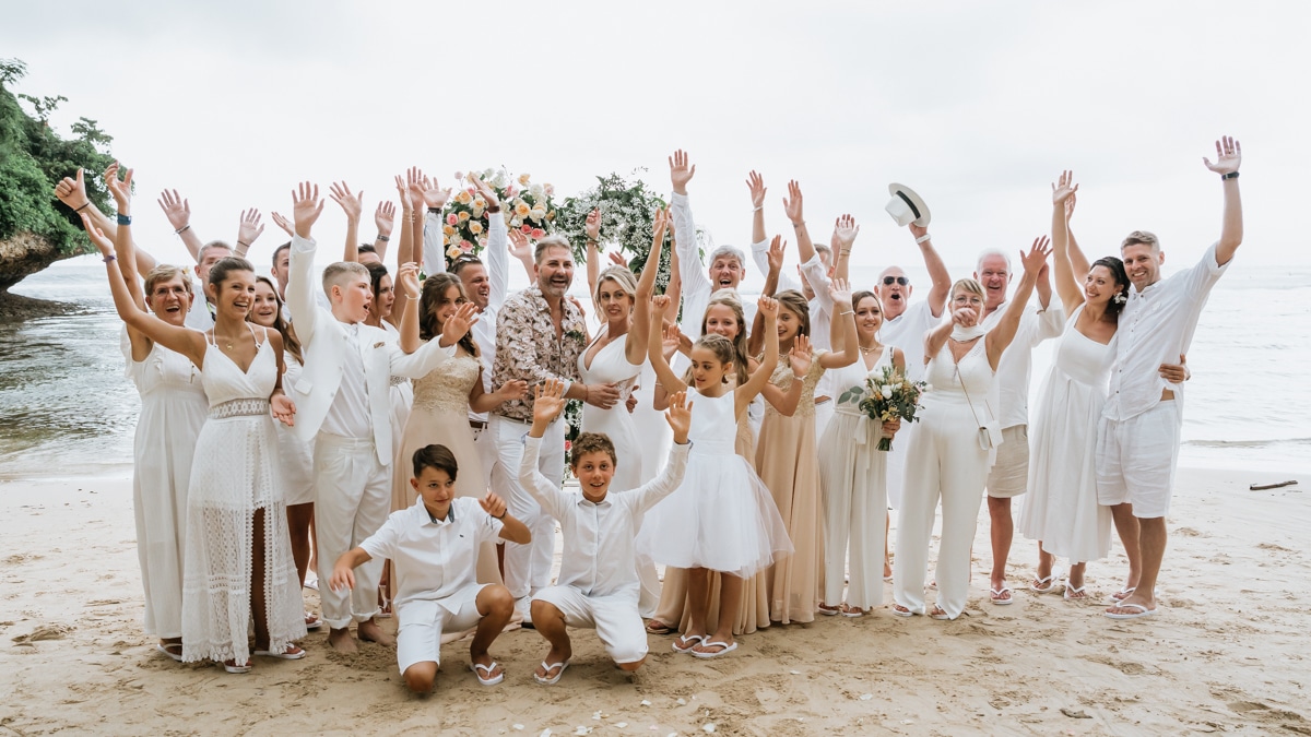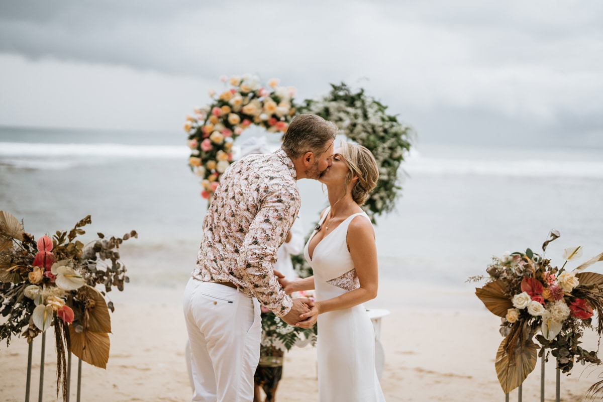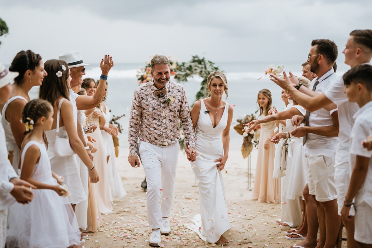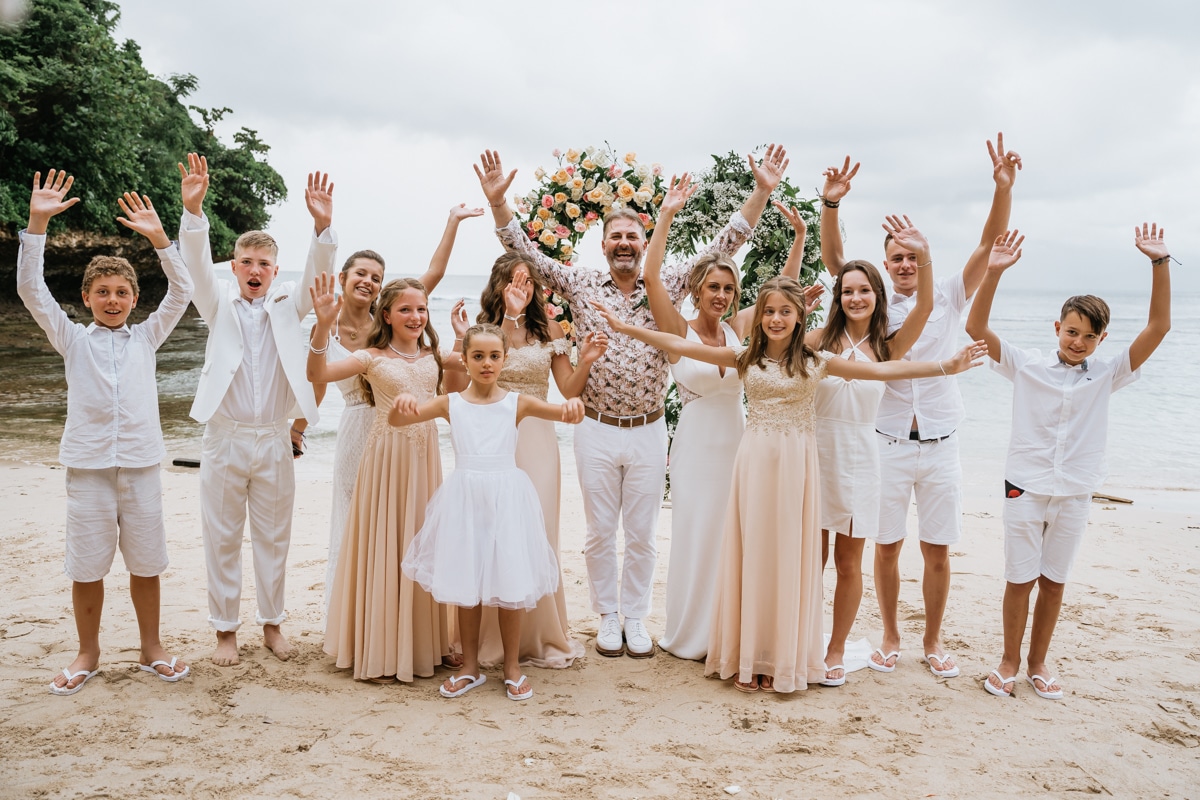 Une magnifique cérémonie avec la famille et les amis proches entre la plage de Balangan dans le sud de Bali suivi par un excellent diner dans une belle villa traditionnelle indonésienne.