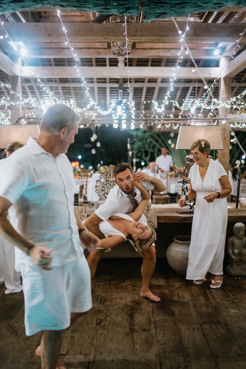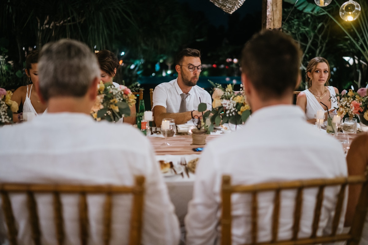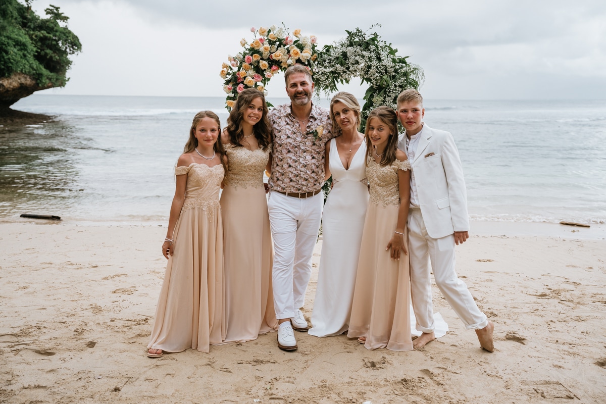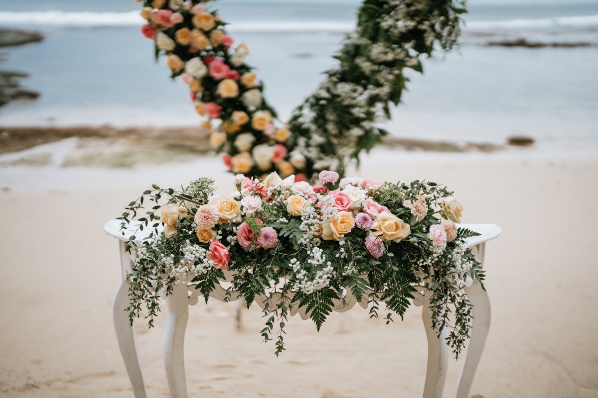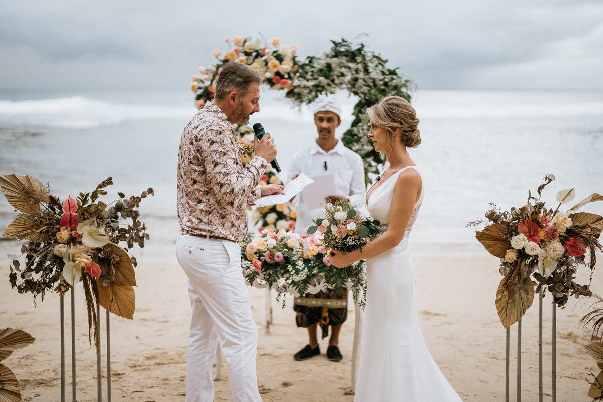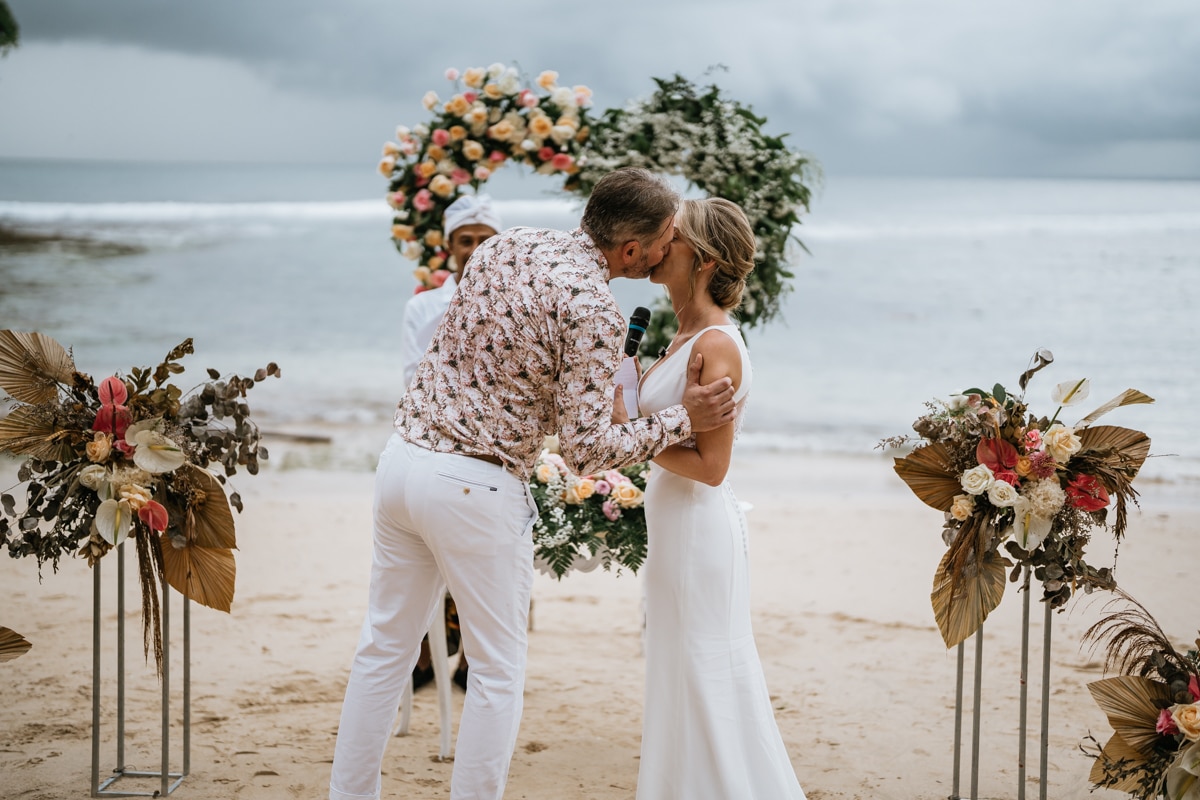 Une magnifique cérémonie avec la famille et les amis proches entre la plage de Balangan dans le sud de Bali suivi par un excellent diner dans une belle villa traditionnelle indonésienne.