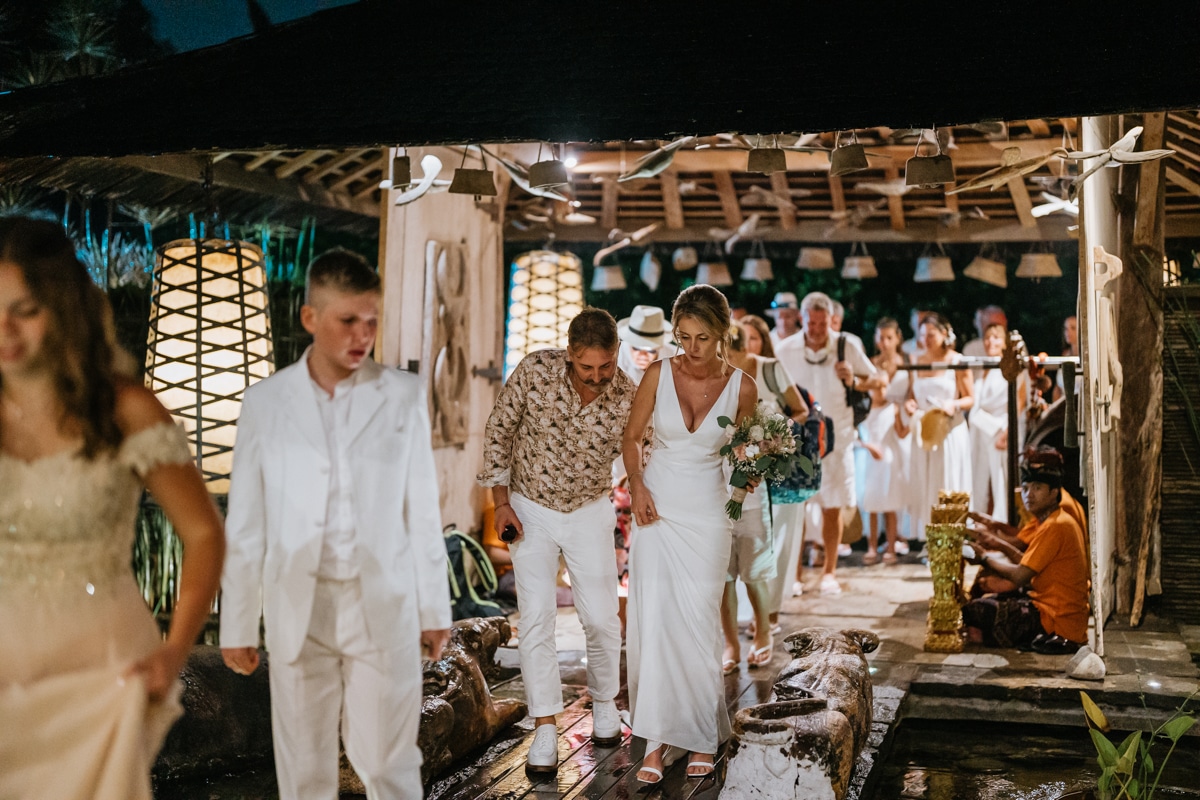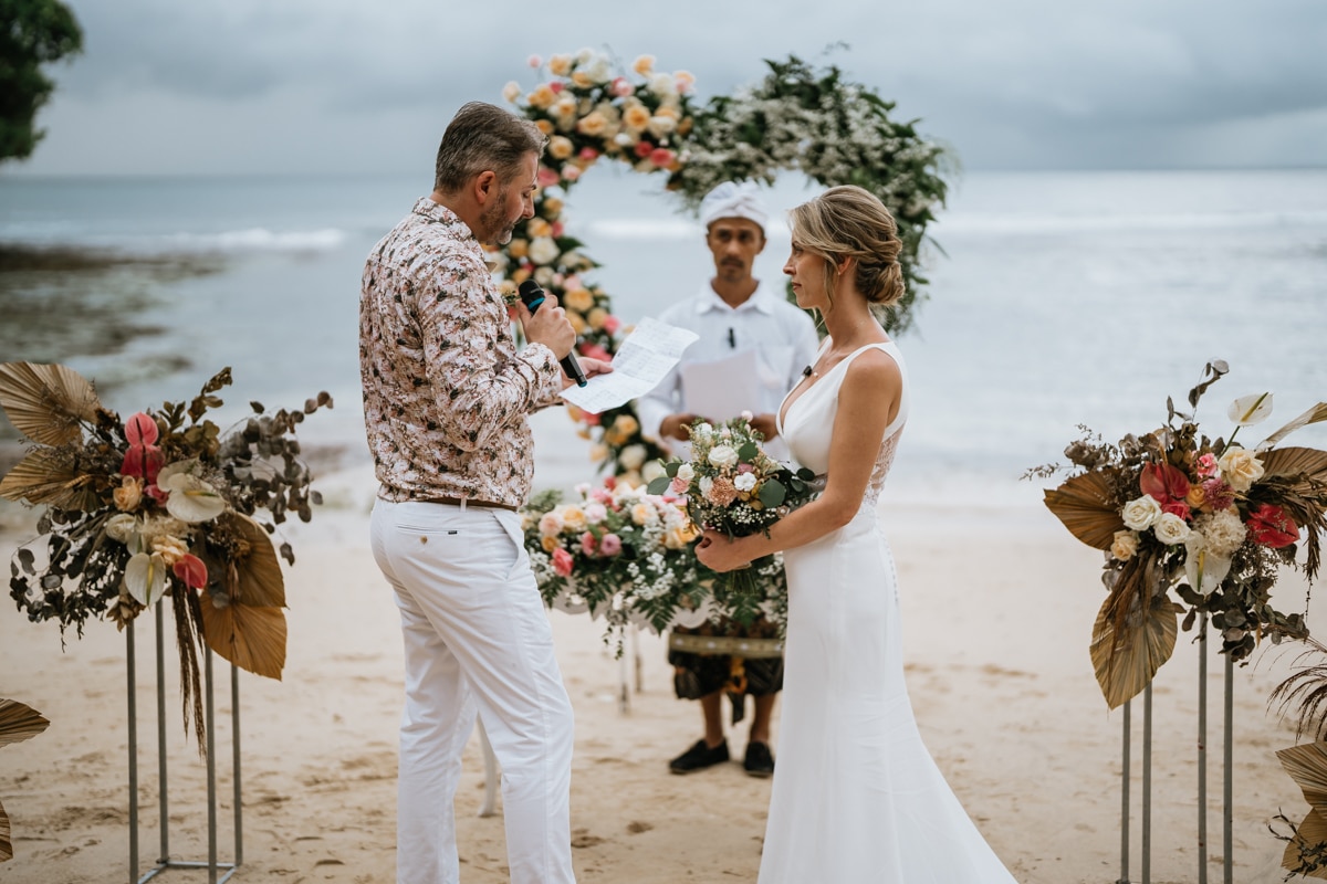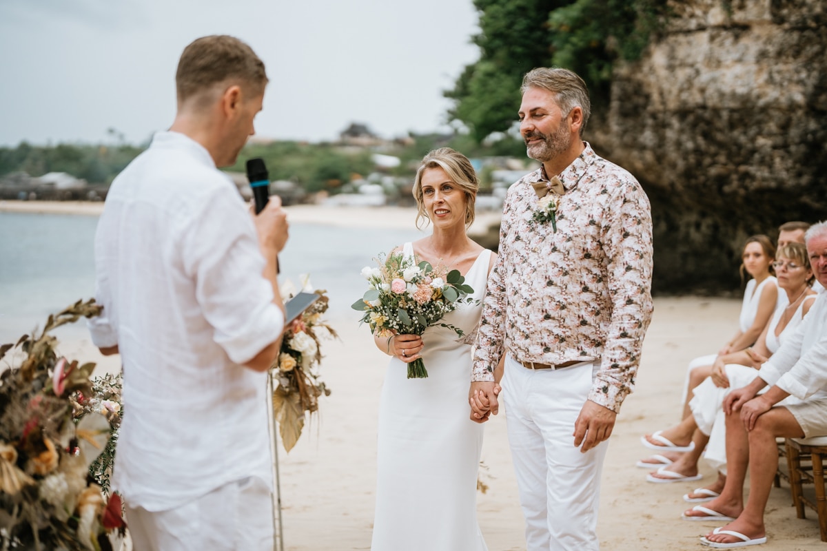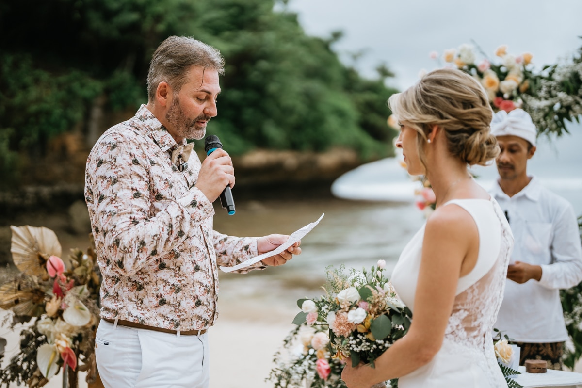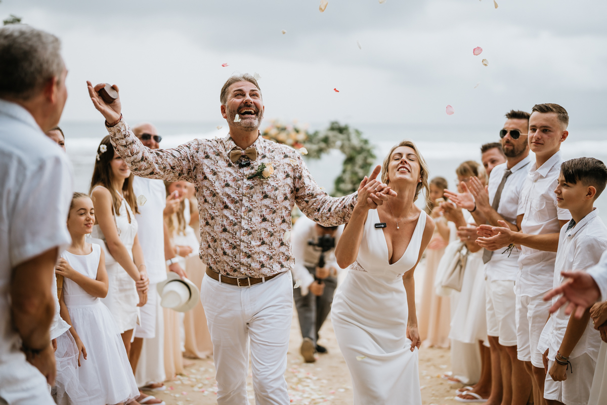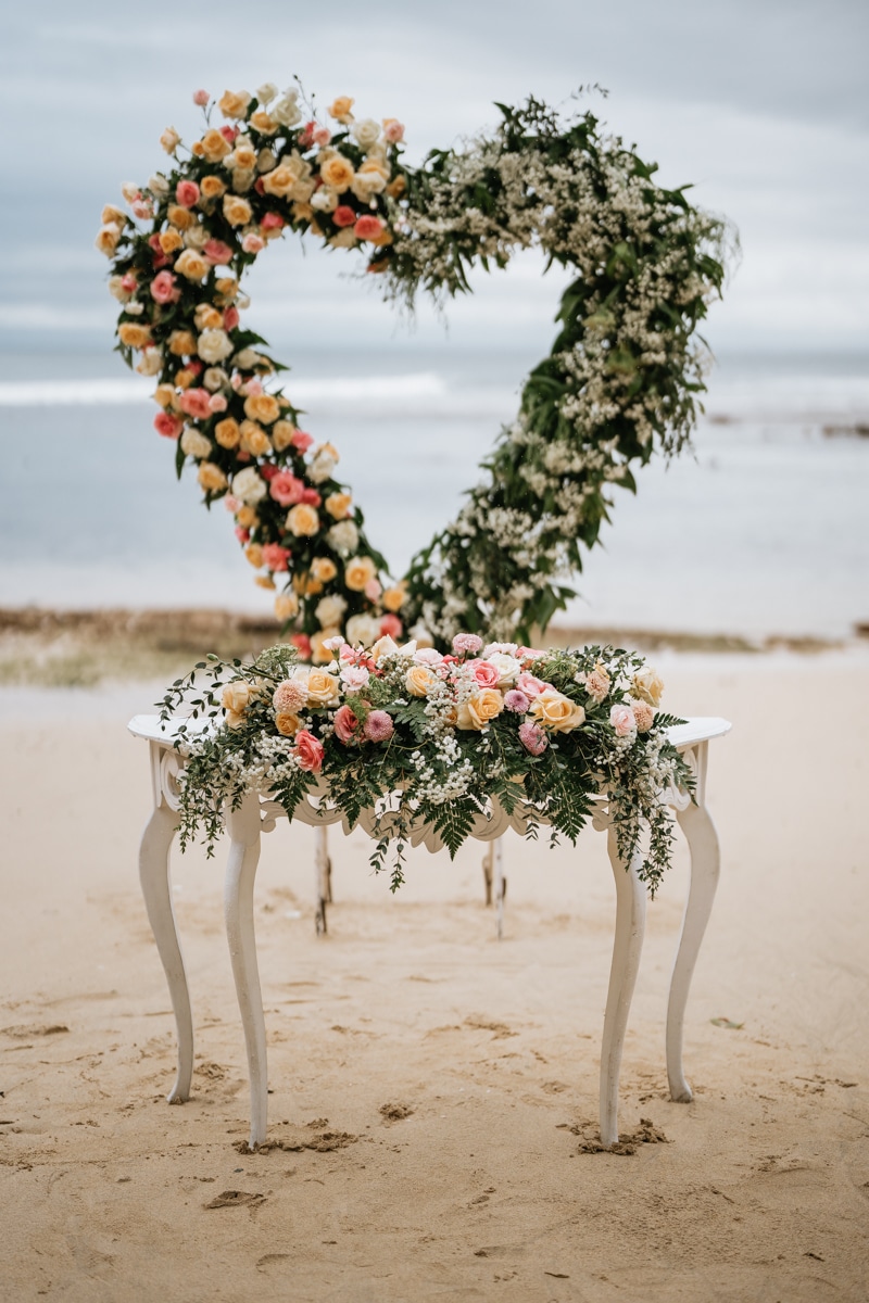 Une magnifique cérémonie avec la famille et les amis proches entre la plage de Balangan dans le sud de Bali suivi par un excellent diner dans une belle villa traditionnelle indonésienne.