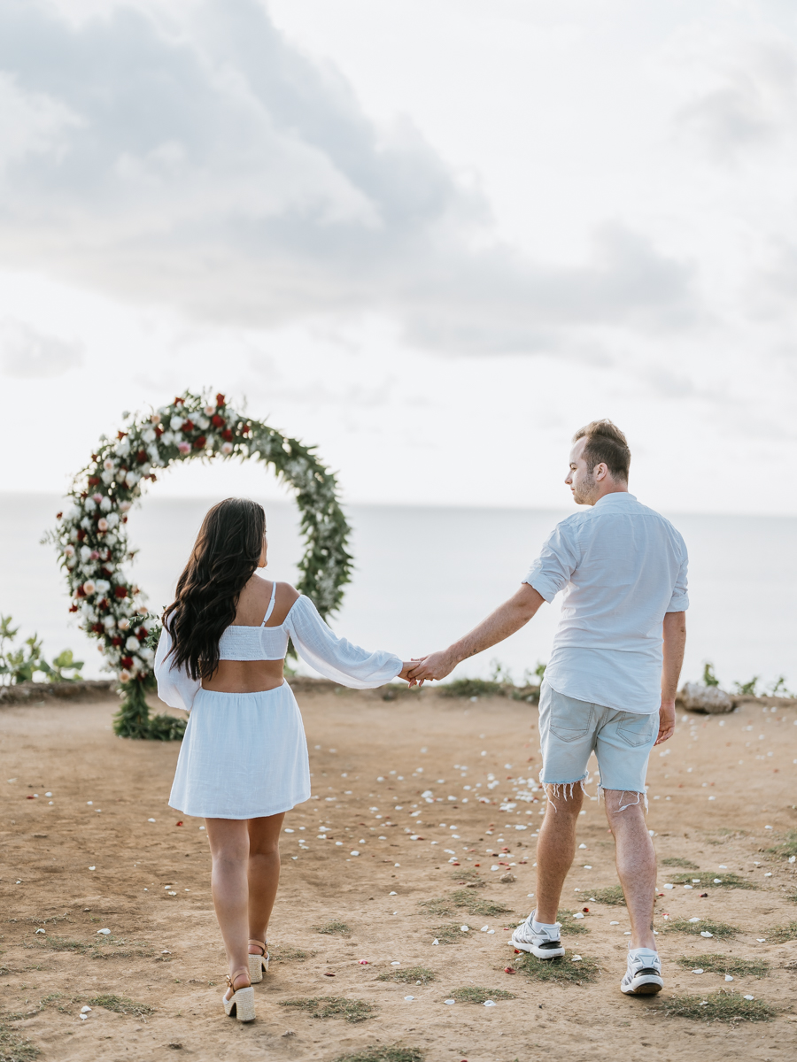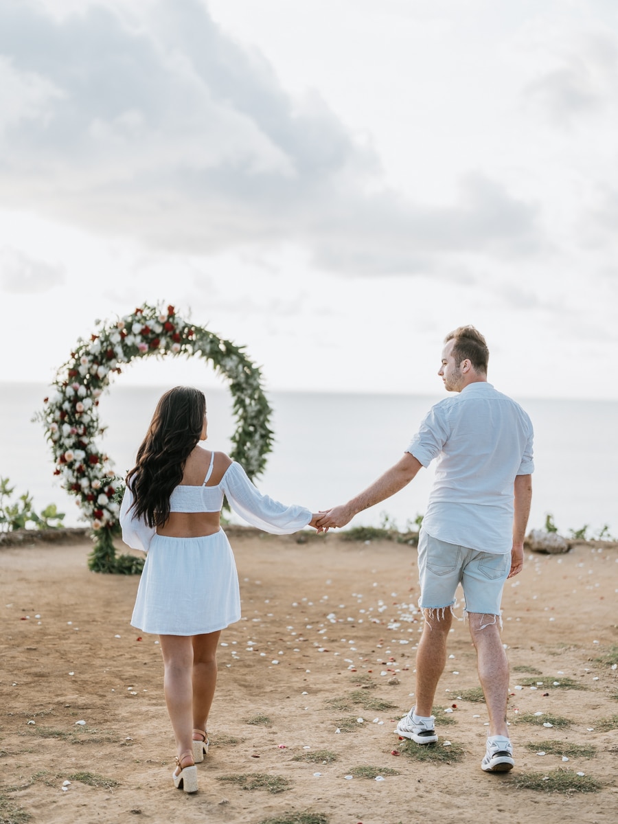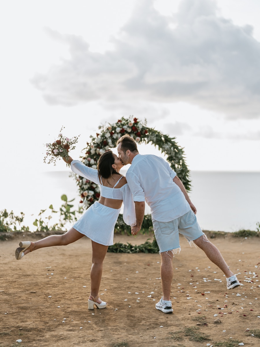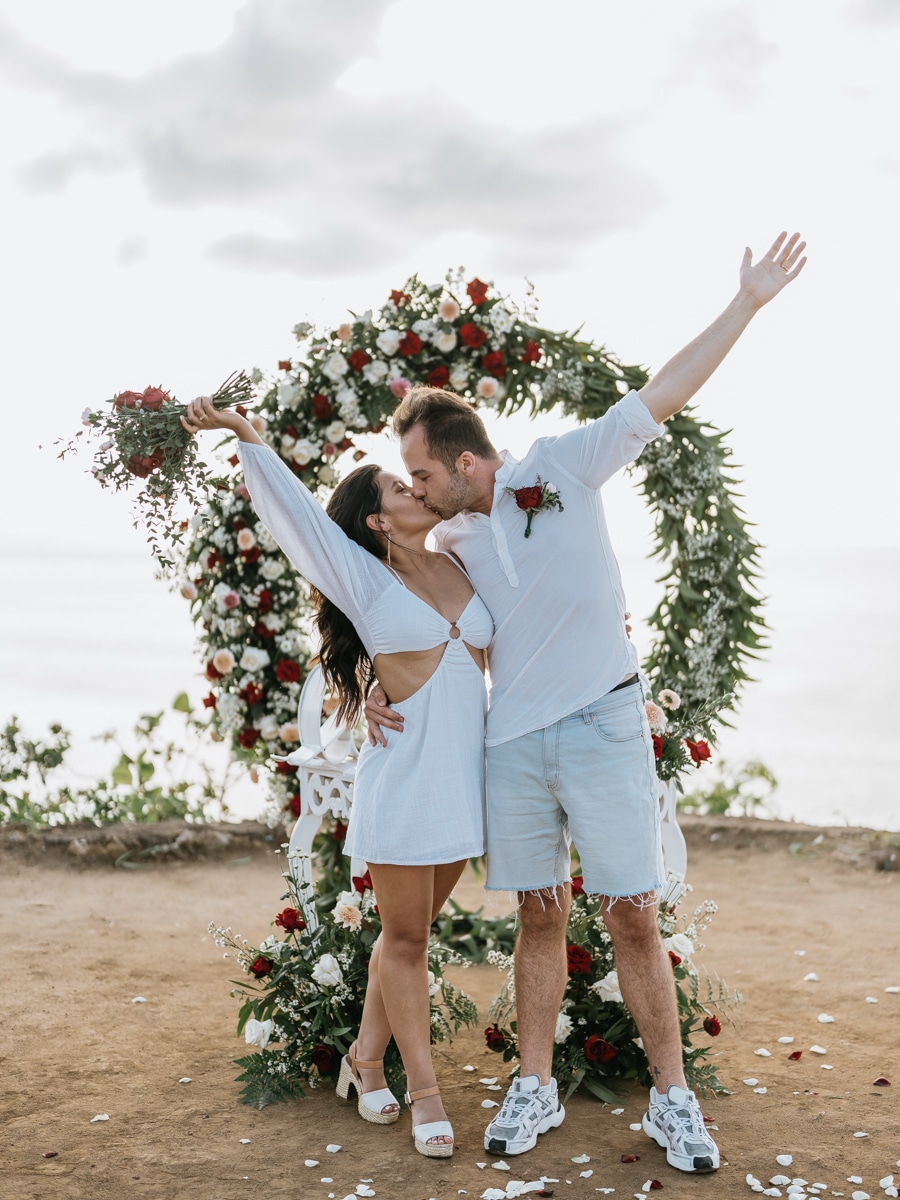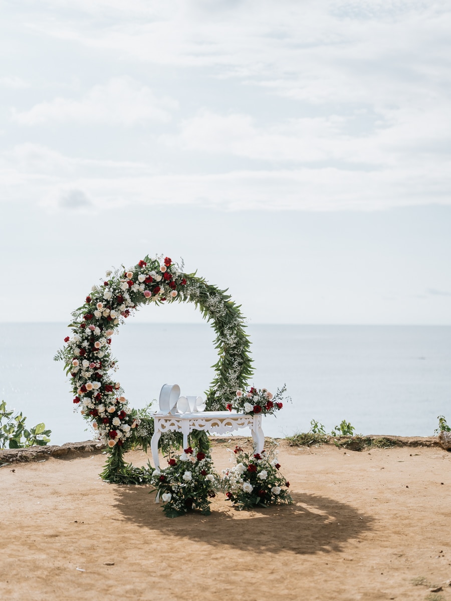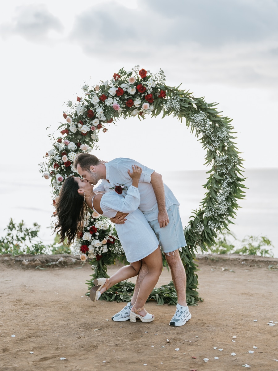 Dans l’intimité la plus totale, Karen et Mauricio se sont unis sans témoins ni invités, surplombant majestueusement les vagues déferlantes de l’océan Indien. La falaise, témoin silencieux de leur amour, a servi de toile de fond à une cérémonie empreinte de simplicité et de beauté brute. Les vœux échangés au son des vagues et sous le ciel balinais ont créé une atmosphère intime, reflétant la profondeur de l’engagement entre ces deux âmes liées par le destin.