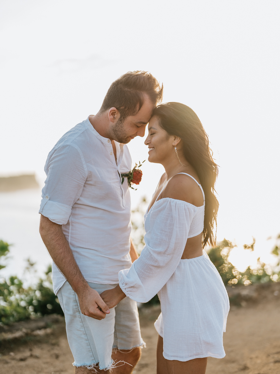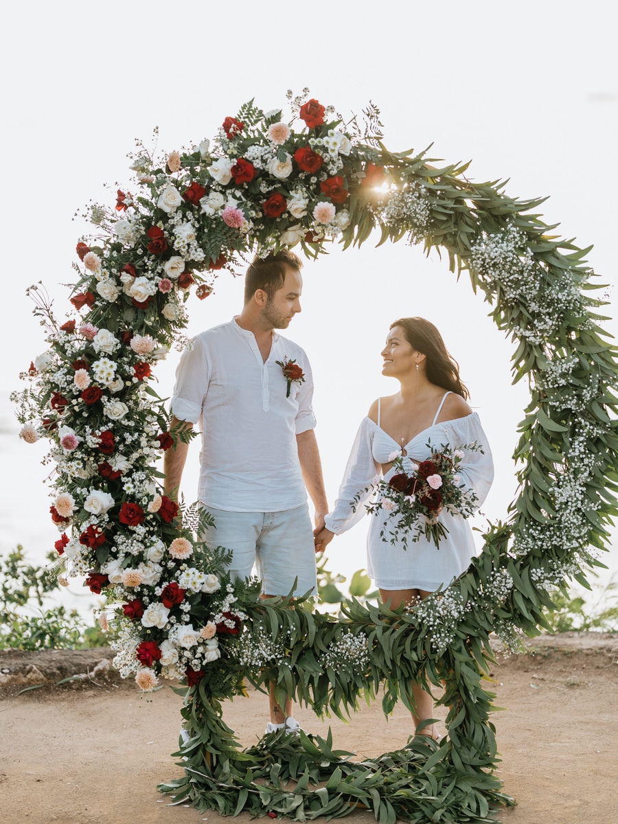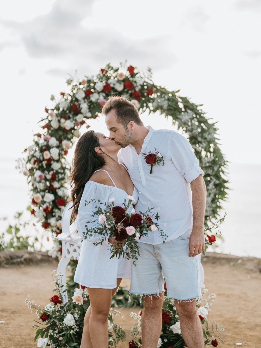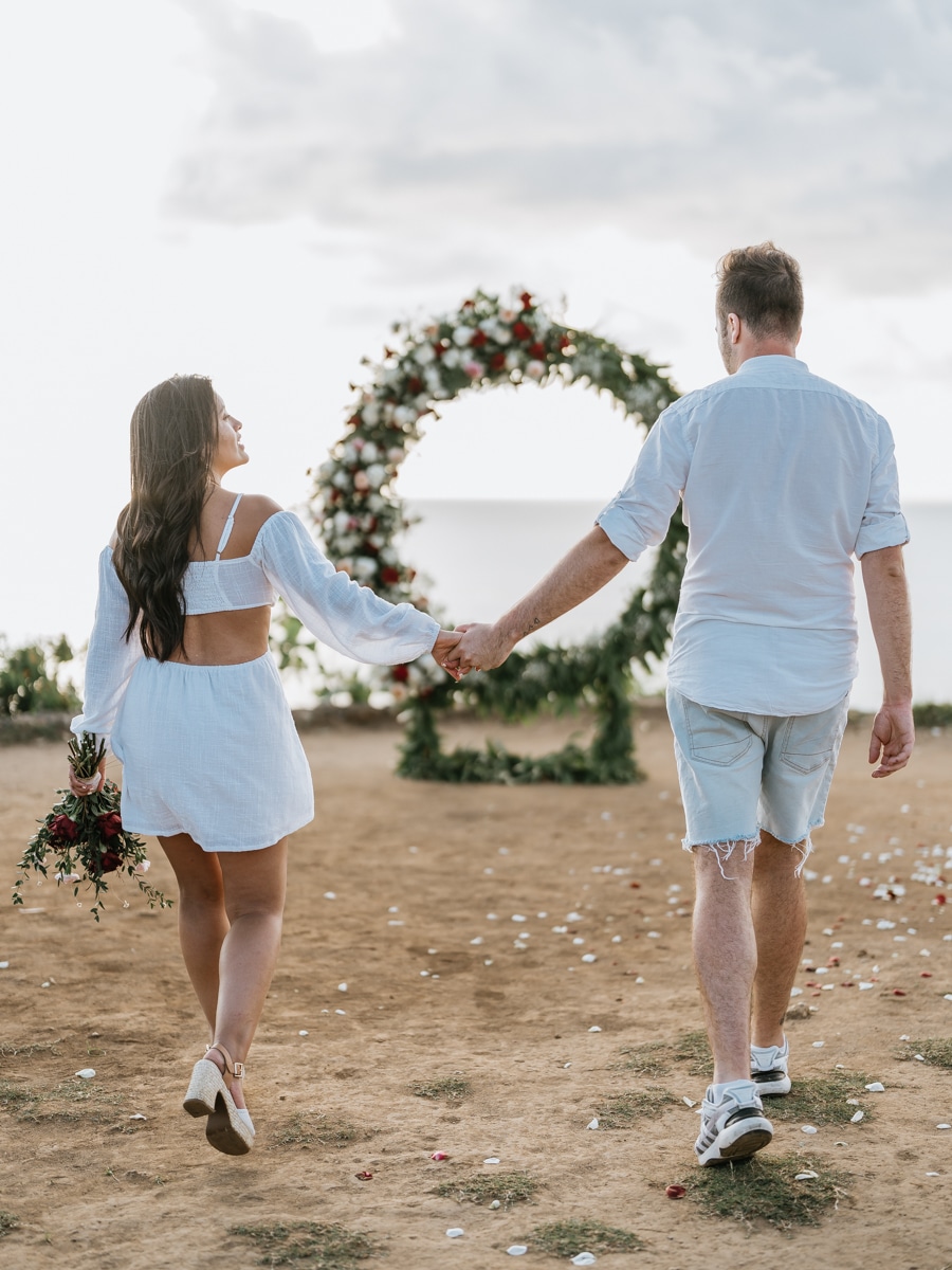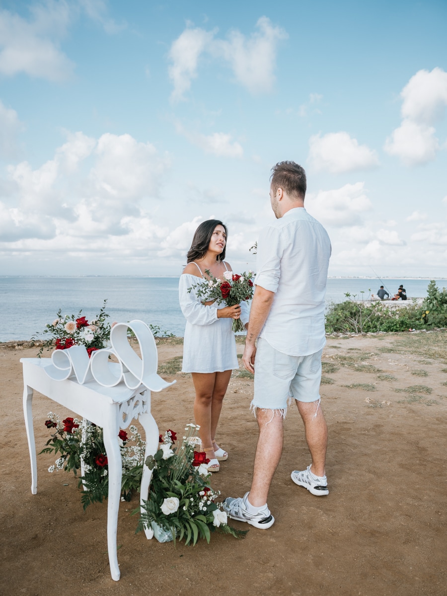 Dans l’intimité la plus totale, Karen et Mauricio se sont unis sans témoins ni invités, surplombant majestueusement les vagues déferlantes de l’océan Indien. La falaise, témoin silencieux de leur amour, a servi de toile de fond à une cérémonie empreinte de simplicité et de beauté brute. Les vœux échangés au son des vagues et sous le ciel balinais ont créé une atmosphère intime, reflétant la profondeur de l’engagement entre ces deux âmes liées par le destin.