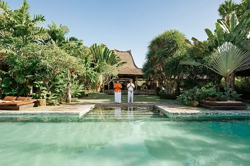 Pour un mariage, la Villa Asli impose une atmosphère chaleureuse et spirituelle. Les jardins tropicaux matures et les pavillons ouverts créent un décor naturel qui nécessite peu d’artifices. C’est le choix parfait pour les couples qui veulent une cérémonie intime, entourés de bois sculptés à la main et d’une végétation dense, tout en gardant un accès facile aux quartiers animés de Seminyak et Canggu. »