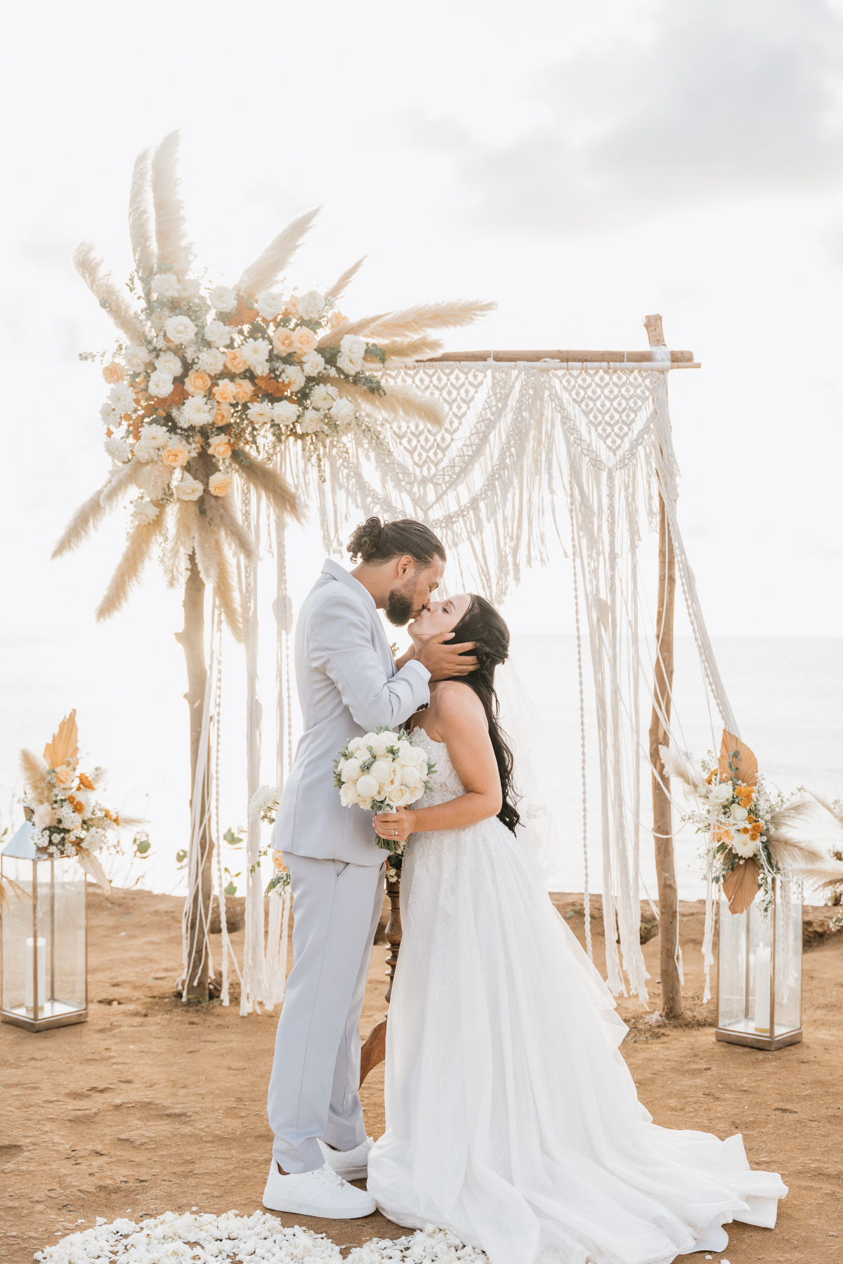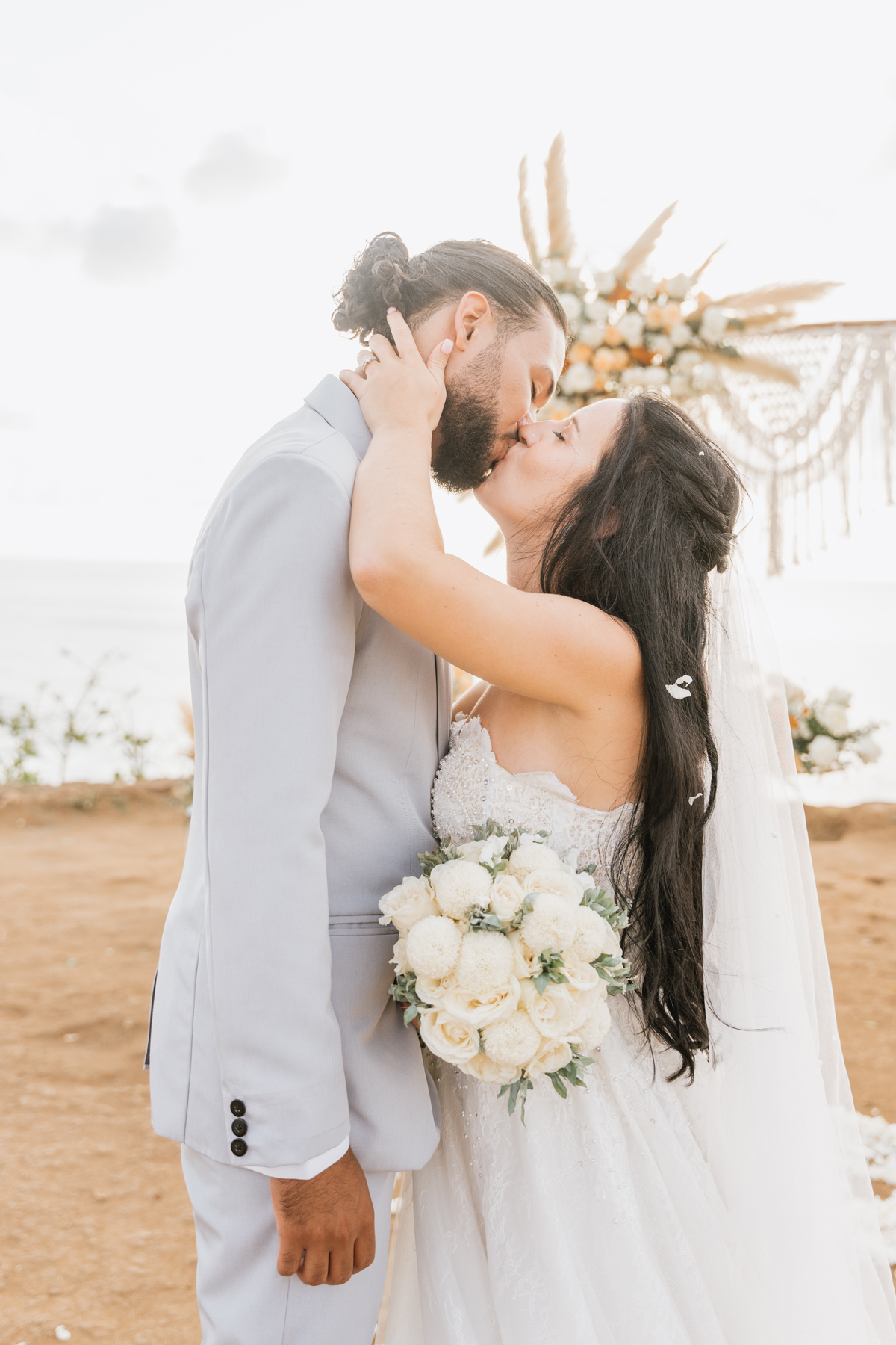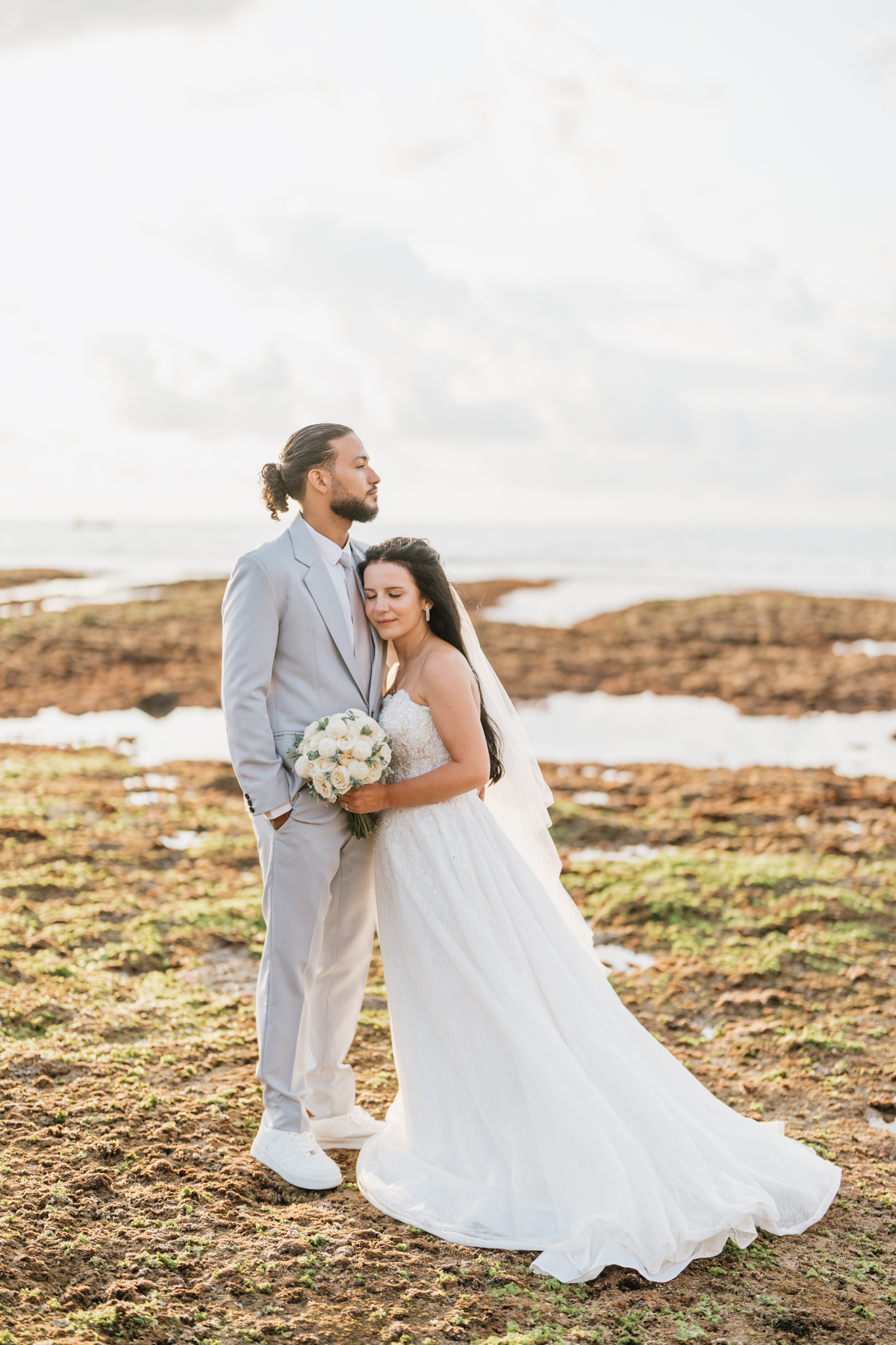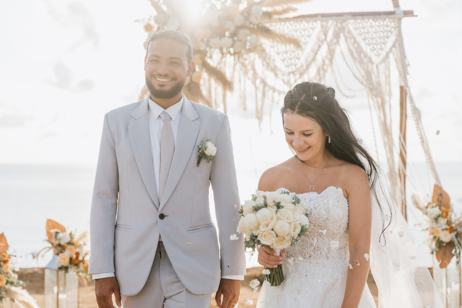 Après la cérémonie, les nouveaux mariés ont pu immortaliser leur amour au cours d’une séance photo sur une plage voisine, alors que le soleil se couchait à l’horizon, teintant le ciel de couleurs dorées et rosées. La lumière douce du crépuscule a offert un cadre idéal pour des photos inoubliables, capturant l’essence et la beauté de leur amour.