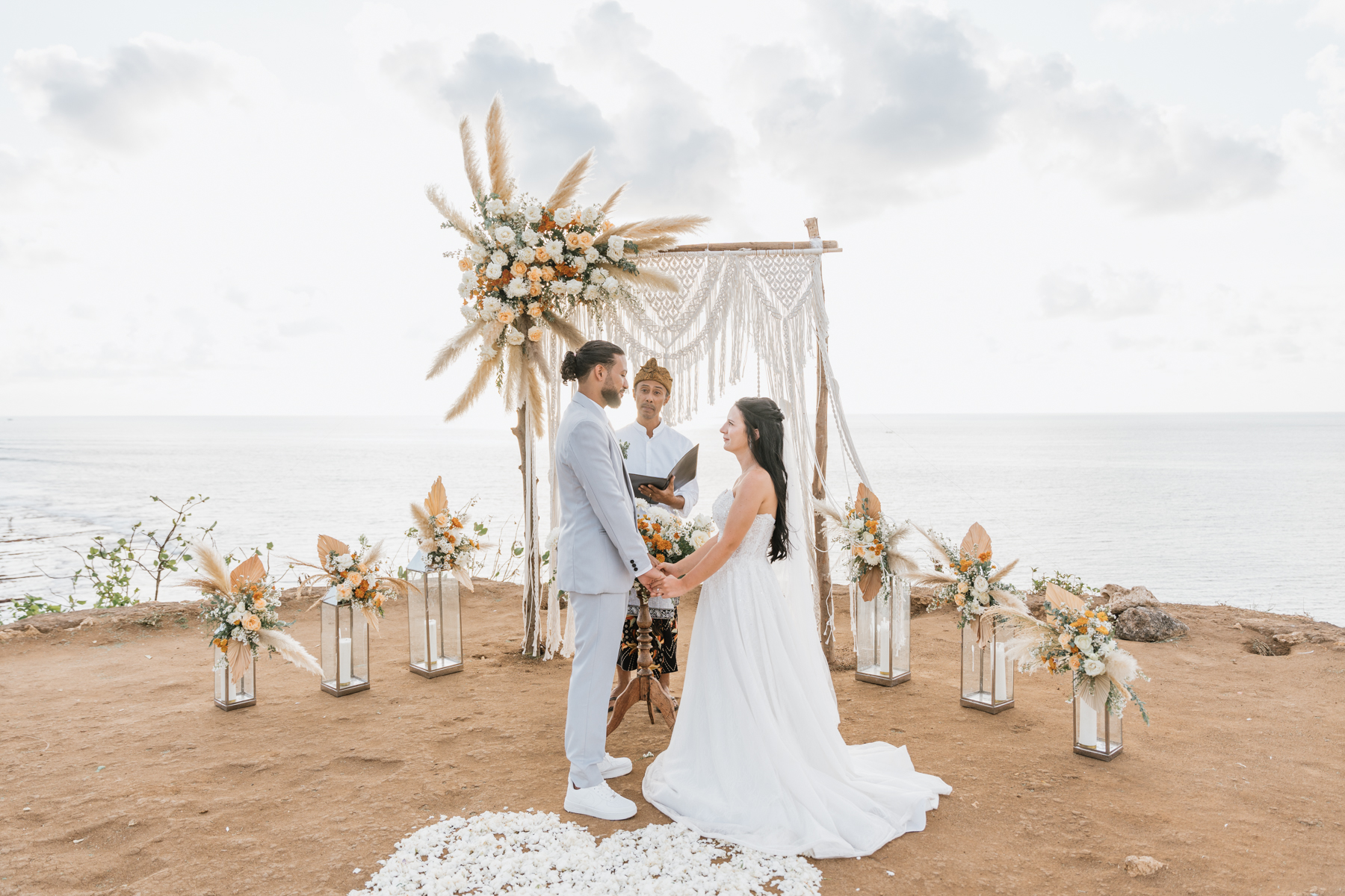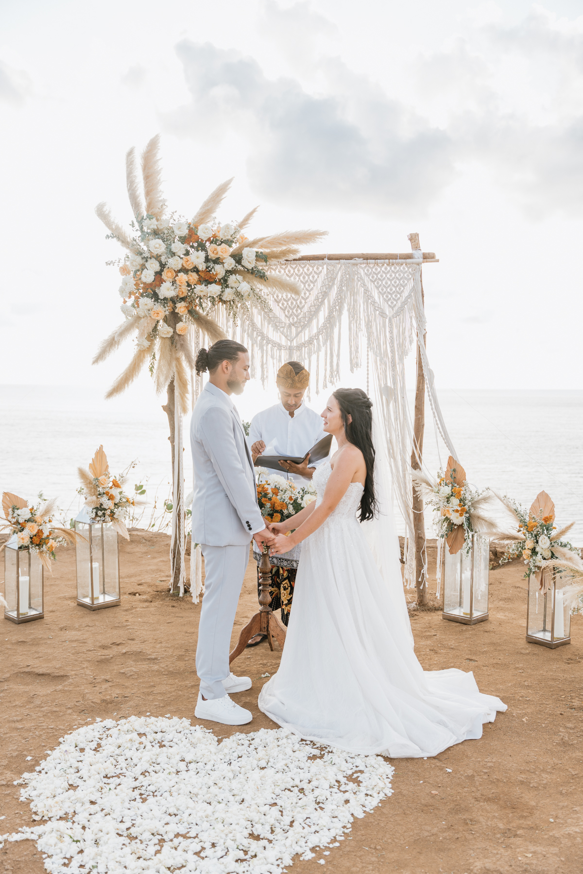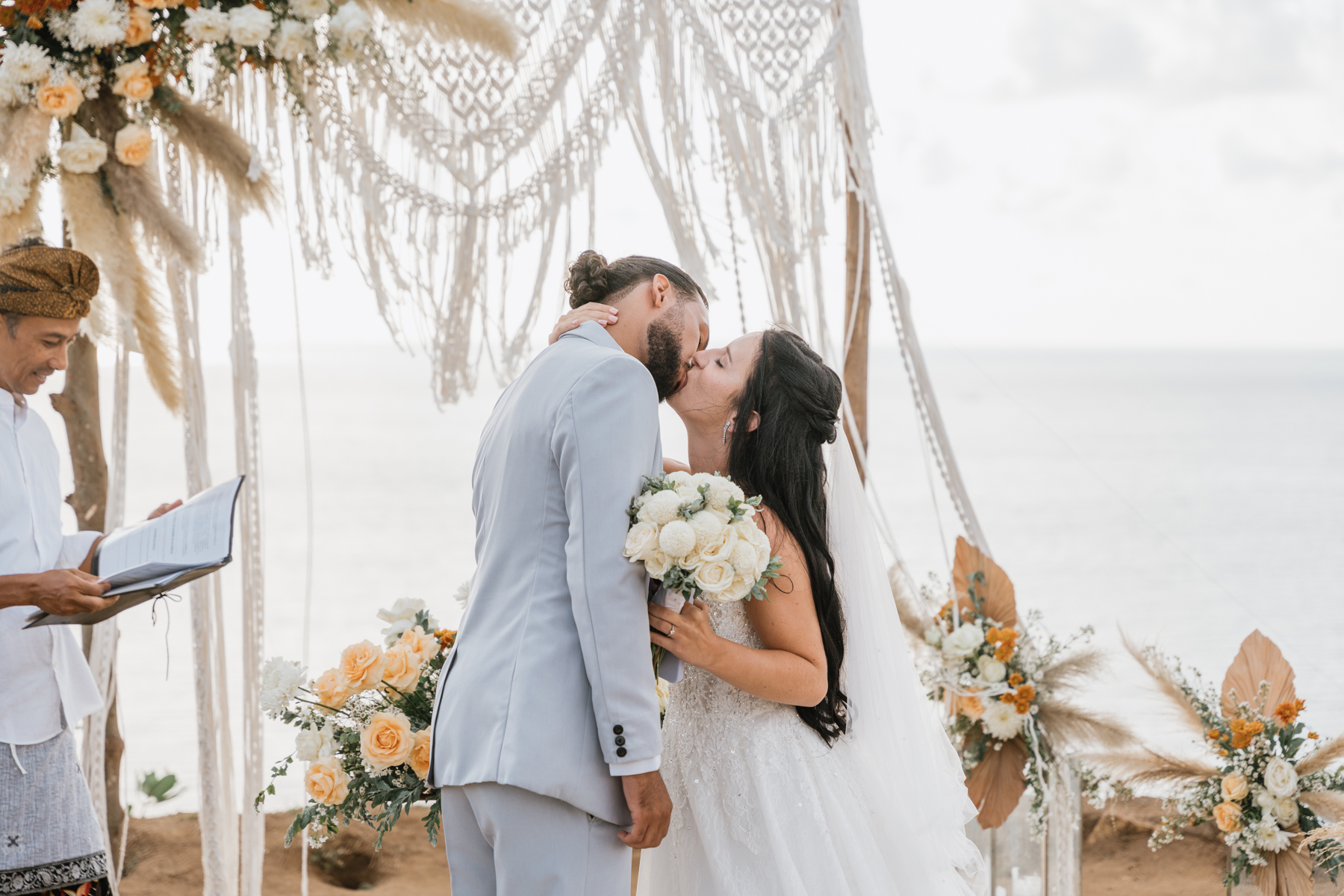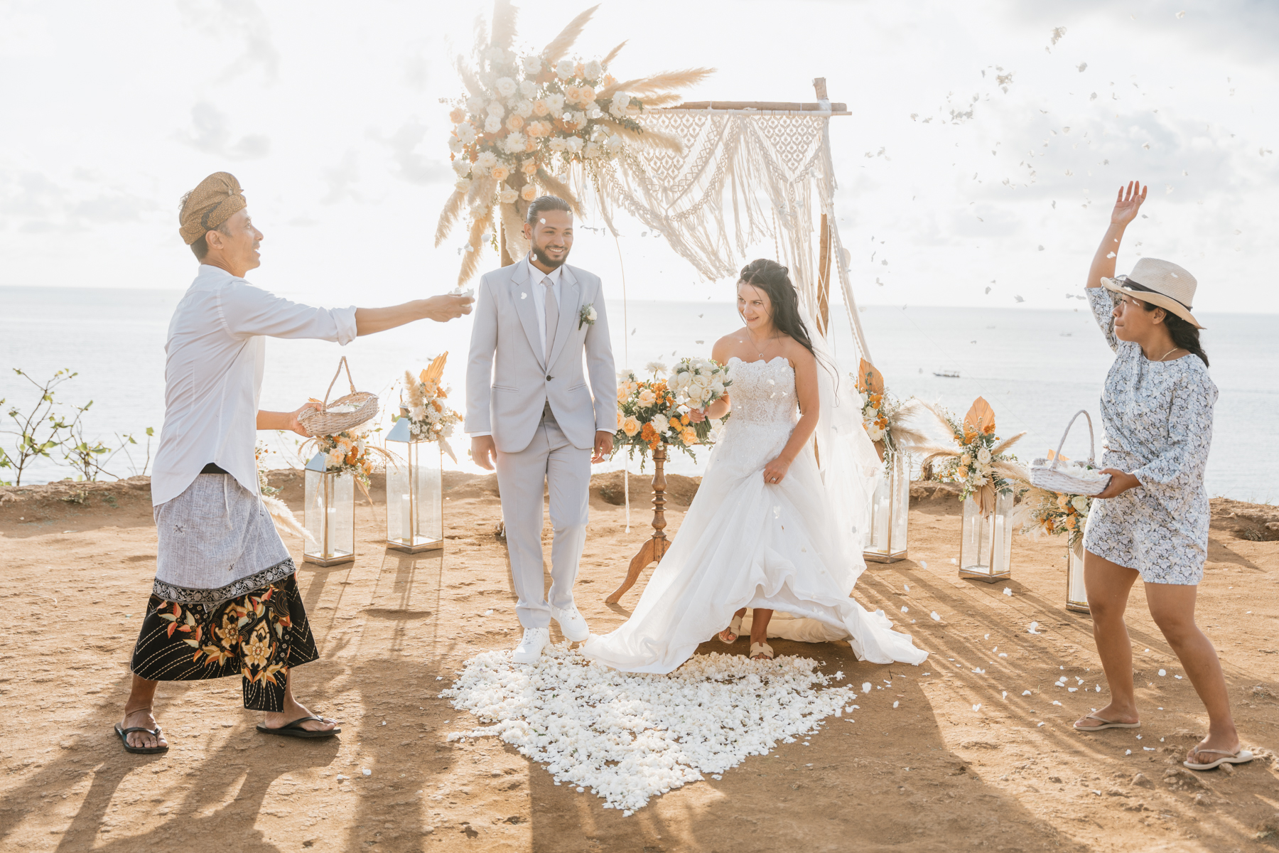 Estelle et Hamza ont ensuite été conduits en voiture privée jusqu’à leur lieu de cérémonie, une falaise majestueuse d’Uluwatu offrant une vue imprenable sur la mer. Là, sous un ciel bleu infini, ils ont échangé leurs vœux et leurs alliances. La cérémonie s’est déroulée en français, grâce à la présence d’un officiant indonésien parfaitement francophone, ajoutant une touche d’authenticité et de proximité à ce moment.