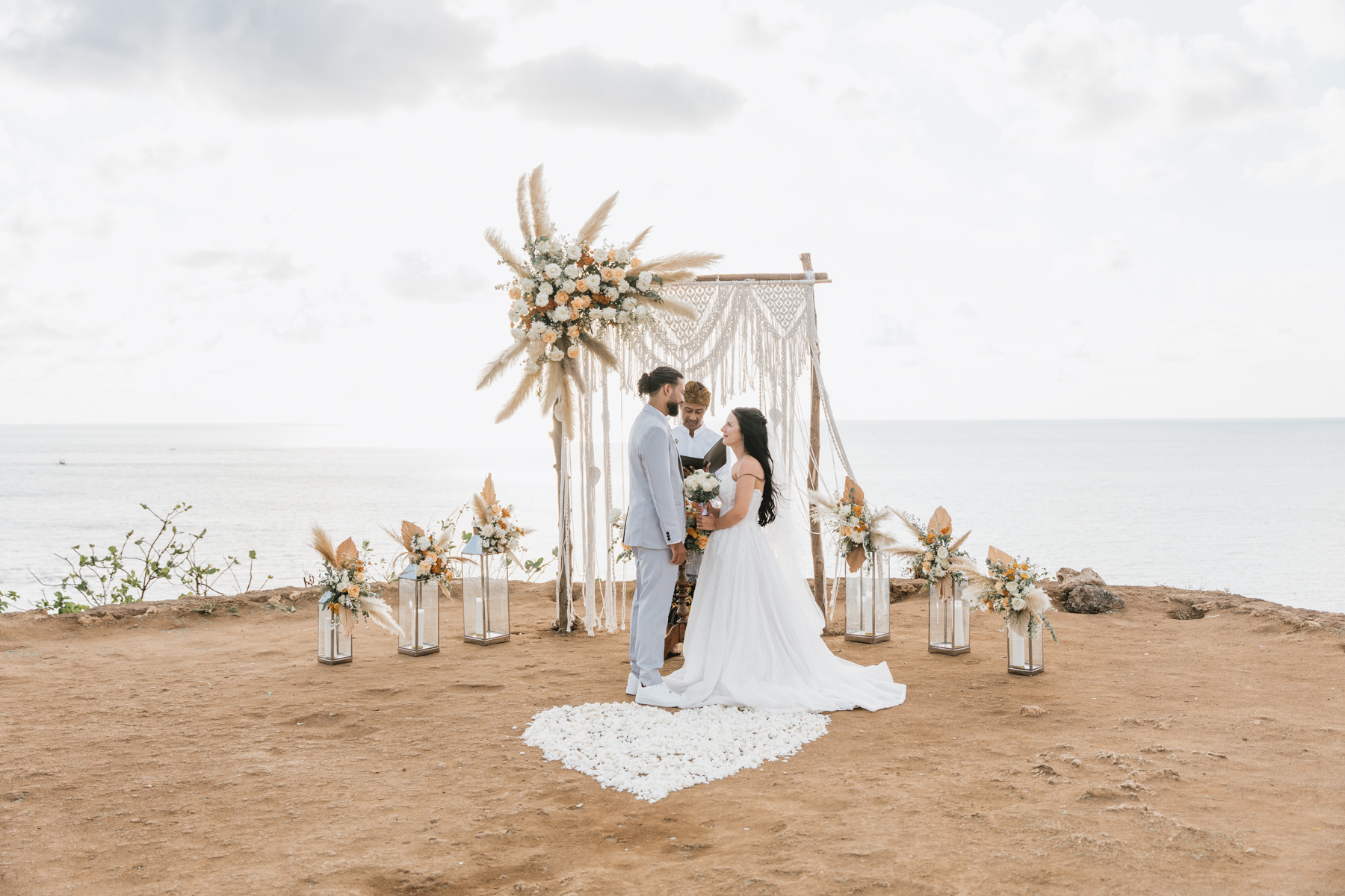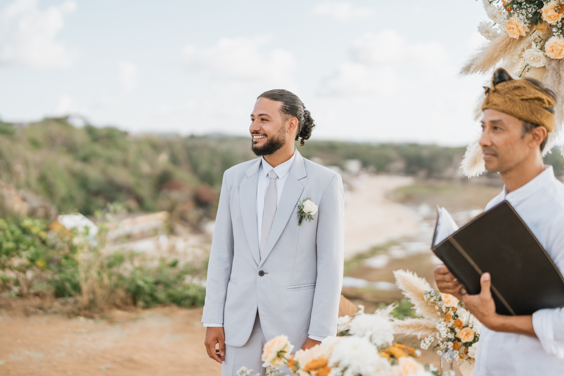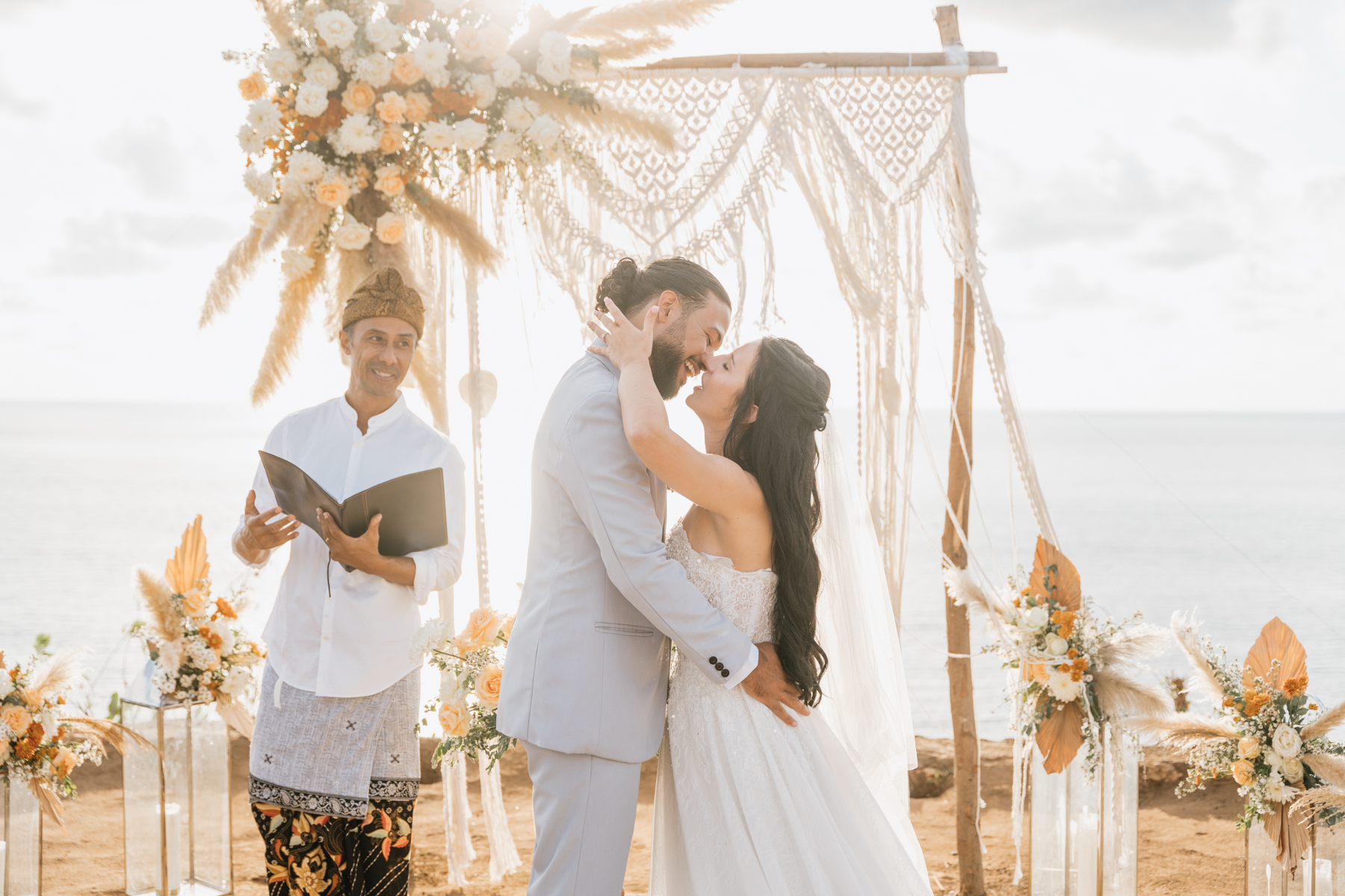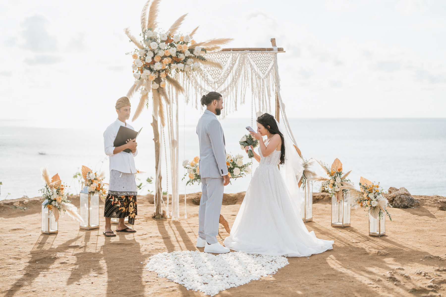 Estelle et Hamza ont ensuite été conduits en voiture privée jusqu’à leur lieu de cérémonie, une falaise majestueuse d’Uluwatu offrant une vue imprenable sur la mer. Là, sous un ciel bleu infini, ils ont échangé leurs vœux et leurs alliances. La cérémonie s’est déroulée en français, grâce à la présence d’un officiant indonésien parfaitement francophone, ajoutant une touche d’authenticité et de proximité à ce moment.