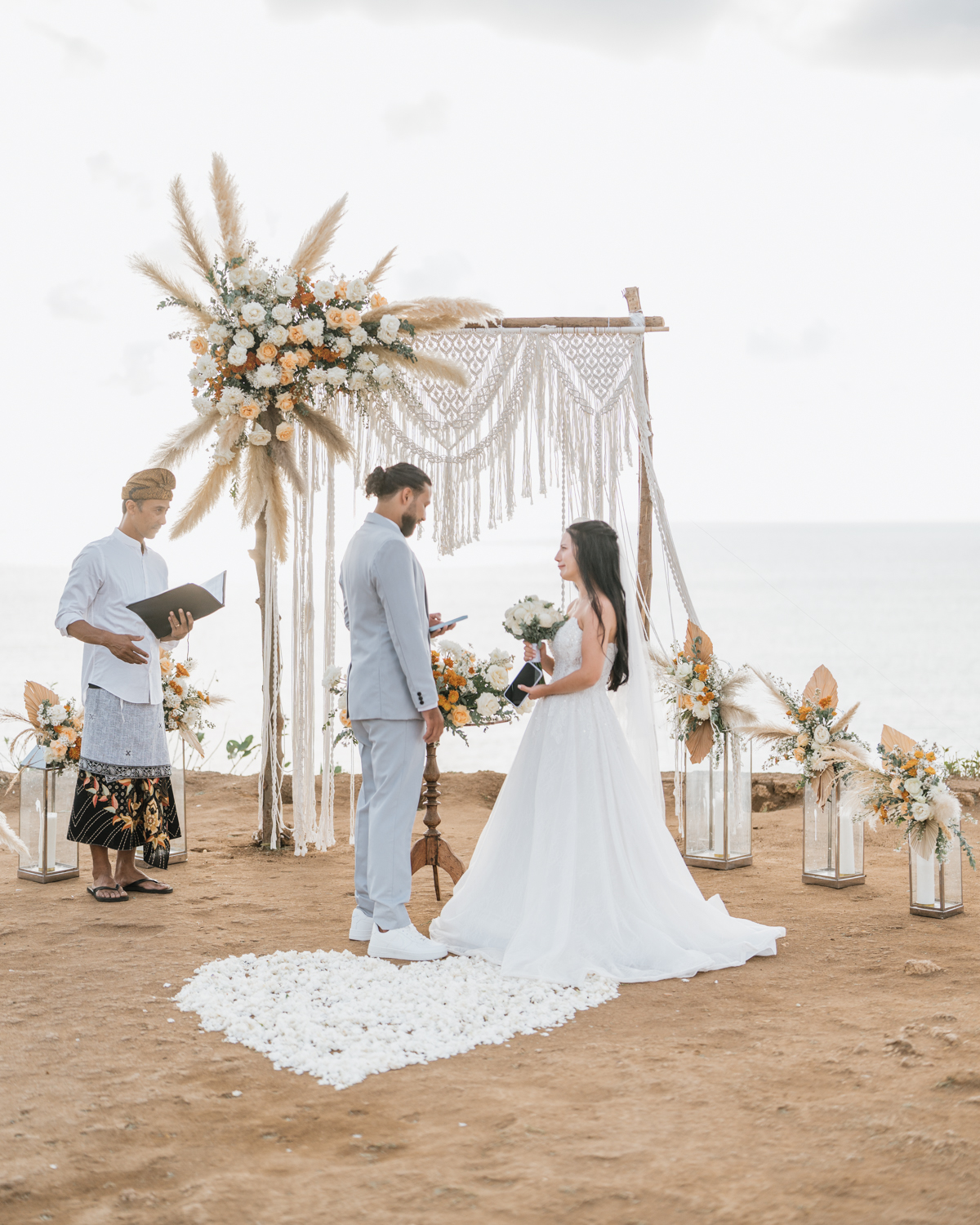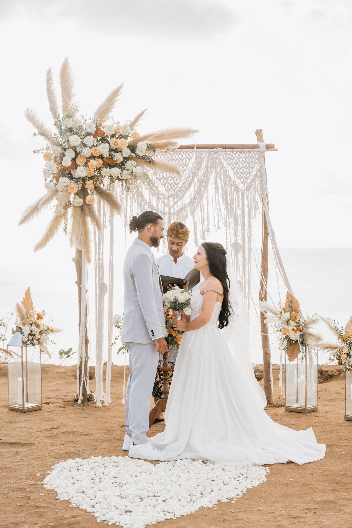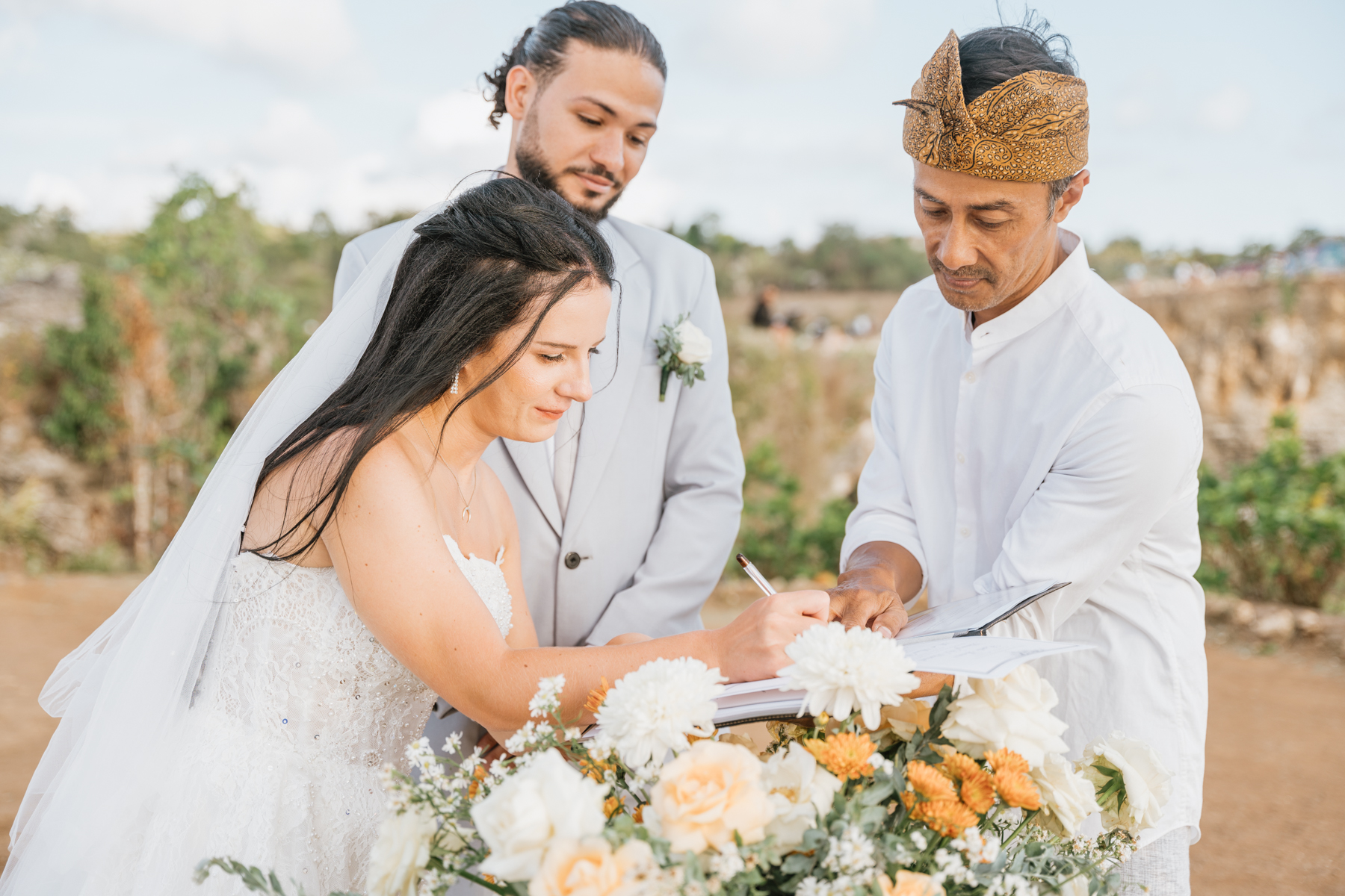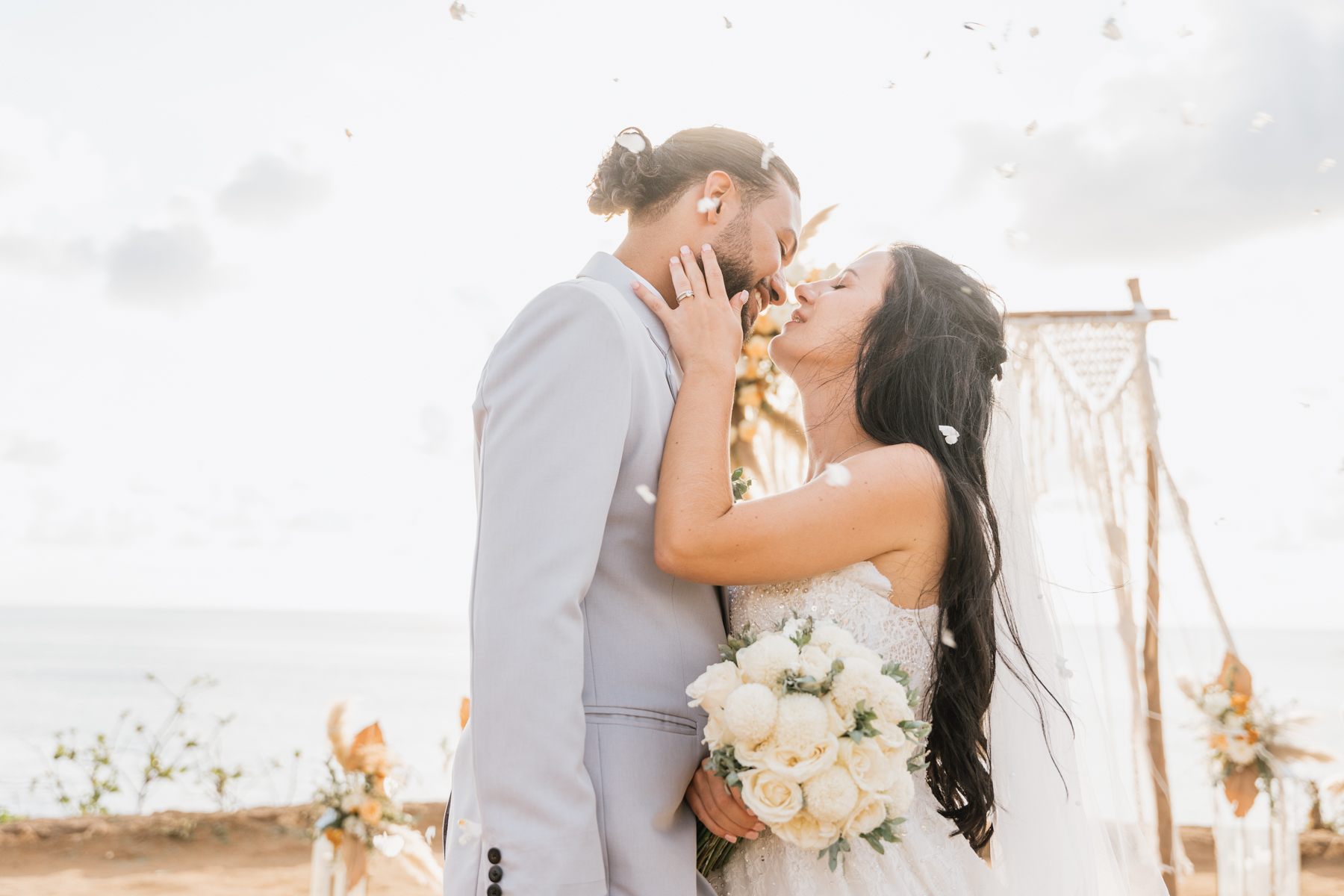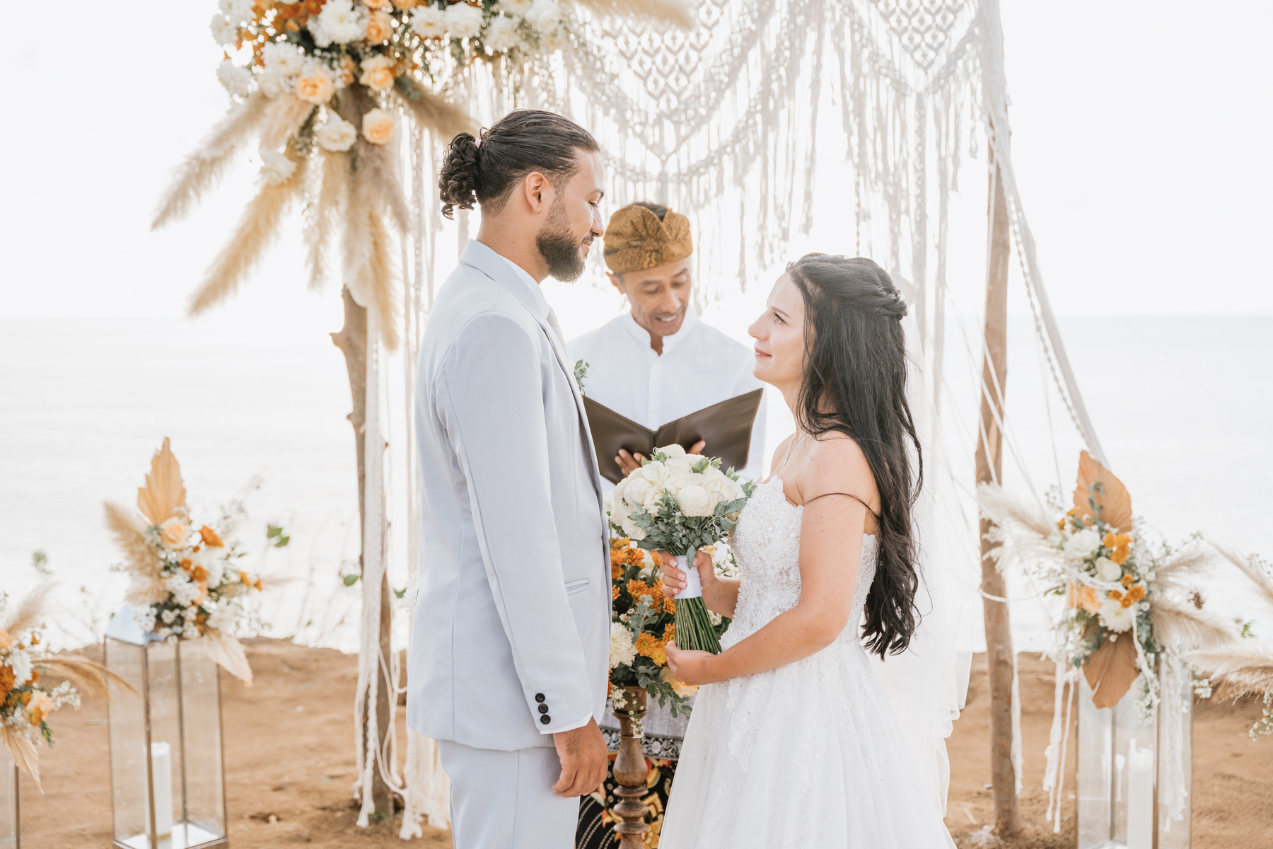 Estelle et Hamza ont ensuite été conduits en voiture privée jusqu’à leur lieu de cérémonie, une falaise majestueuse d’Uluwatu offrant une vue imprenable sur la mer. Là, sous un ciel bleu infini, ils ont échangé leurs vœux et leurs alliances. La cérémonie s’est déroulée en français, grâce à la présence d’un officiant indonésien parfaitement francophone, ajoutant une touche d’authenticité et de proximité à ce moment.