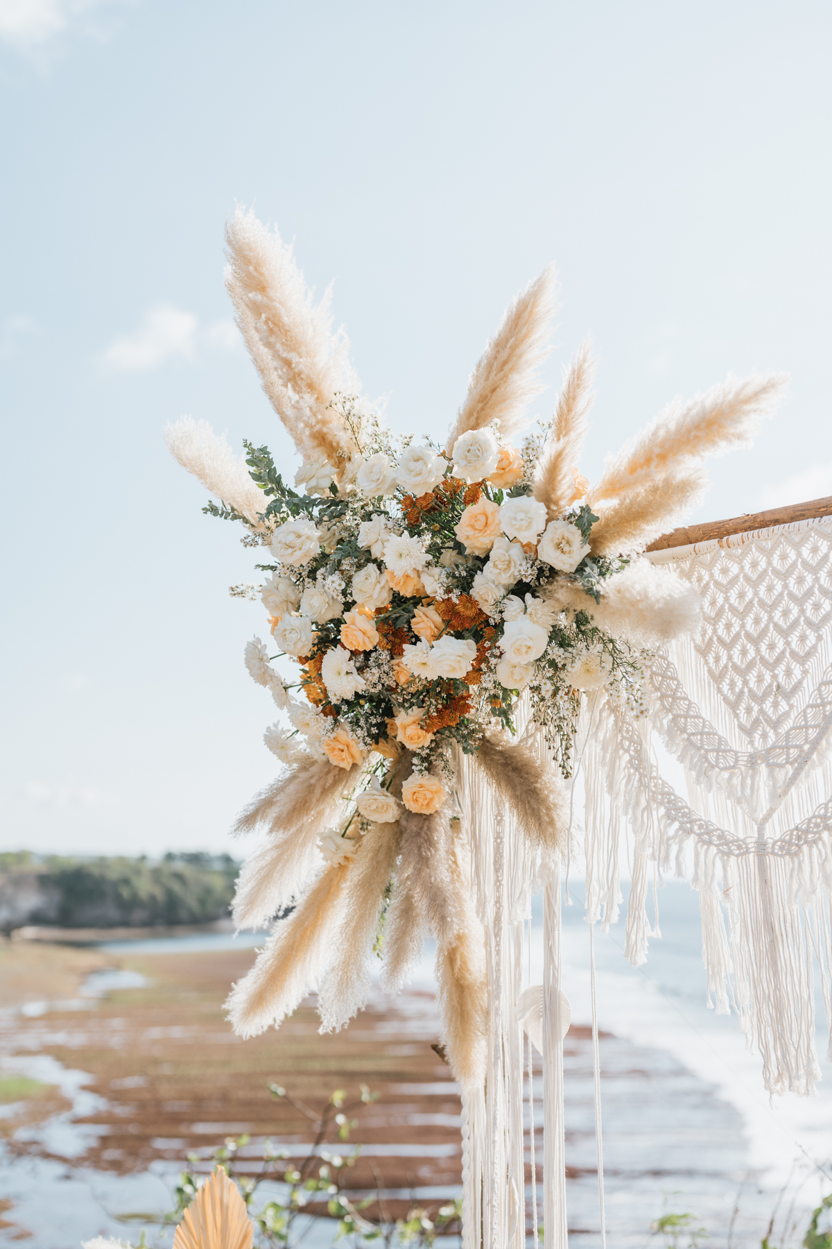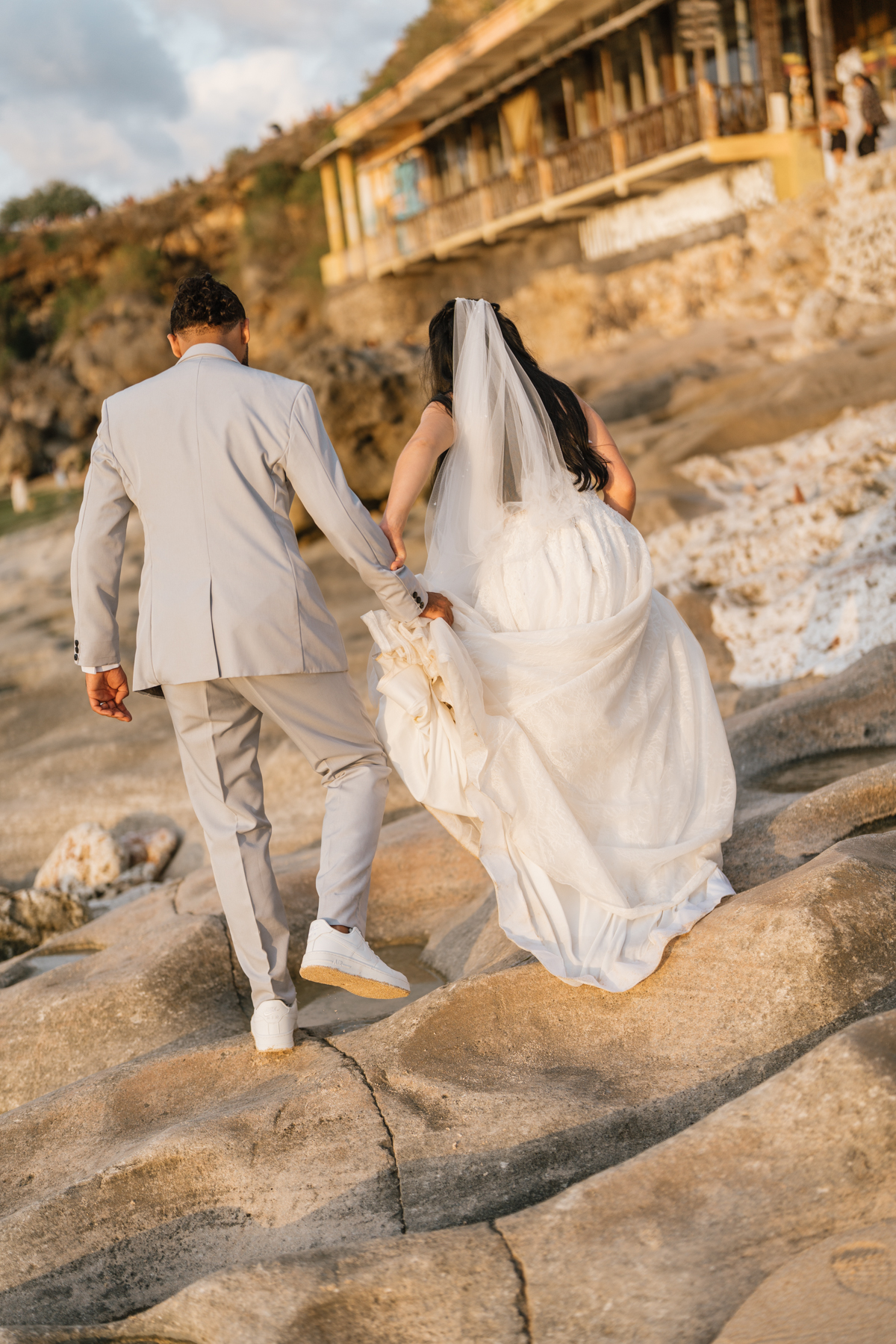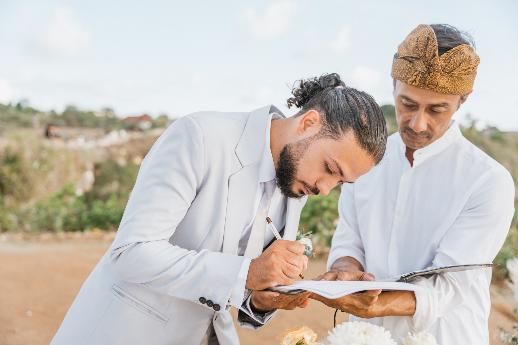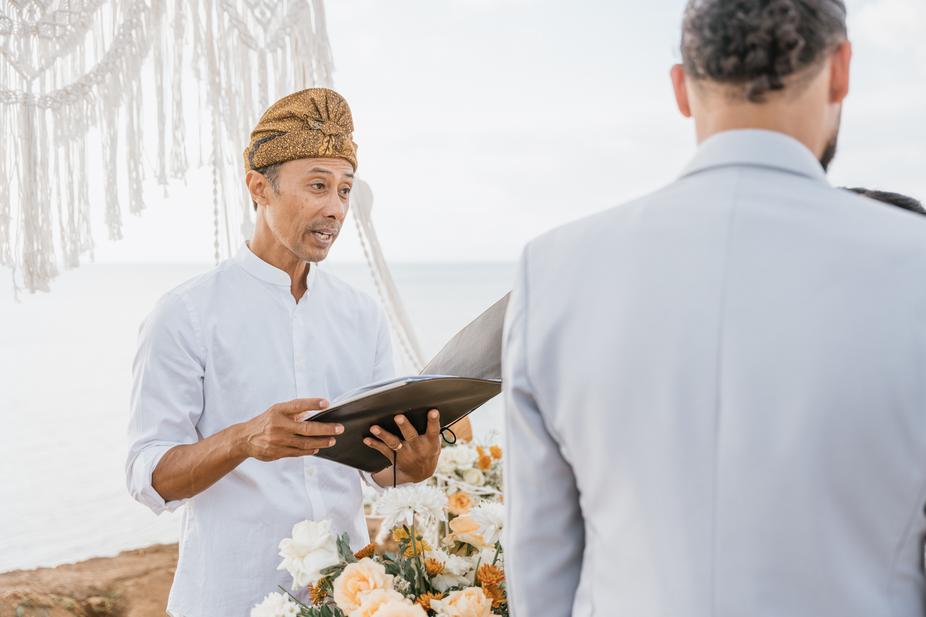 Estelle et Hamza ont ensuite été conduits en voiture privée jusqu’à leur lieu de cérémonie, une falaise majestueuse d’Uluwatu offrant une vue imprenable sur la mer. Là, sous un ciel bleu infini, ils ont échangé leurs vœux et leurs alliances. La cérémonie s’est déroulée en français, grâce à la présence d’un officiant indonésien parfaitement francophone, ajoutant une touche d’authenticité et de proximité à ce moment.