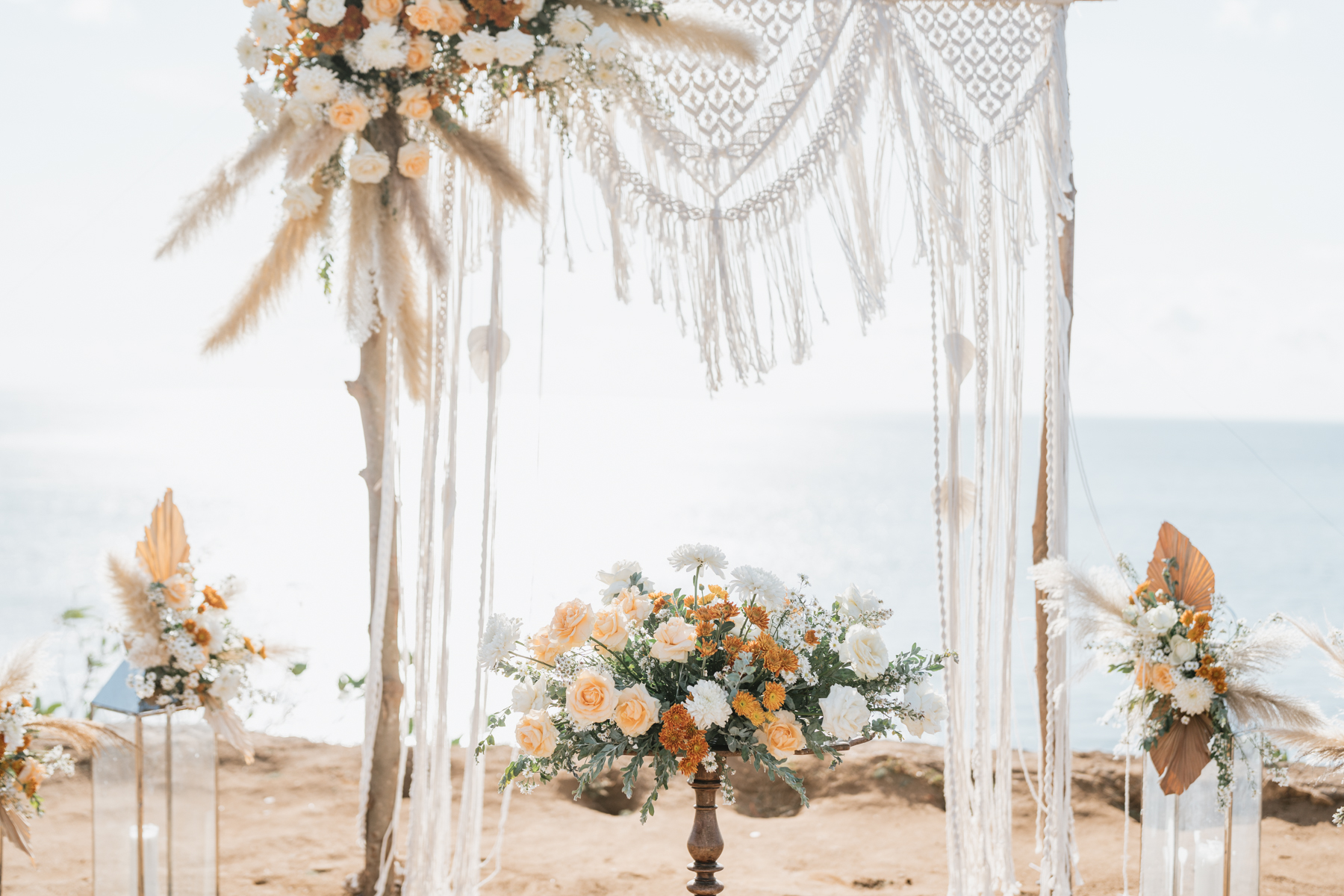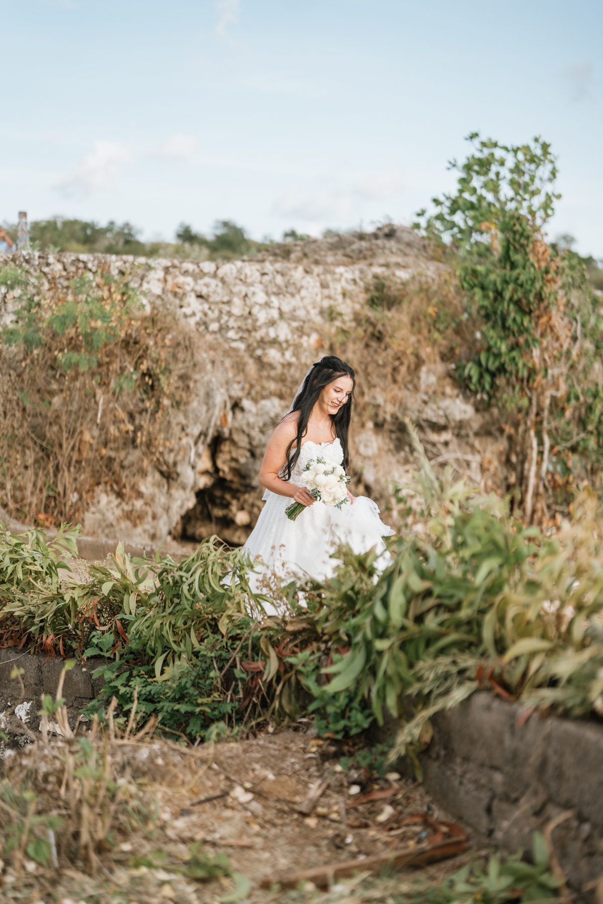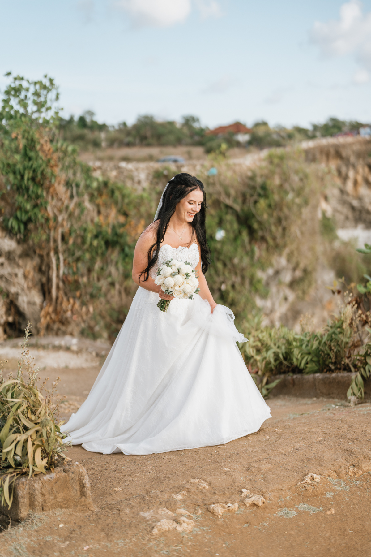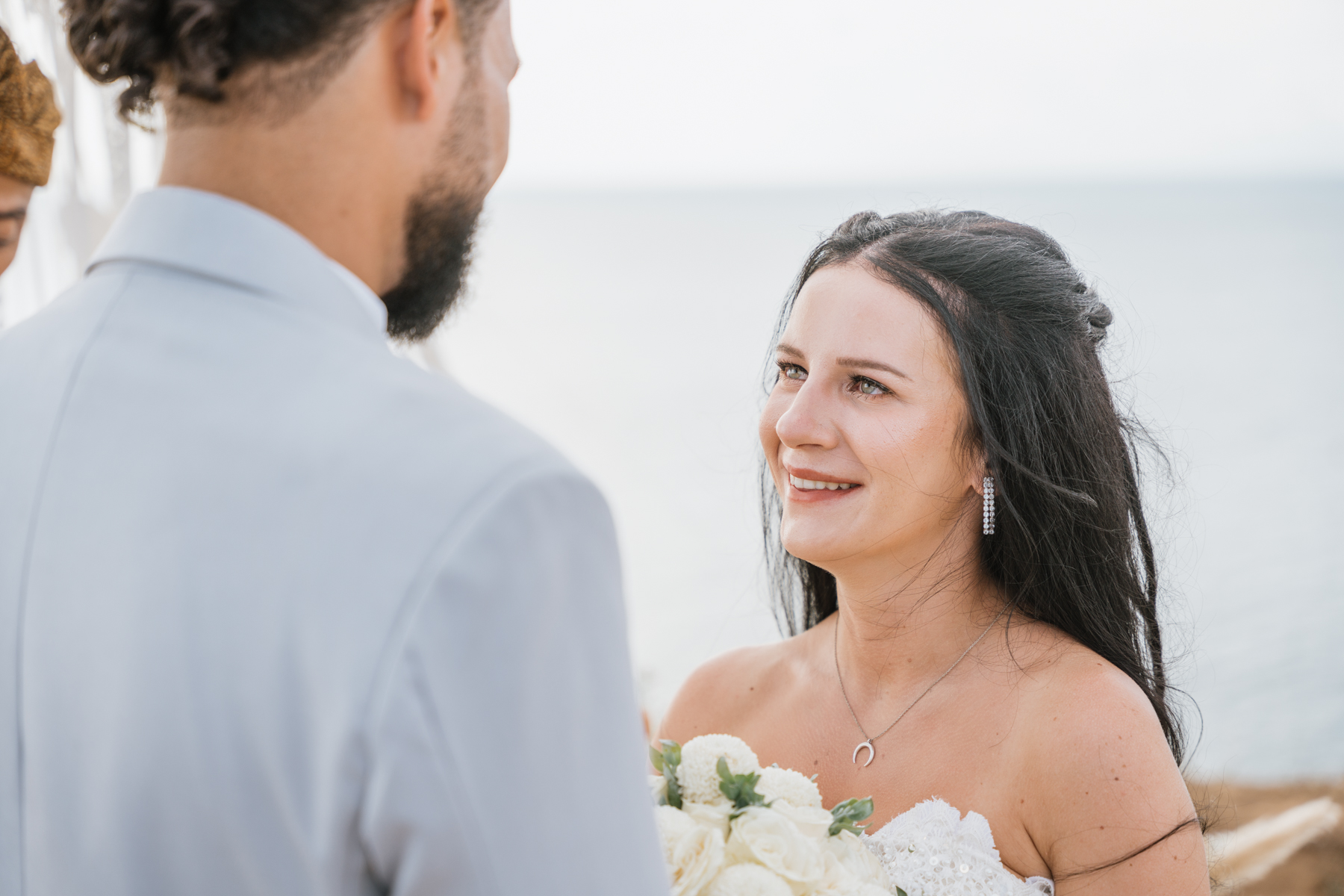 Estelle et Hamza ont ensuite été conduits en voiture privée jusqu’à leur lieu de cérémonie, une falaise majestueuse d’Uluwatu offrant une vue imprenable sur la mer. Là, sous un ciel bleu infini, ils ont échangé leurs vœux et leurs alliances. La cérémonie s’est déroulée en français, grâce à la présence d’un officiant indonésien parfaitement francophone, ajoutant une touche d’authenticité et de proximité à ce moment.
